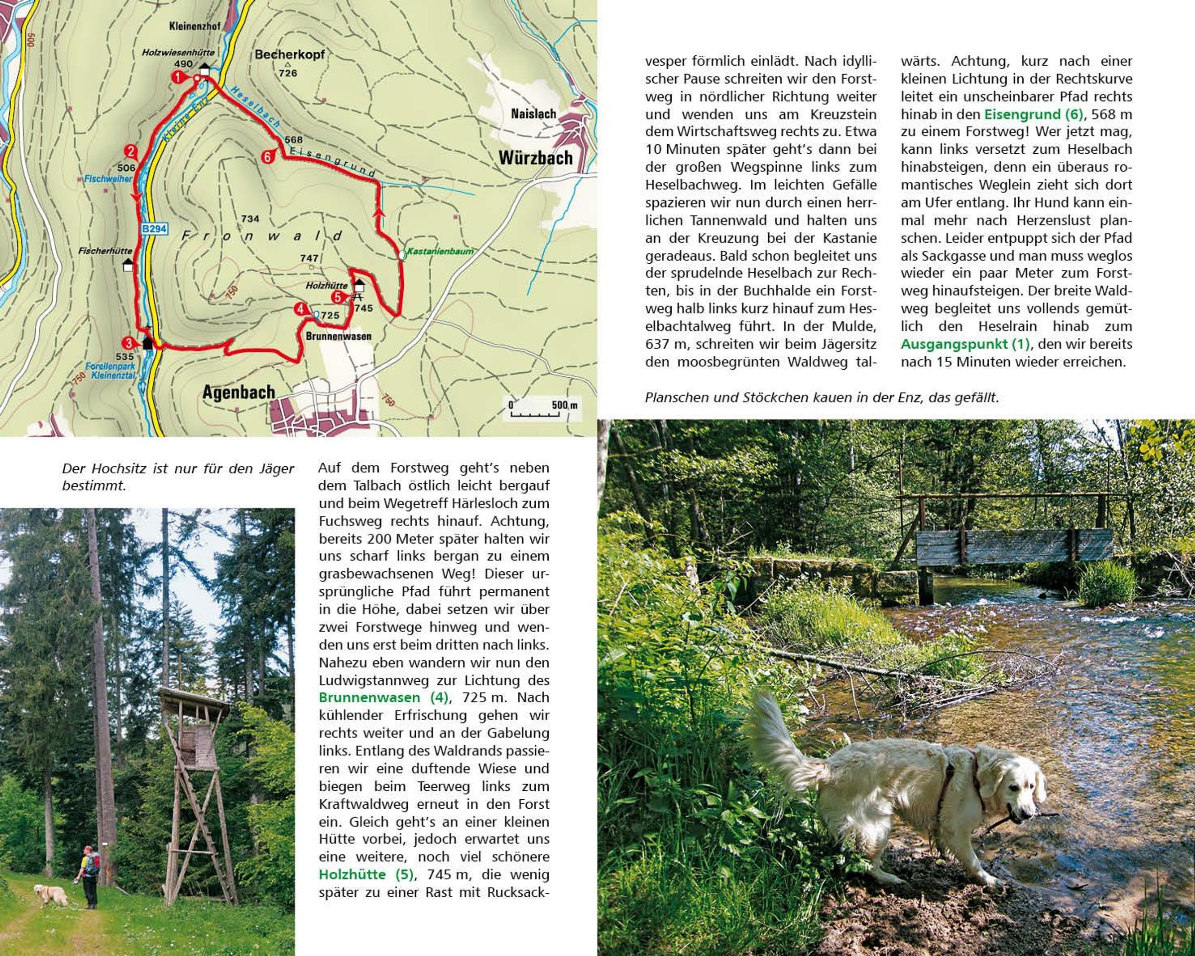 Das Buch stellt 42 hundegeeignete Touren vor - in verschiedenen Schwierigkeitsstufen und mit Hinweisen auf spezielle Anforderungen, die der Hund erfüllen sollte. Dazu gibt es viele Tipps zur entsprechenden Ausrüstung, zum Training, zur Erziehung, zur Gefahrenprävention und zum Umgang mit Notfällen. Die Wanderungen führen in alle Regionen des Schwarzwalds zwischen Kraichgau und Hochrhein. So geht es auf den Turmberg bei Karlsruhe, an den Mummelsee und in das liebliche Kinzigtal, es geht in den Nationalpark Schwarzwald und auf Feldberg und Belchen. Vorgestellt werden sowohl flache Wanderungen im Tal als auch anspruchsvolle Bergtouren - für Hunde aller Größe und jeden Alters. Alle Tourenvorschläge verfügen neben den hundespezifischen Infos über exakte Wegbeschreibungen, Kartenausschnitte mit Routenverlauf und aussagekräftige Höhenprofile. GPS-Tracks stehen zum Download bereit. Praktisch ist auch die Tourenübersicht in der Umschlagklappe des Buchs, die einen schnellen Überblick über sämtliche Touren und ihre Eigenschaften erlaubt.