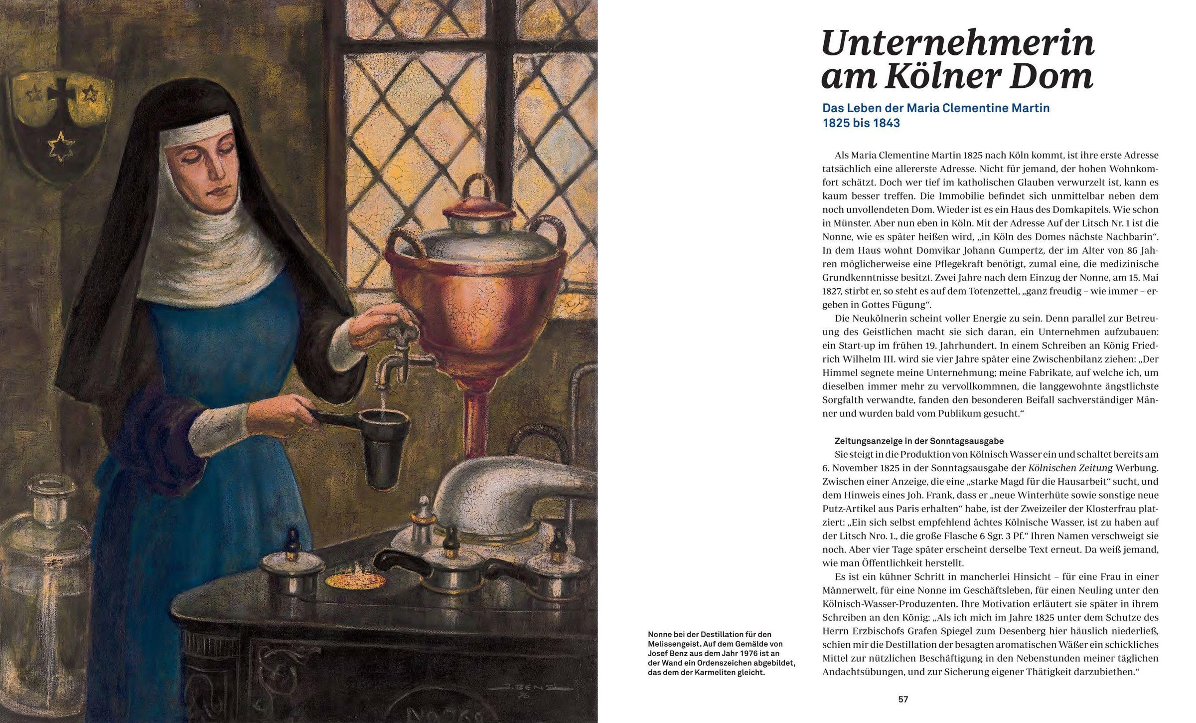 Drei stilisierte Nonnen zieren das ikonische Logo von "Klosterfrau Melissengeist", und tatsächlich: Das Kölner Unternehmen verdankt seine Erfolge einer beharrlichen Ordensfrau, die ihm zu weltweiter Bekanntheit und Anerkennung verhalf - Maria Clementine Martin.