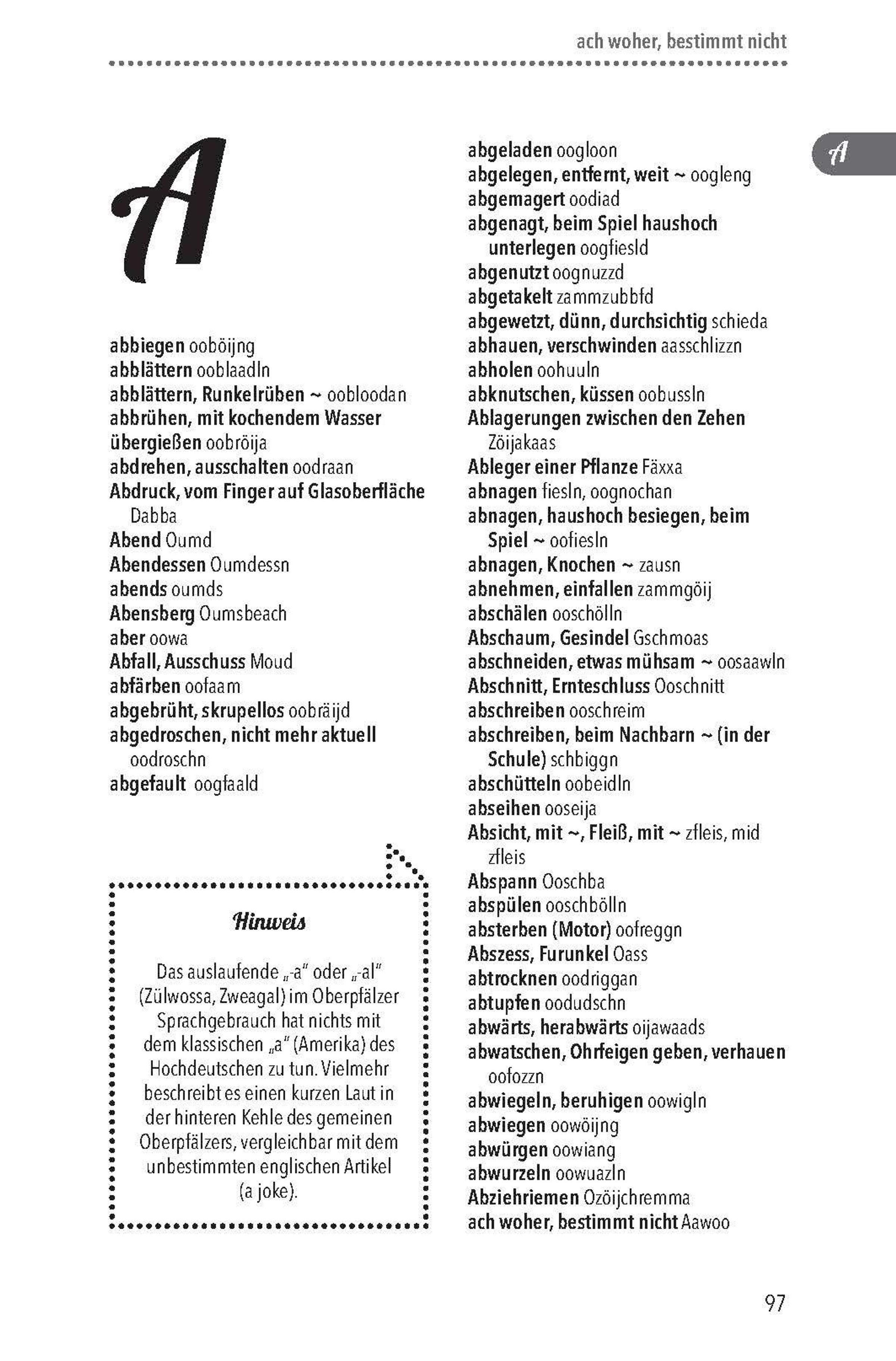 Woran erkennt man einen Oberpfälzer? Wenn's heißt: "Da vorn gibt's Freibier!", dann wird jeder halbwegs vernünftige Oberpfälzer antworten: "Wou, wou?" Von "Bou" und "dou" bis hin zur "Kouh" - man kennt den Slang der Oberpfalz. Doch die Sprachregion im Norden Bayerns hat so viel mehr zu bieten: Der Oberpfälzer Dialekt umfasst ein breites Repertoire, um jedes Gefühl, jede Situation des Lebens treffend verbalisieren zu können. Das Oberpfälzer Wörterbuch beinhaltet über 4000 Wörter aus dem alltäglichen Sprachgebrauch. Dazu kommen geniale Schmankerl aus allen Ecken der wunderbar sprachgewaltigen Oberpfalz.