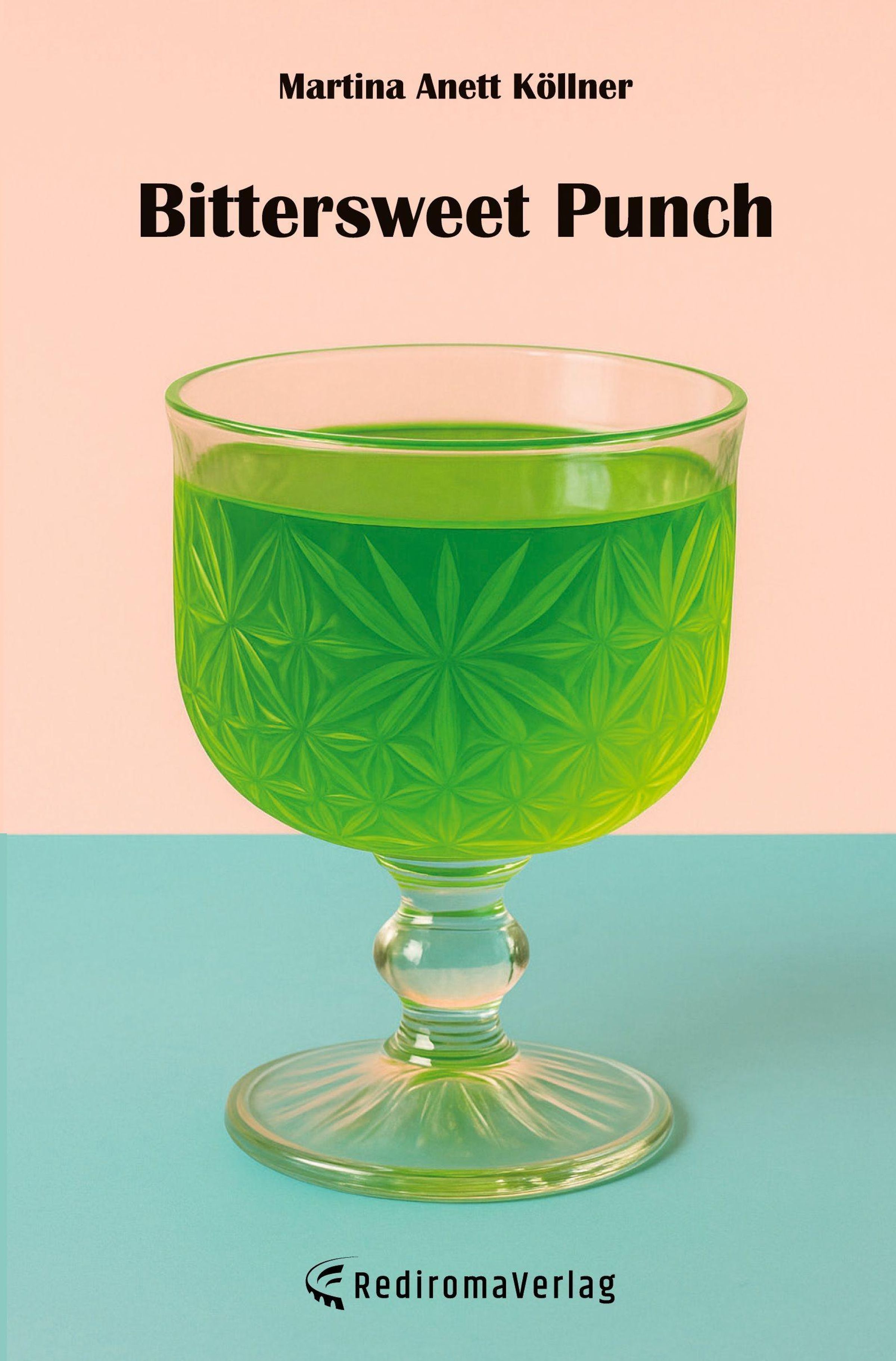 "Bittersweet Punch" von Martina Anett Köllner, darunter grünes Getränk in einem dekorativen Glas auf zweifarbigem Hintergrund., Buch