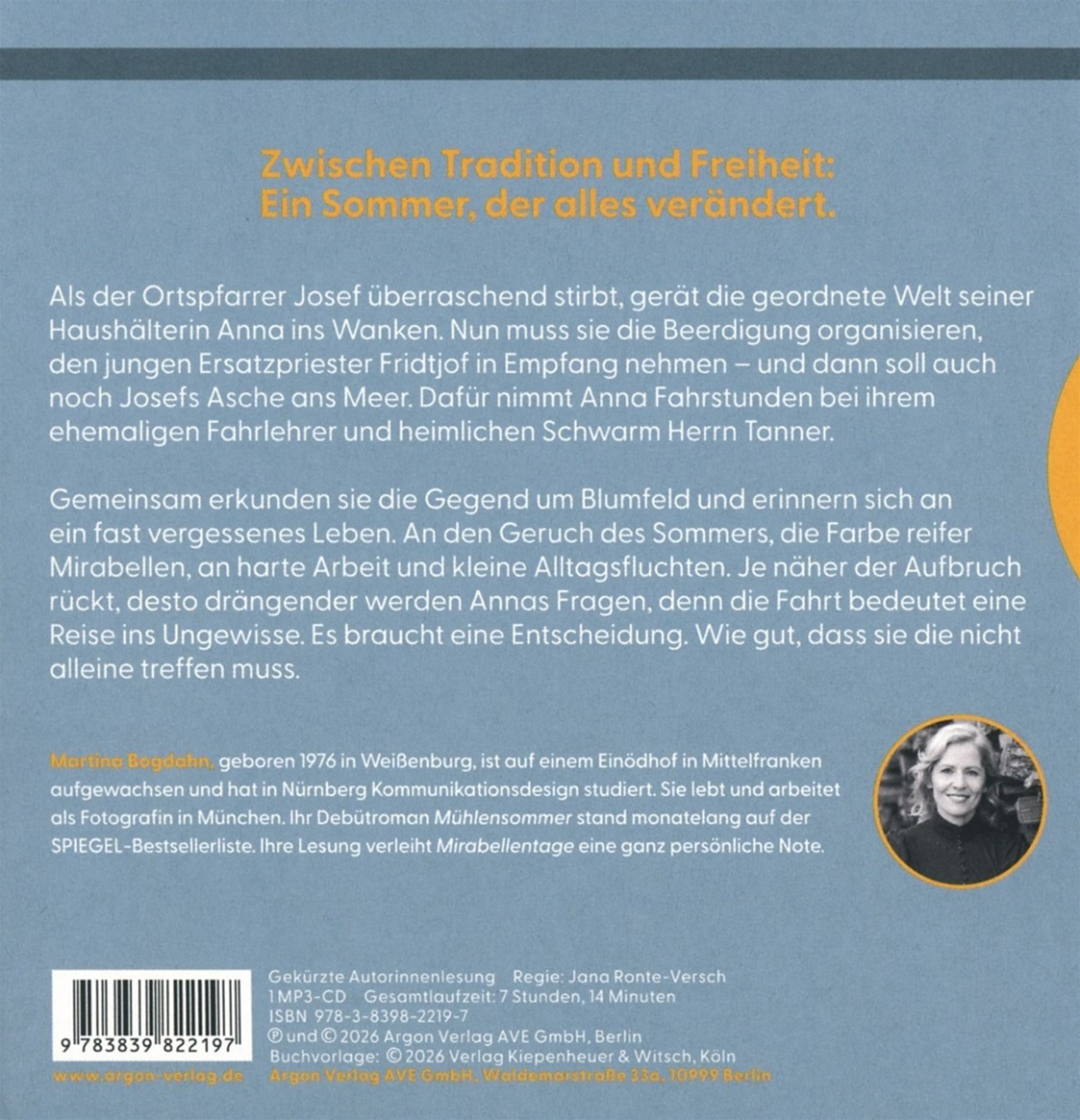Flirrende Hitze über dem See, das Summen in den Feldern und der Geschmack von Mirabellen. Martina Bogdahn führt uns in einen bewegten Sommer. In 'Mirabellentage' erzählt sie warmherzig und humorvoll von einem Leben zwischen Routinen, Pflichten und Loslassen. Von einem letzten Wunsch und einem lang gehüteten Geheimnis. Von einer Frau, die alles hinterfragt und eine neue Sicht aufs Leben gewinnt. Denn ihre Freiheit liegt nicht in weiter Ferne, sie ist der schmale Weg, auf dem sie geht.