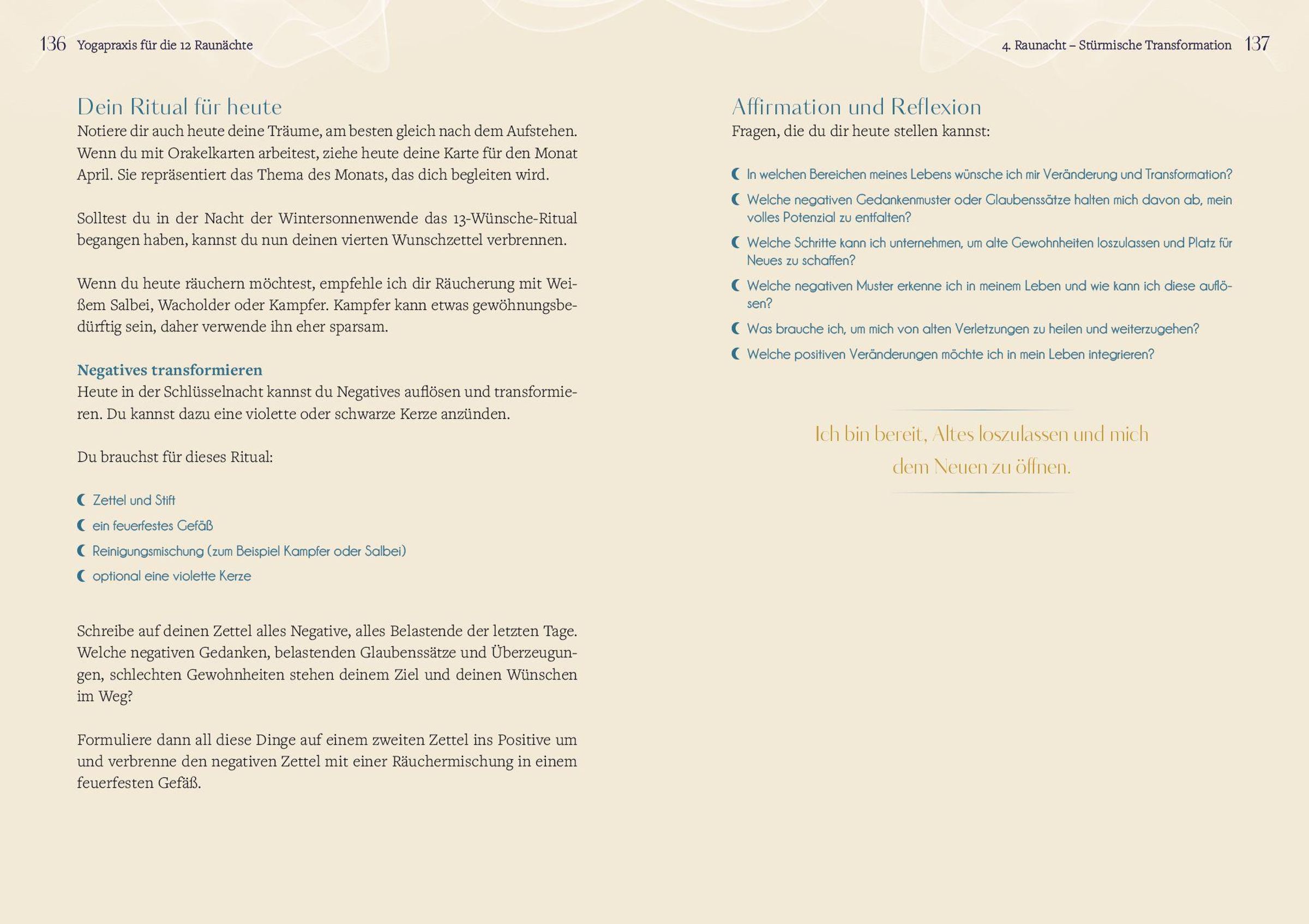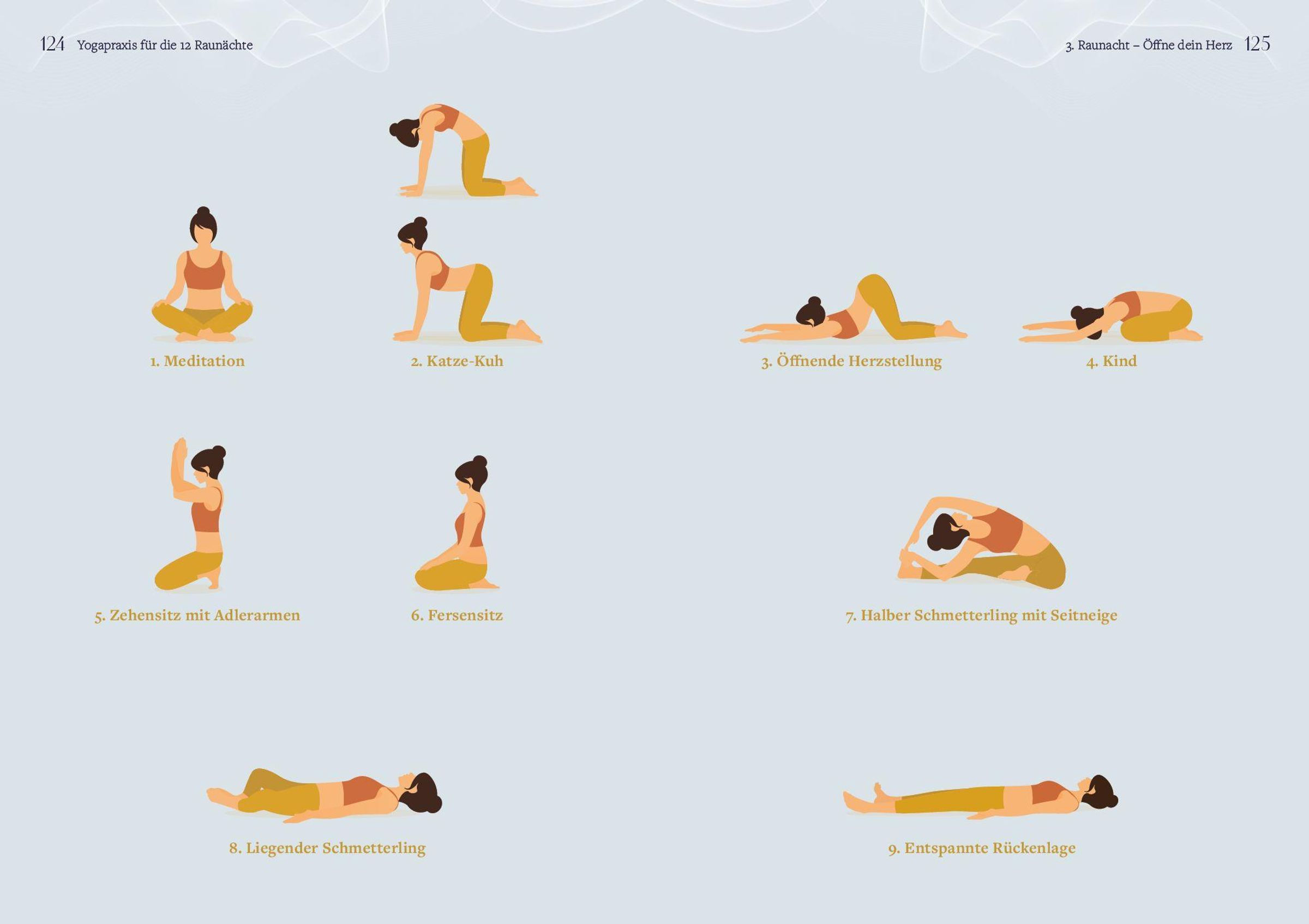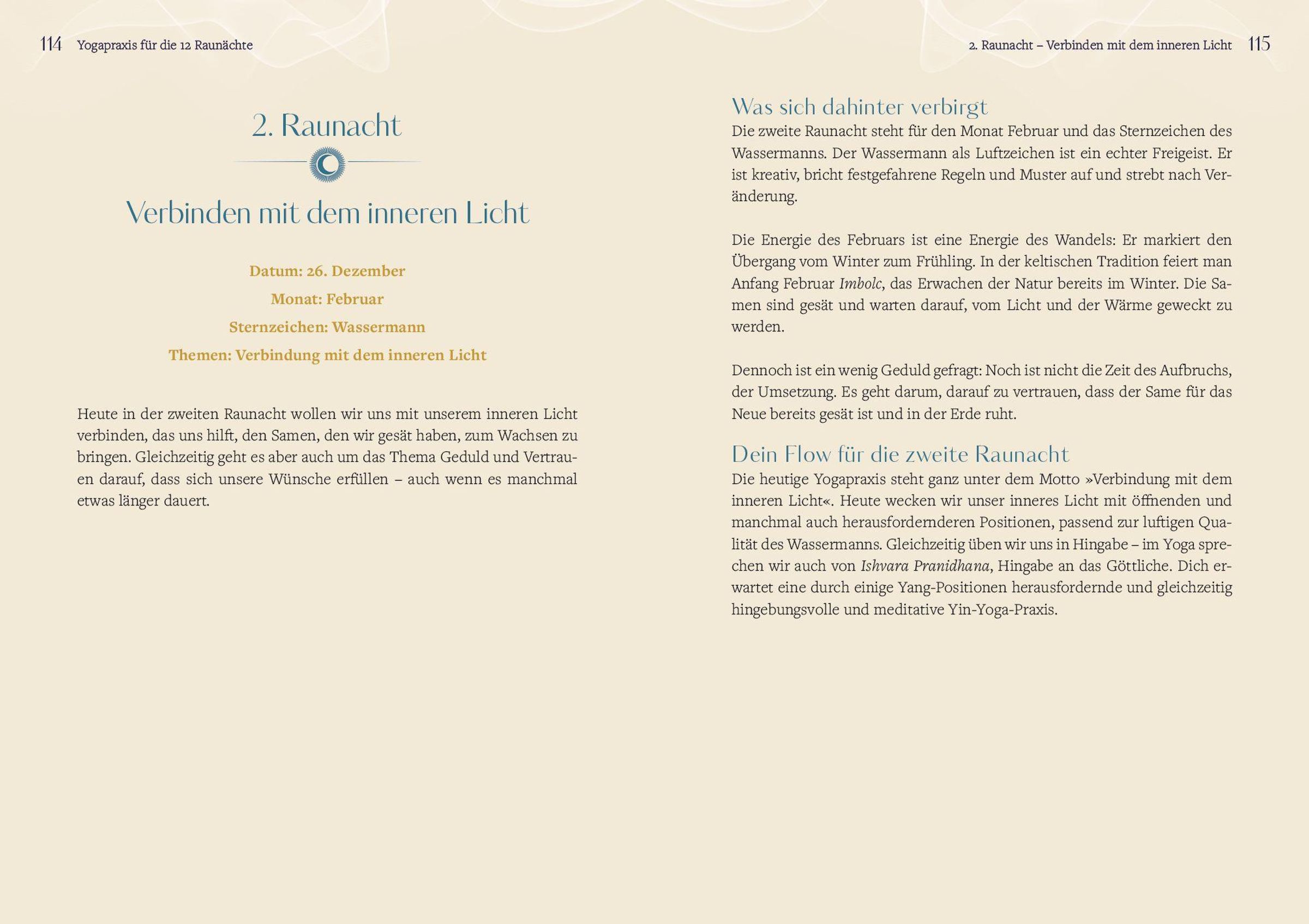 In einer immer hektischer werdenden Zeit sehnen sich die Menschen vermehrt nach Ruhe und Besonnenheit. Vor allem in den oft dunklen und stressigen Tagen um den Jahreswechsel bieten die sagenumwobenen Raunächte die perfekte Möglichkeit, in sich zu kehren und Kraft zu tanken - und Yoga wirkt dabei wunderbar unterstützend. Yoga- und Meditationslehrerin Martina Honecker zeigt, dass die uralten Traditionen der Raunächte auch heute noch die Bedürfnisse vieler Menschen treffen und dass Yin Yoga die ideale Praxis darstellt, um diese mystische Zeit von Ende Dezember bis Anfang Januar noch bewusster zu erleben. Für jede der zwölf Nächte hat sie eine individuelle Yogasequenz kreiert, optimal abgestimmt auf das jeweilige Tagesthema wie Zuversicht, Balance oder Entfaltung. In Kombination mit den klassischen Bräuchen, zum Beispiel Räuchern, ergeben sich so einzigartige Rituale. Die sanften Asanas helfen dabei, noch tiefer in die Entspannung zu kommen und voller Harmonie und Klarheit das neue Jahr willkommen zu heißen.