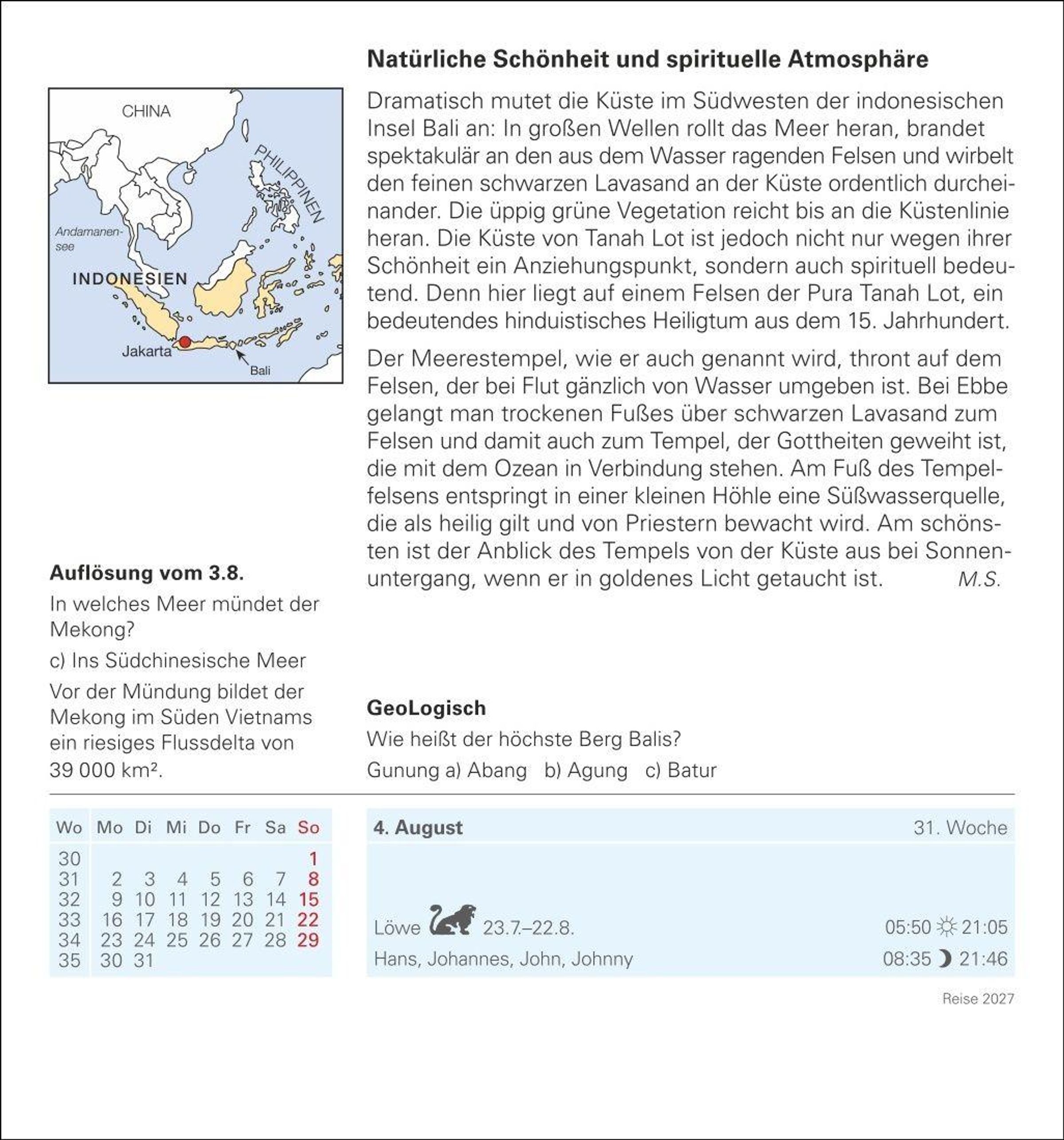 - Kalender für jeden Tag mit faszinierenden Bildern fremder Kulturen, rätselhaften Bräuchen und beeindruckenden Orten aus aller Welt. Tischkalender 2027
