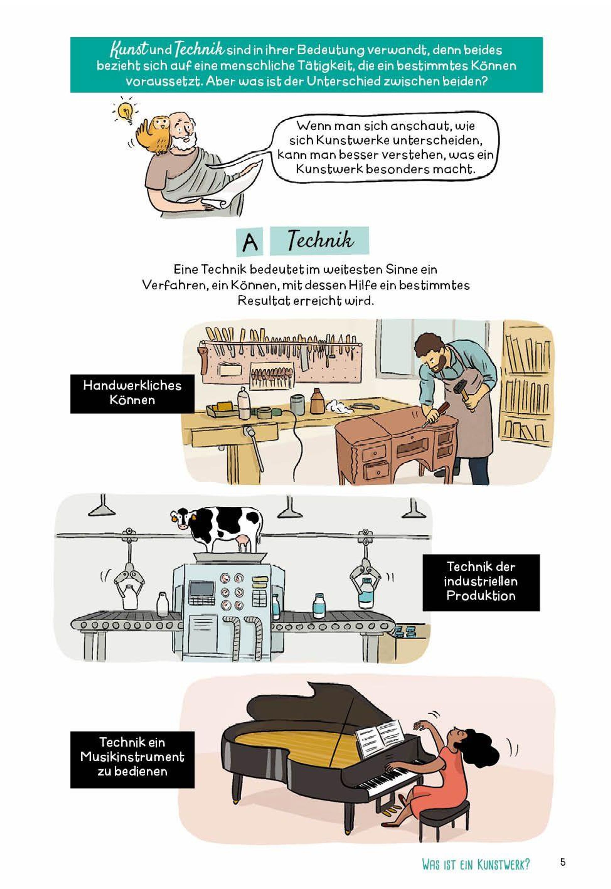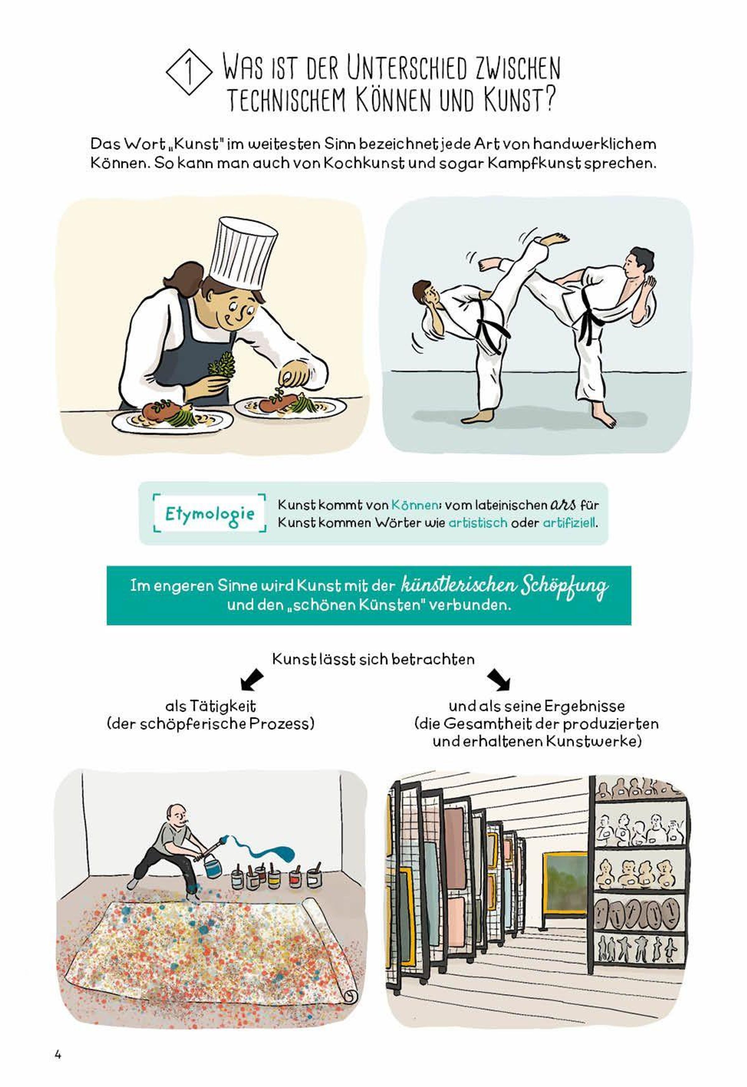 Kunst kommt von ko¿nnen, aber nicht alles, was gekonnt gemacht ist, ist deshalb wirklich Kunst. Dazu muss noch etwas anderes kommen, etwas, das die Menschen mehr oder anders bewegt als ein bloß technisches Kunststu¿ck. Das kann sein, dass ein Kunstwerk ein Beitrag zum Gedächtnis der Menschheit ist, das man ehrfu¿rchtig im Museum bewahrt; es kann auch darauf beruhen, dass ein Kunstwerk etwas ist, das einer ganzen Gesellschaft gefällt und sie so vereinigt; oder im Gegenteil etwas, das etwas darstellt, das fu¿r Konservative ein Skandal ist und mit diesem Skandal die Gesellschaft dazu bringt, sich mit etwas Neuem auseinander- zusetzen, sich zu verändern. Was Kunst jedoch nicht ist, ist einfach eine Imitation der Wirklichkeit. Viele Philosophen seit der Antike haben sich mit Kunst befasst, und haben mit ihrer philosophischen A¿sthetik immer wieder deutlich gemacht, was menschliche Kultur und damit das Menschsein selbst ausmacht.