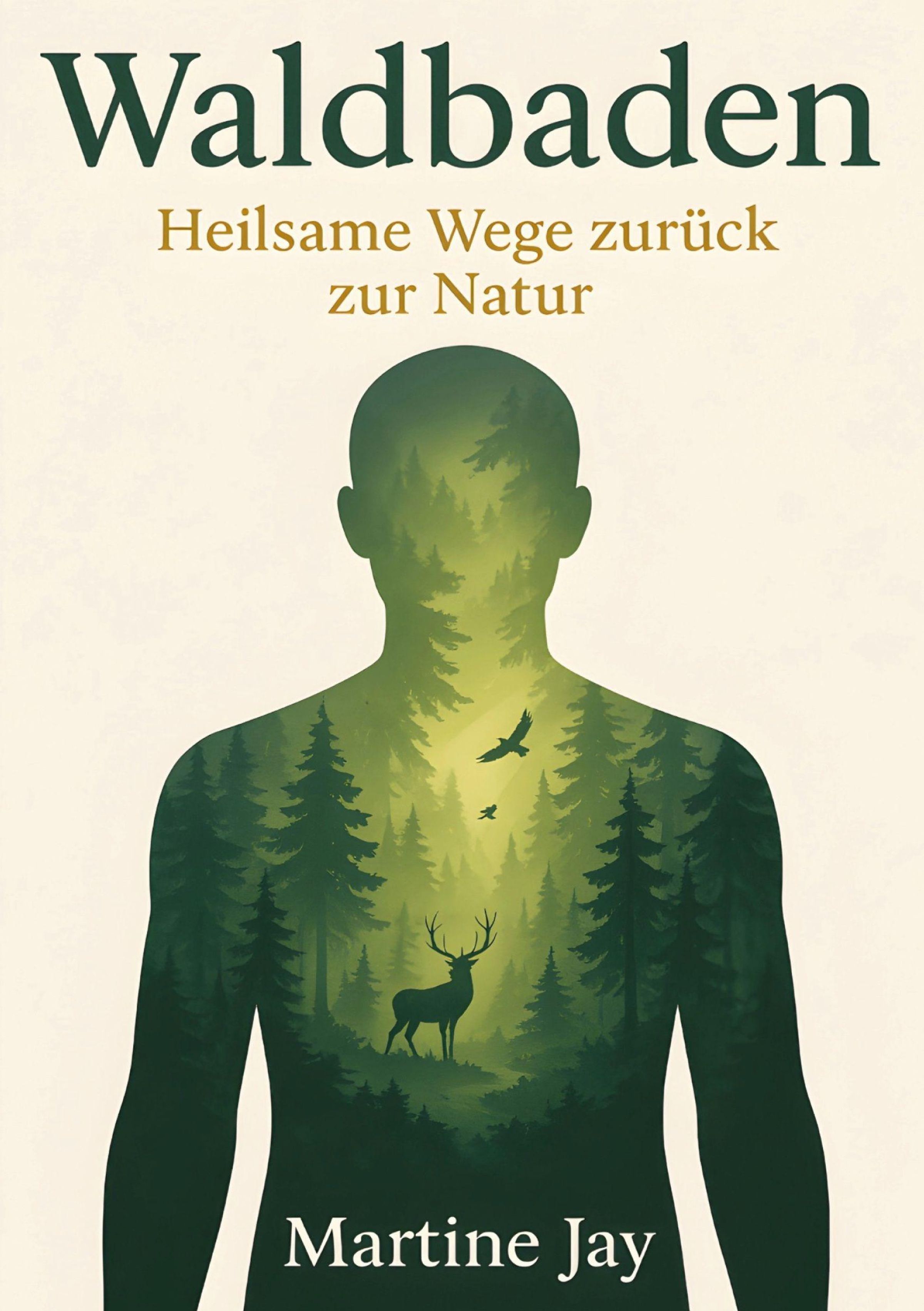 „Waldbaden: Heilsame Wege zurück zur Natur“ von Martine Jay. Silhouette mit Wald, Hirsch und Vögeln., Buch
