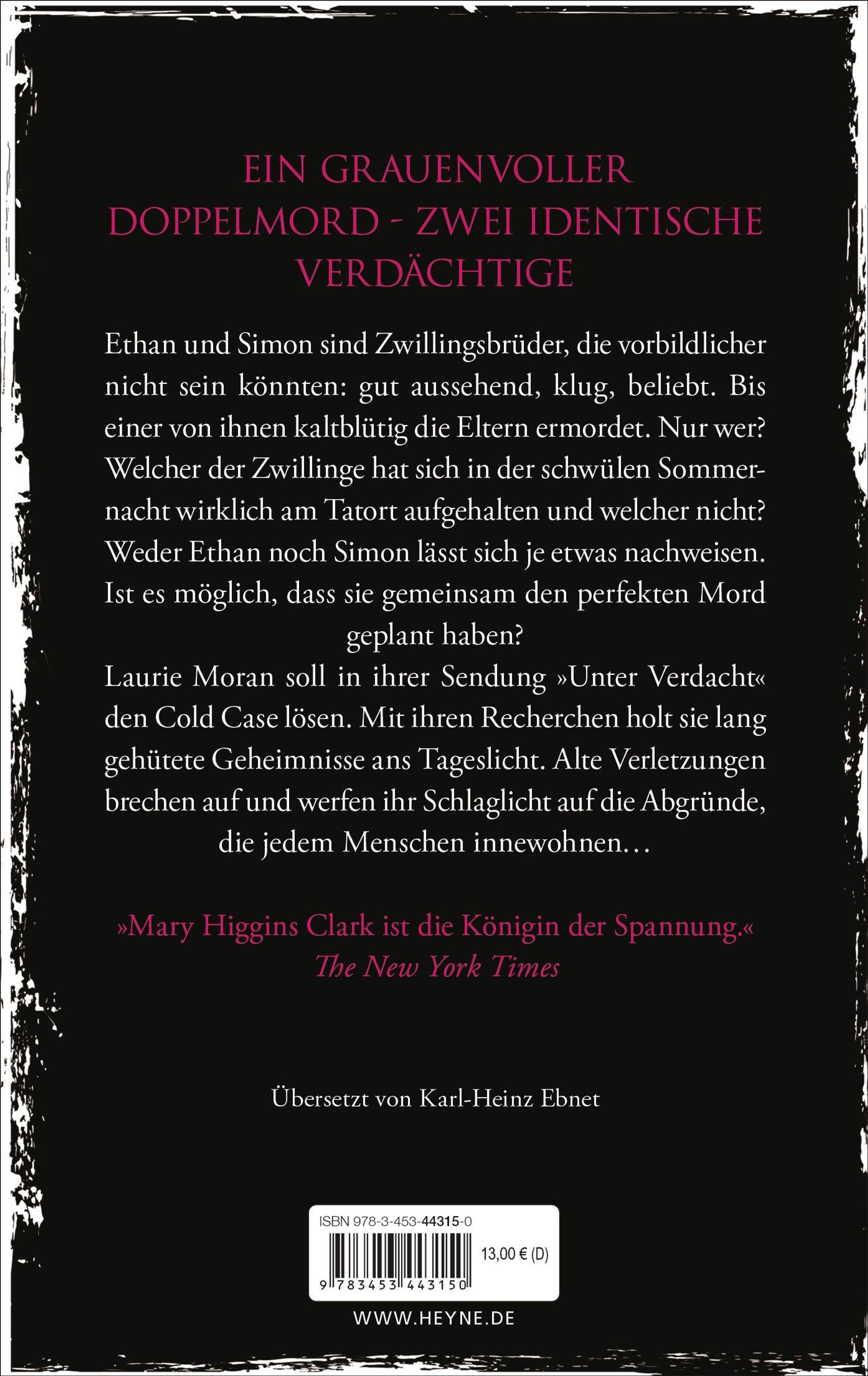 Sie sind Zwillingsbrüder, die vorbildlicher nicht sein könnten: gut aussehend, klug, beliebt. Bis einer von ihnen kaltblütig die Eltern ermordet. Der andere hat ein wasserdichtes Alibi. Welcher der Zwillinge hat sich in der schwülen Sommernacht wirklich am Tatort aufgehalten und welcher nicht? Ist es möglich, dass sie gemeinsam den perfekten Mord geplant haben? Jahre später beschuldigen beide sich gegenseitig. Denn mittlerweile haben sie selbst Familien gegründet - und einiges zu verlieren. Laurie Moran soll in ihrer Sendung 'Unter Verdacht' den Cold Case lösen. Doch mit ihren Recherchen holt sie eine Gefahr wieder ans Tageslicht, die lange in der Vergangenheit begraben war.
