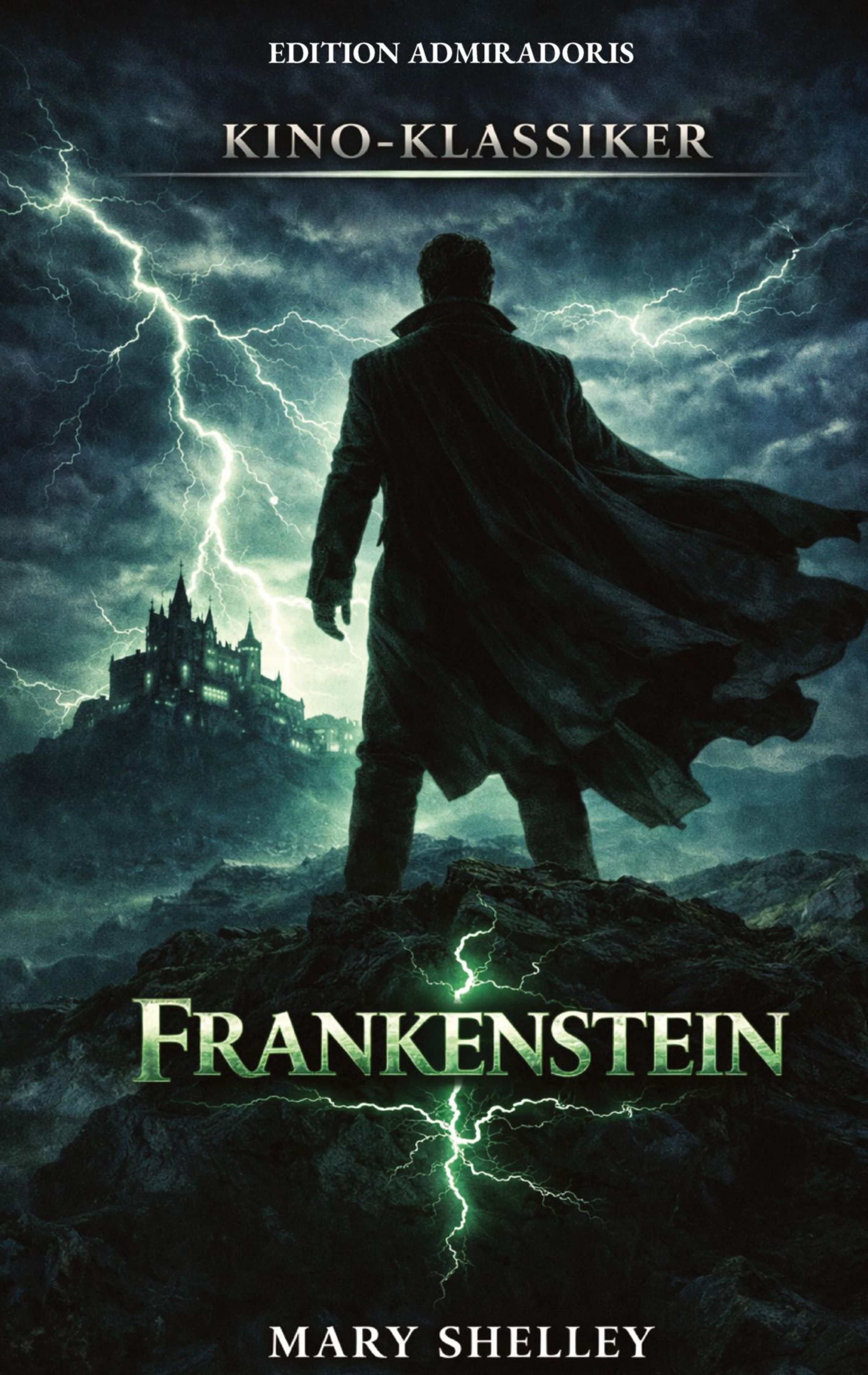 "Edition Admiradoris. Kino-Klassiker. Frankenstein. Mary Shelley." Silhouette eines Mannes vor einer Burg, mit Blitzen., Buch