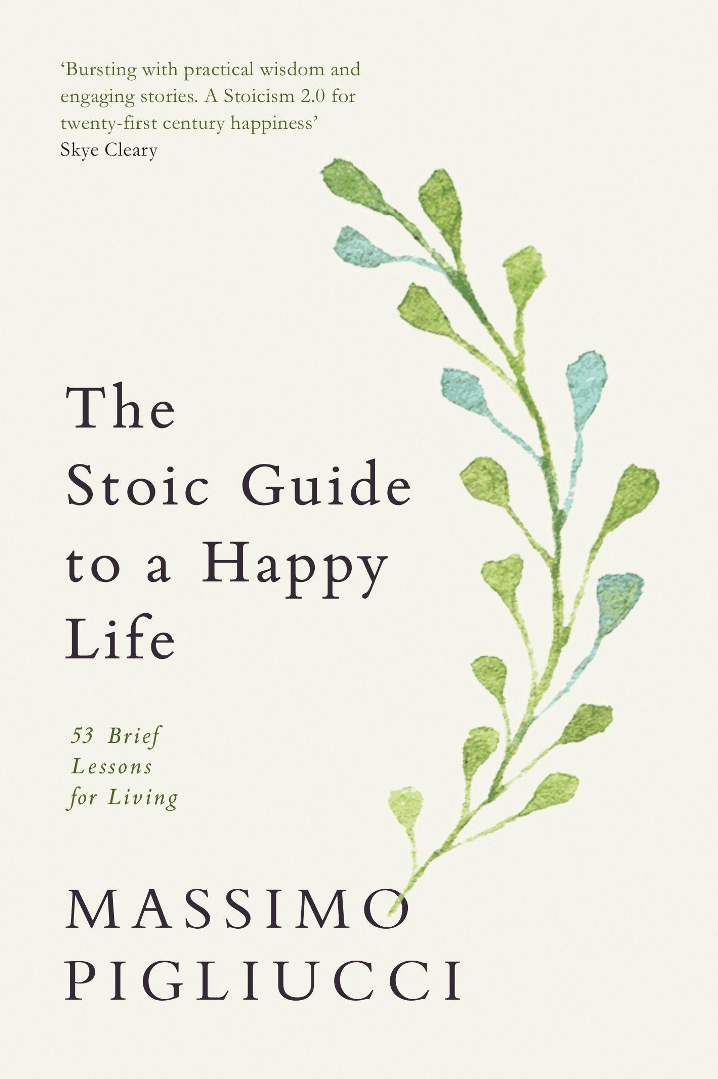 "The Stoic Guide to a Happy Life" von Massimo Pigliucci. Ein grüner Zweig verläuft vertikal rechts., Buch