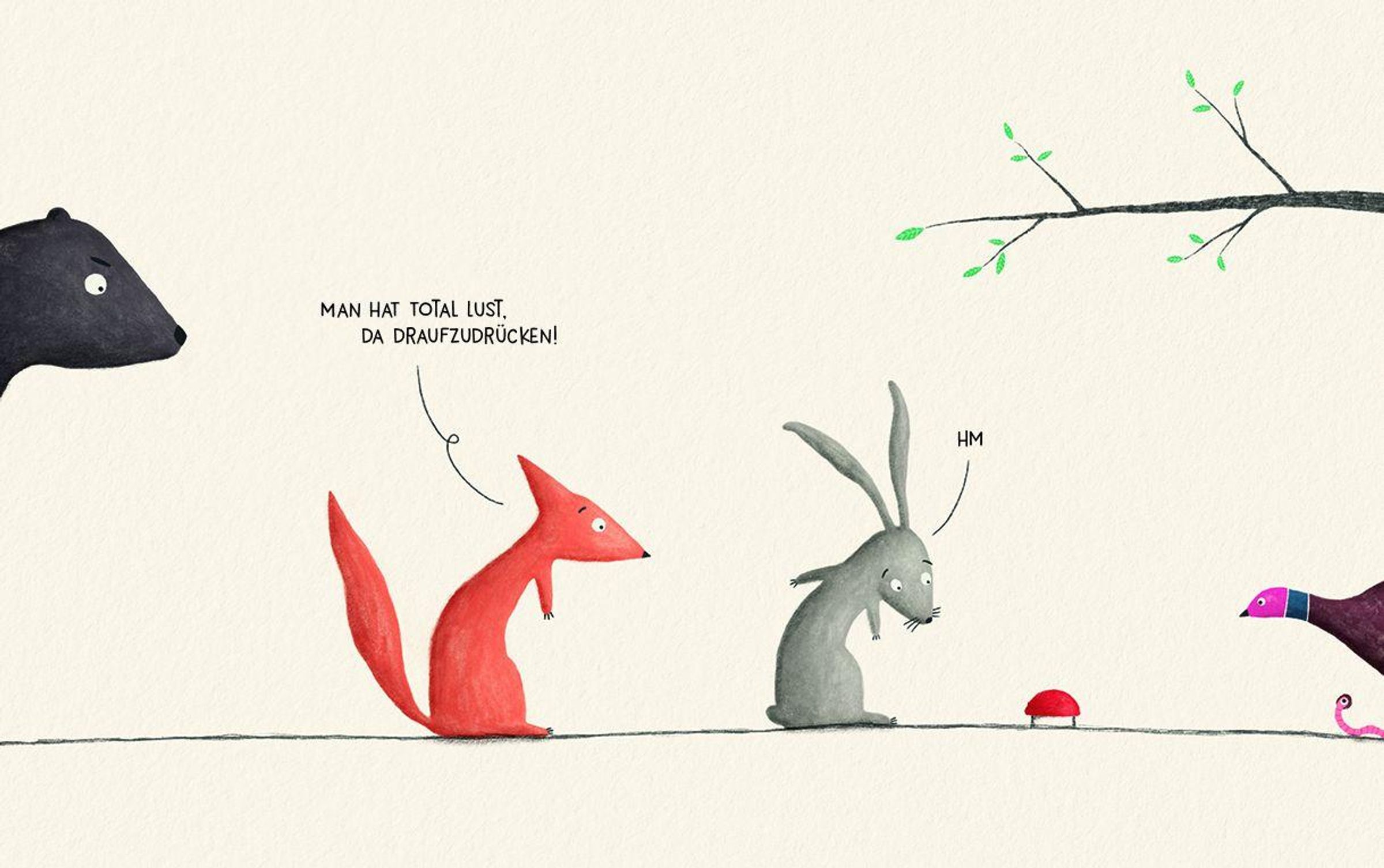 Fuchs, Eichhörnchen, Hase, Bär, Eule und Fasan rätseln: Was ist das bloß für ein Knopf? Was kann er wohl bewirken? Wird etwas Lustiges geschehen, wenn man ihn drückt? Oder eine große Katastrophe? Die Freunde tauschen wilde Theorien aus, diskutieren, ob es eine gute Idee wäre, ihn zu betätigen, oder völliger Wahnsinn. Die Skeptiker unter ihnen gewinnen, sie beschließen, dass niemand den Knopf drücken darf. Am Ende geschieht es aber doch - durch ein kleines Tier, das die ganze Aufregung äußerst unterhaltsam findet.