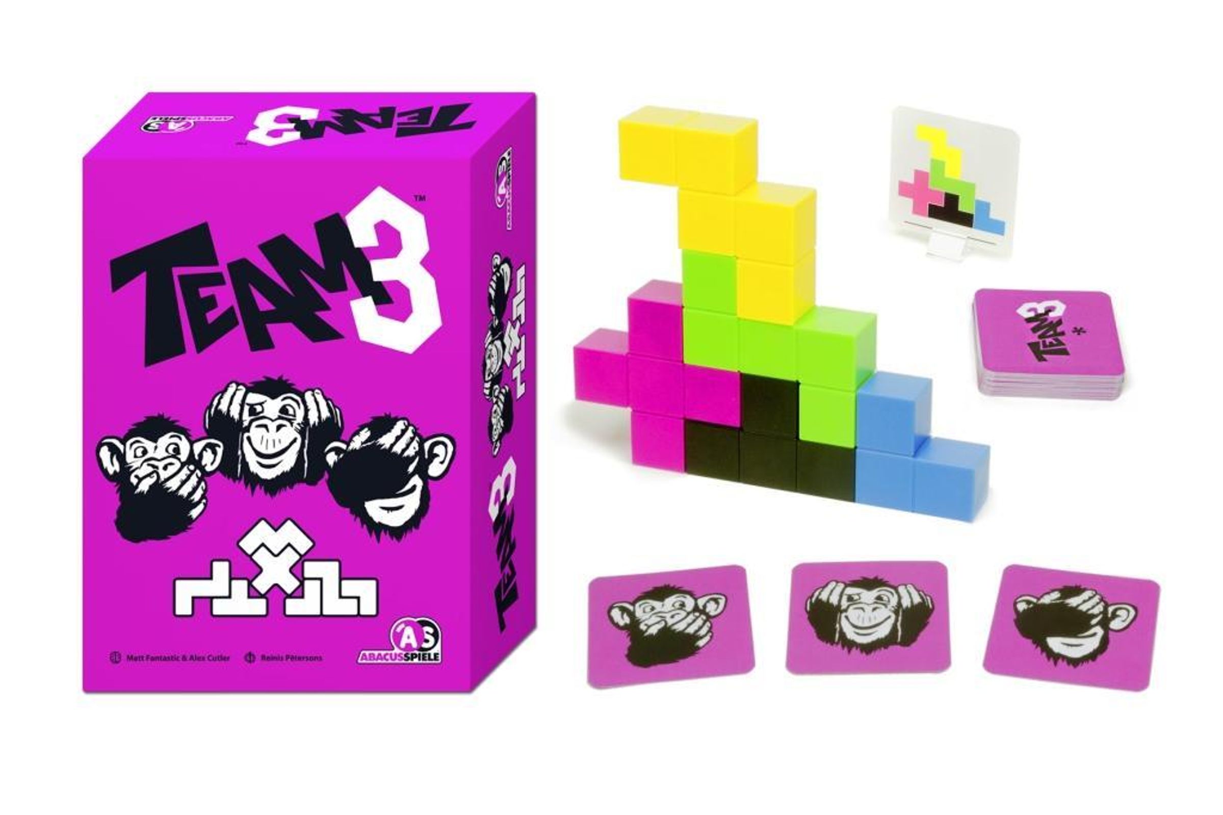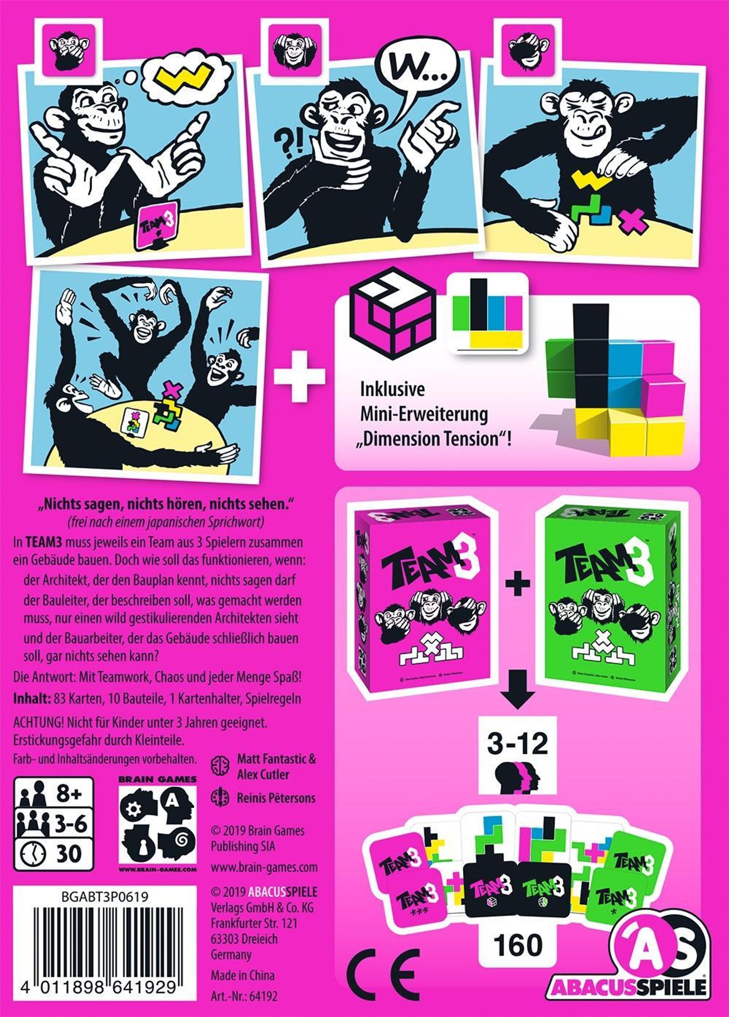 "Nichts sagen, nichts hören, nichts sehen." (frei nach einem japanischen Sprichwort) In TEAM3 muss jeweils ein Team aus 3 Spielern zusammen ein Gebäude bauen. Doch wie soll das funktionieren, wenn: der Architekt, der den Bauplan kennt, nichts sagen darf; der Bauleiter, der beschreiben soll, was gemacht werden muss, nur einen wild gestikulierenden Architekten sieht und der Bauarbeiter, der das Gebäude schließlich bauen soll, gar nichts sehen kann? Die Antwort: Mit Teamwork, Chaos und jede Menge Spaß!