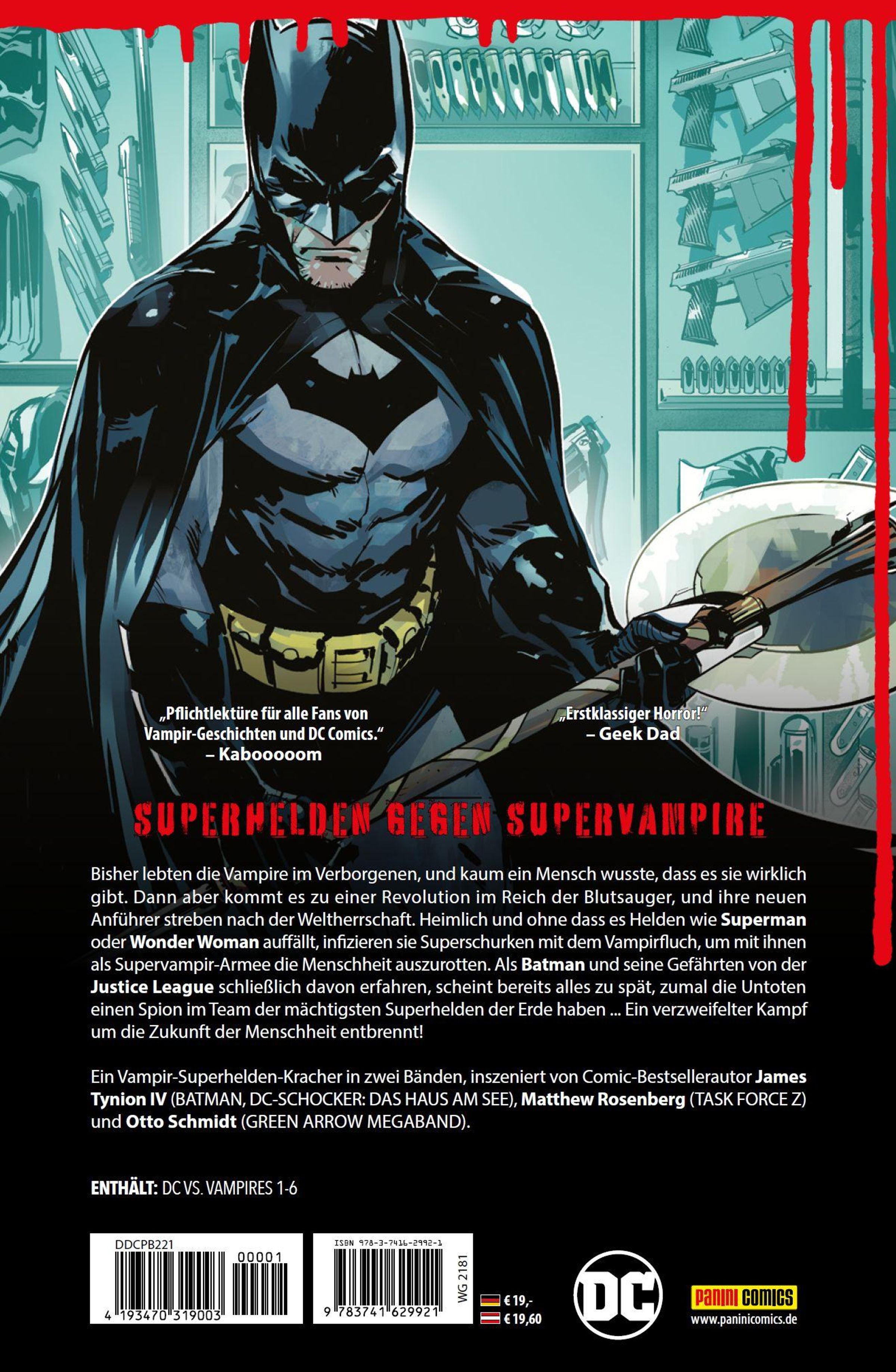 SUPERHELDEN GEGEN SUPER-VAMPIRE Bisher lebten die Vampire im Verborgenen, und kaum ein Mensch wusste, dass es sie wirklich gibt. Dann aber kommt es zu einer Revolution im Reich der Blutsauger, und ihre neuen Anführer streben nach der Weltherrschaft. Heimlich und ohne dass es Helden wie Superman oder Wonder Woman auffällt, infizieren sie Superschurken mit dem Vampirfluch, um mit ihnen als Supervampir-Armee die Menschheit auszurotten. Als Batman und seine Gefährten von der Justice League schließlich davon erfahren, scheint bereits alles zu spät, zumal die Untoten einen Spion im Team der mächtigsten Superhelden der Erde haben ... Ein verzweifelter Kampf um die Zukunft der Menschheit entbrennt! Ein Vampir-Superhelden-Kracher in zwei Bänden, inszeniert von Comic-Bestsellerautor James Tynion IV (BATMAN, DC-SCHOCKER: DAS HAUS AM SEE), Matthew Rosenberg (TASK FORCE Z) und Otto Schmidt (GREEN ARROW).