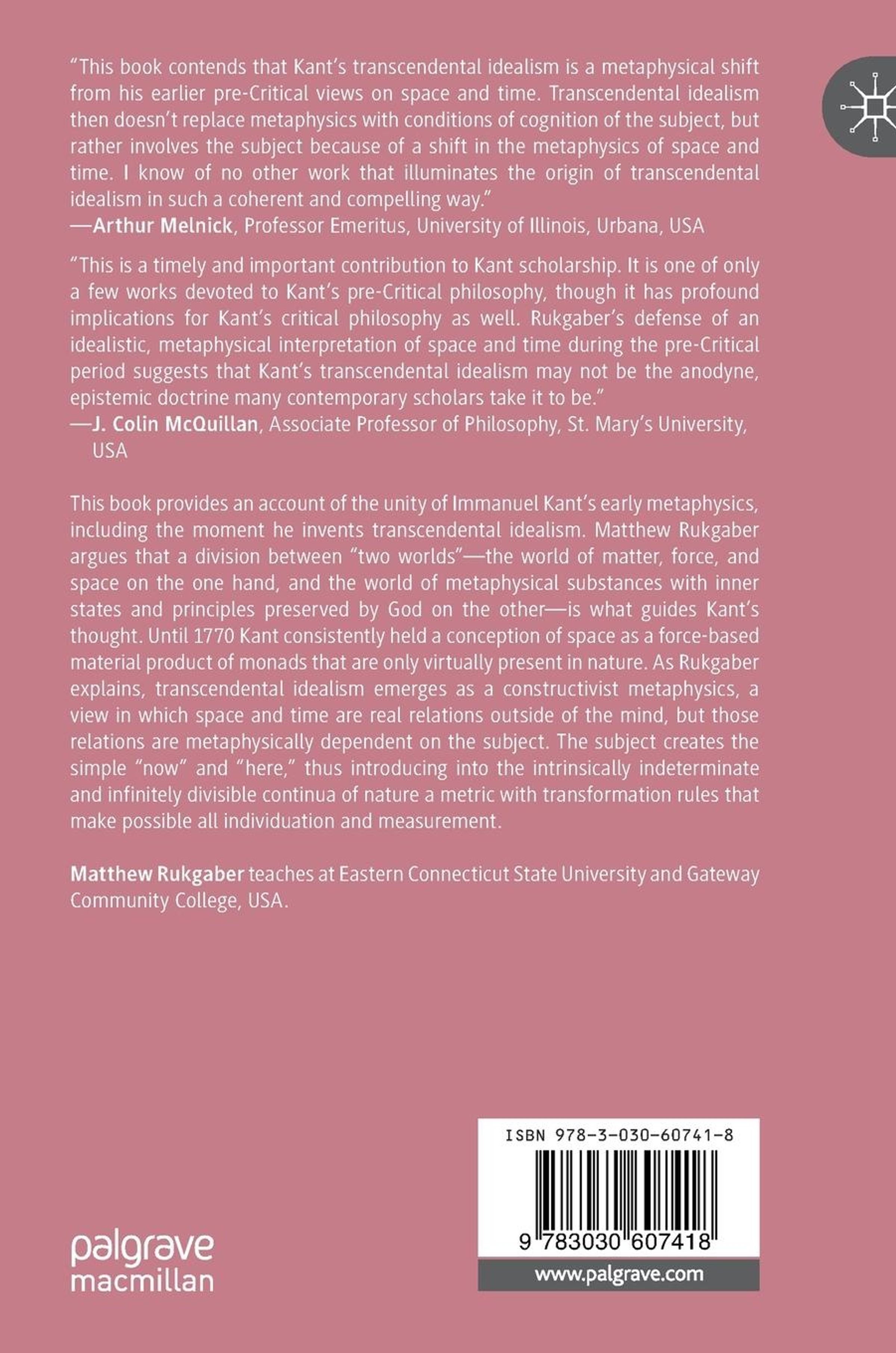 This book provides an account of the unity of Immanuel Kant¿s early metaphysics, including the moment he invents transcendental idealism. Matthew Rukgaber argues that a division between ¿two worlds¿¿the world of matter, force, and space on the one hand, and the world of metaphysical substances with inner states and principles preserved by God on the other¿is what guides Kant¿s thought. Until 1770 Kant consistently held a conception of space as a force-based material product of monads that are only virtually present in nature. As Rukgaber explains, transcendental idealism emerges as a constructivist metaphysics, a view in which space and time are real relations outside of the mind, but those relations are metaphysically dependent on the subject. The subject creates the simple ¿now¿ and ¿here,¿ thus introducing into the intrinsically indeterminate and infinitely divisible continua of nature a metric with transformation rules that make possible all individuation and measurement.