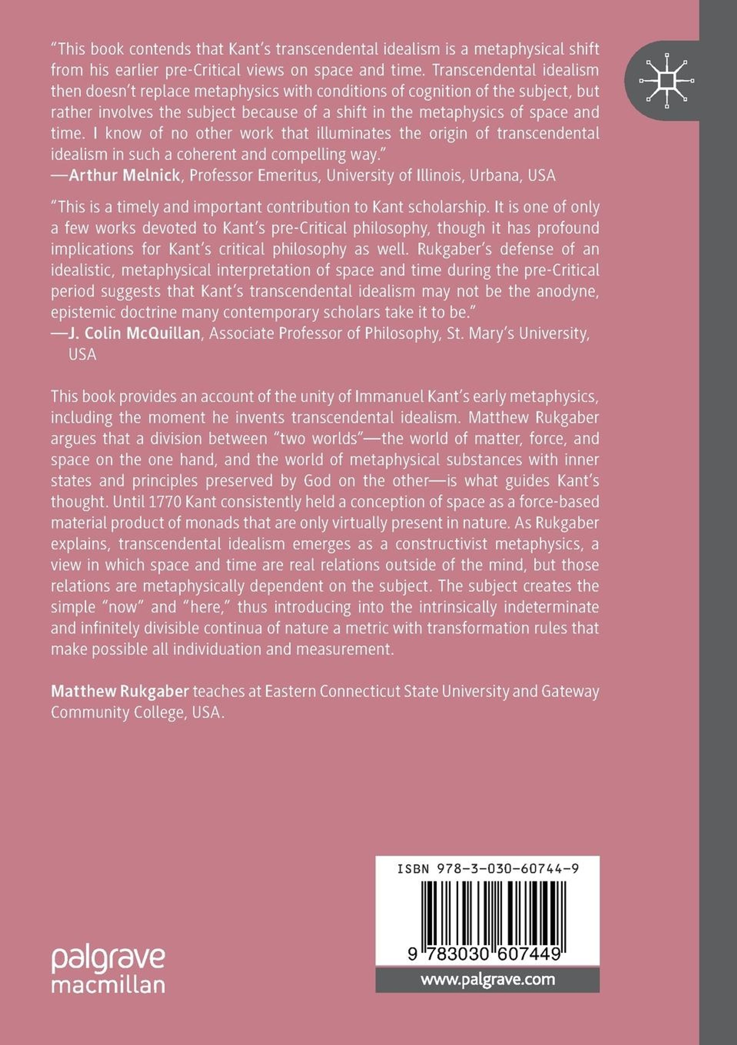 This book provides an account of the unity of Immanuel Kant¿s early metaphysics, including the moment he invents transcendental idealism. Matthew Rukgaber argues that a division between ¿two worlds¿¿the world of matter, force, and space on the one hand, and the world of metaphysical substances with inner states and principles preserved by God on the other¿is what guides Kant¿s thought. Until 1770 Kant consistently held a conception of space as a force-based material product of monads that are only virtually present in nature. As Rukgaber explains, transcendental idealism emerges as a constructivist metaphysics, a view in which space and time are real relations outside of the mind, but those relations are metaphysically dependent on the subject. The subject creates the simple ¿now¿ and ¿here,¿ thus introducing into the intrinsically indeterminate and infinitely divisible continua of nature a metric with transformation rules that make possible all individuation and measurement.