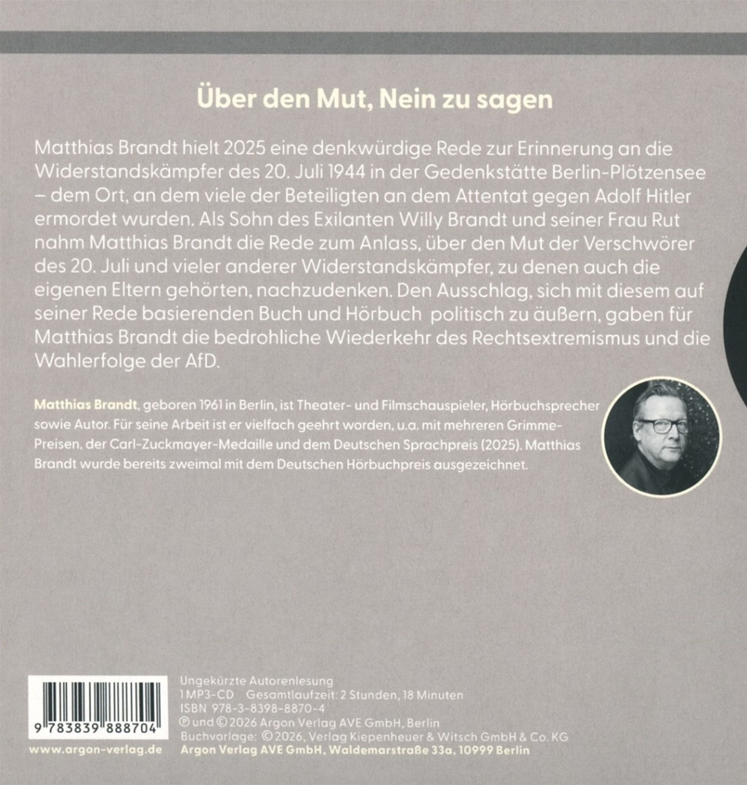 Als Sohn des Emigranten und späteren Bundeskanzlers Willy Brandt und seiner Frau Rut nahm Matthias Brandt die Rede zum Anlass, aus heutiger Sicht über den Mut und die Motive der Verschwörer des 20. Juli und vieler anderer Widerstandskämpfer: innen, zu denen auch die eigenen Eltern gehört hatten, nachzudenken und auch sich selbst über notwendige Konsequenzen aus der Geschichte zu befragen.