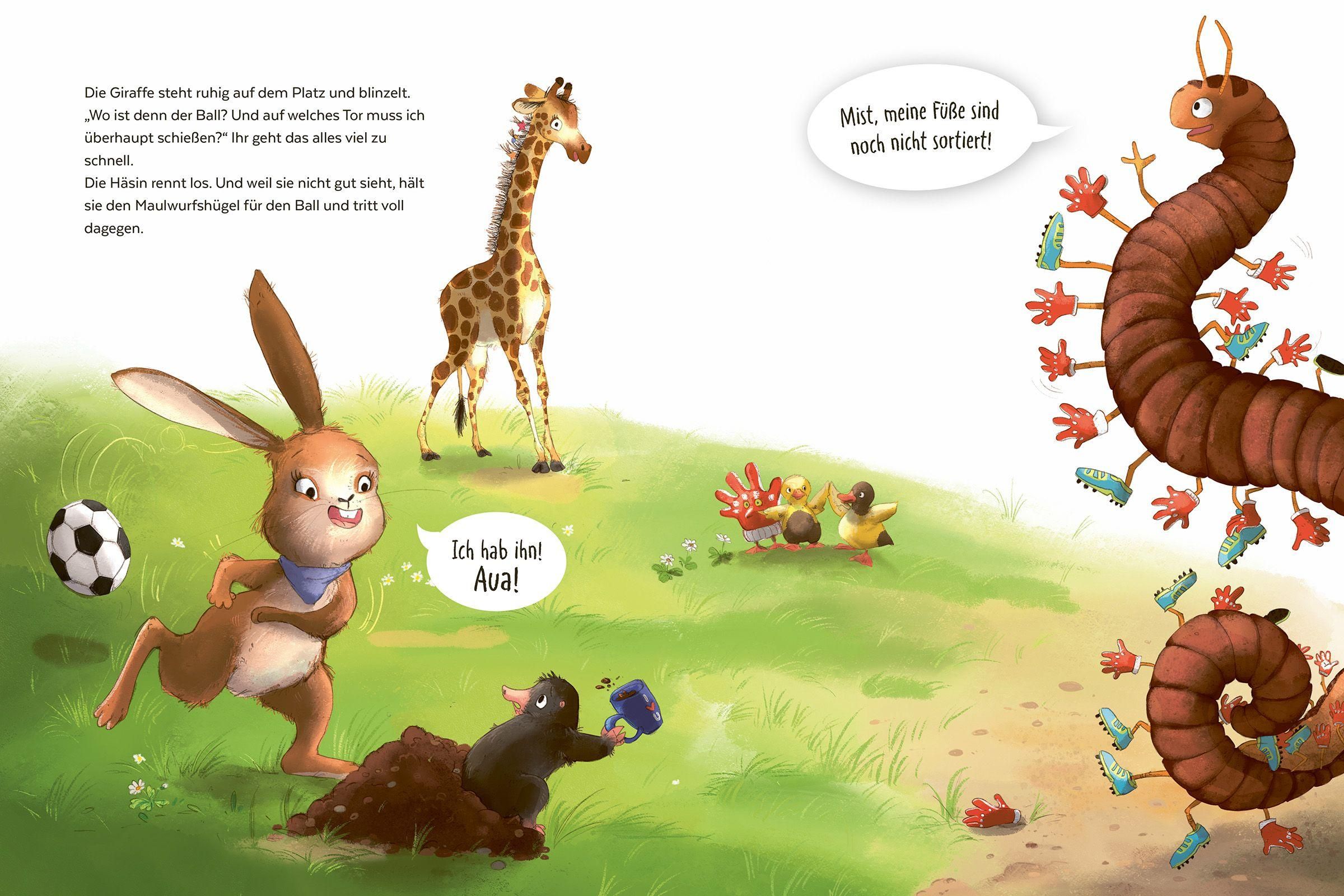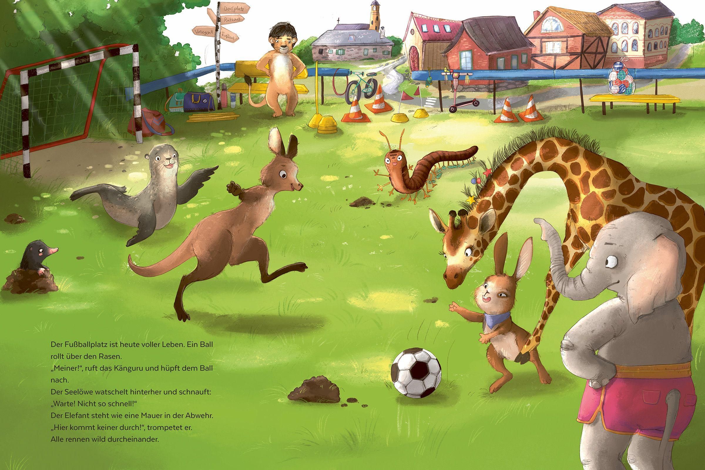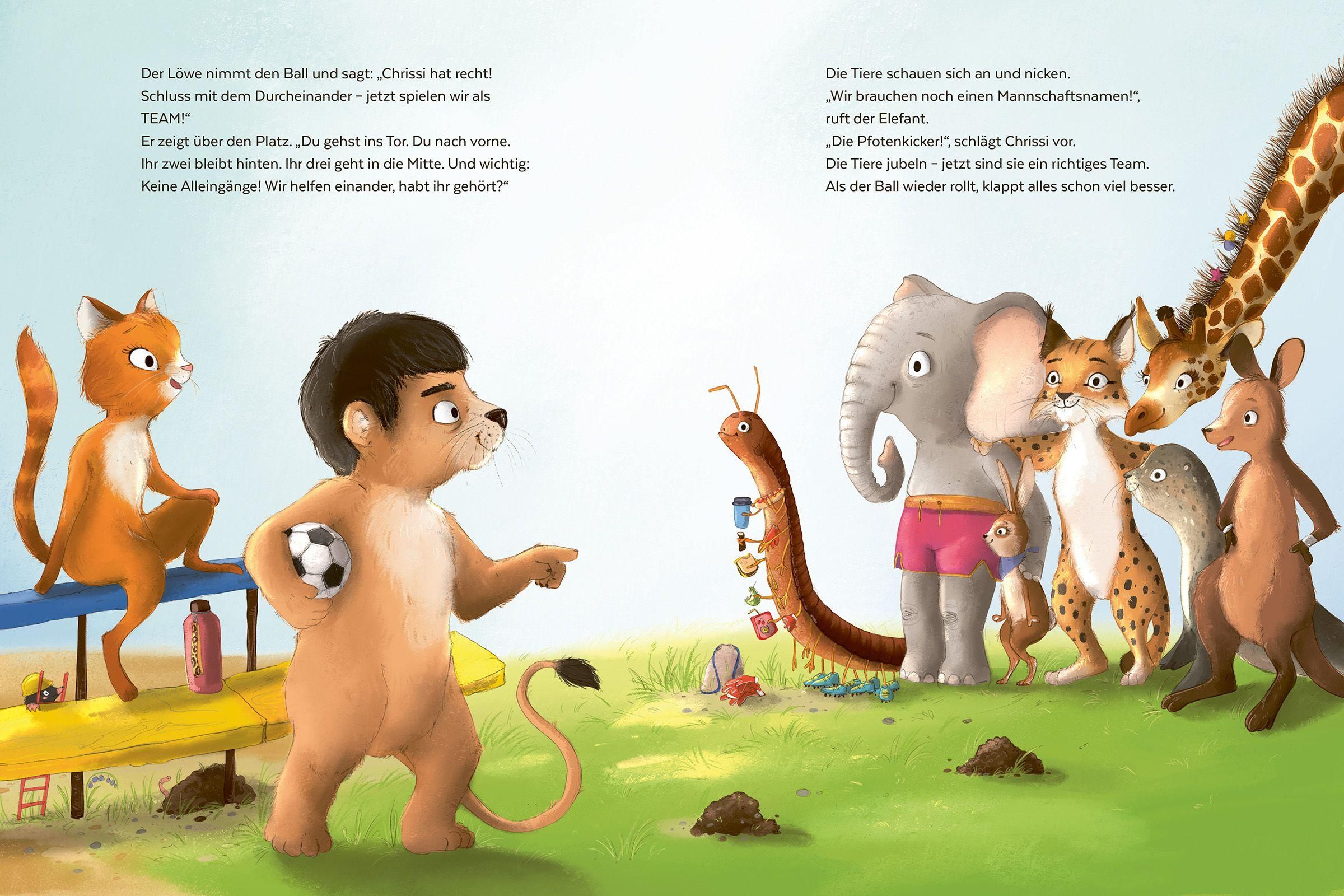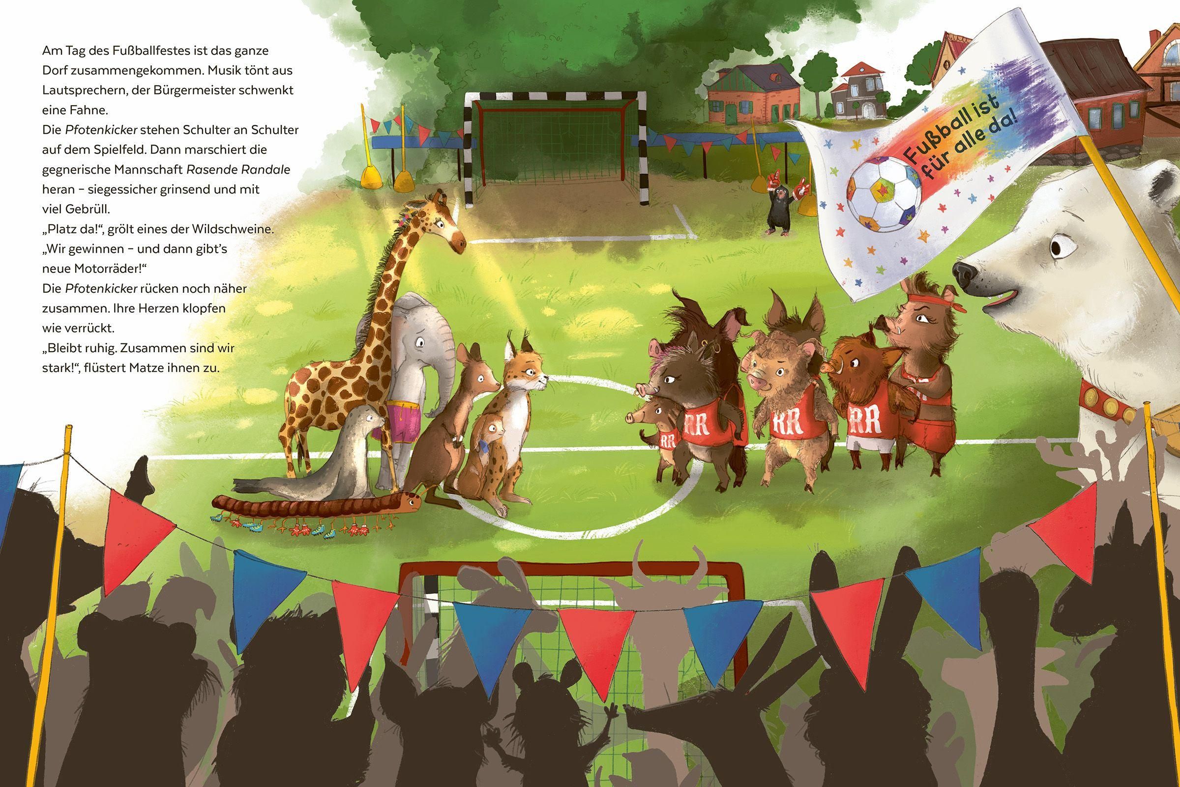 Der Fußballplatz ist heute voller Staub und wildem Durcheinander. Der Seelöwe watschelt dem Ball hinterher, die Häsin schlägt flinke Haken - und der Tausendfüßler versucht verzweifelt, seine vielen Füße zu sortieren. Da kommen Matze Luchs und Chrissi Katze vorbei und motivieren die Tiere, als TEAM zusammenzuspielen. Und plötzlich passiert etwas Erstaunliches: Aus Chaos wird Gemeinschaft. Aus Schwächen werden Stärken. Und alle merken: Zusammen sind sie richtig stark! So treten die Pfotenkicker beim Fußballfest gegen die selbstbewussten Wildschweine von "Rasende Randale" an. Was als wildes Spiel beginnt, wird zu einer Überraschung für das ganze Dorf. Denn hier zählt nicht, wer am stärksten ist - sondern wer füreinander einsteht.