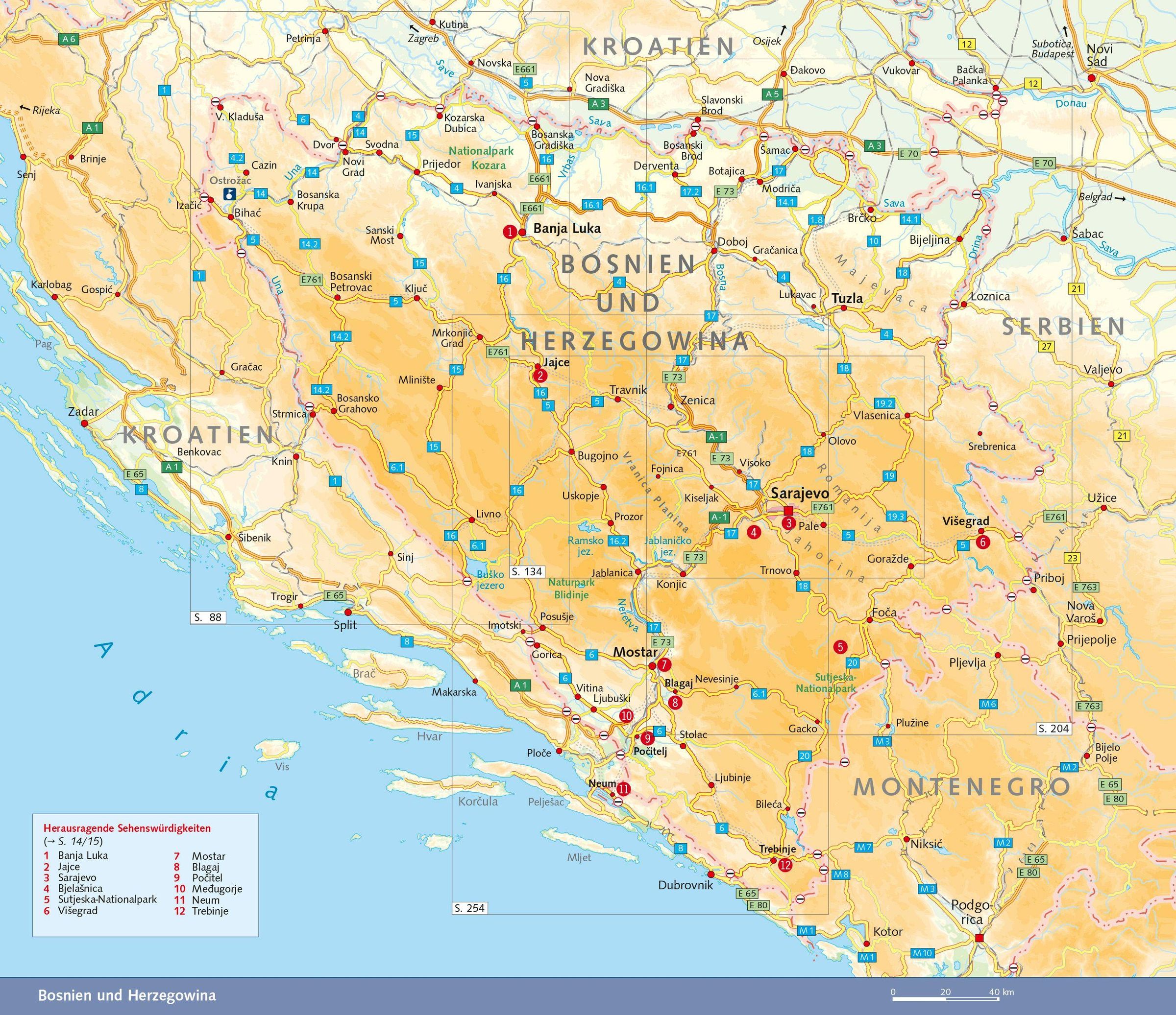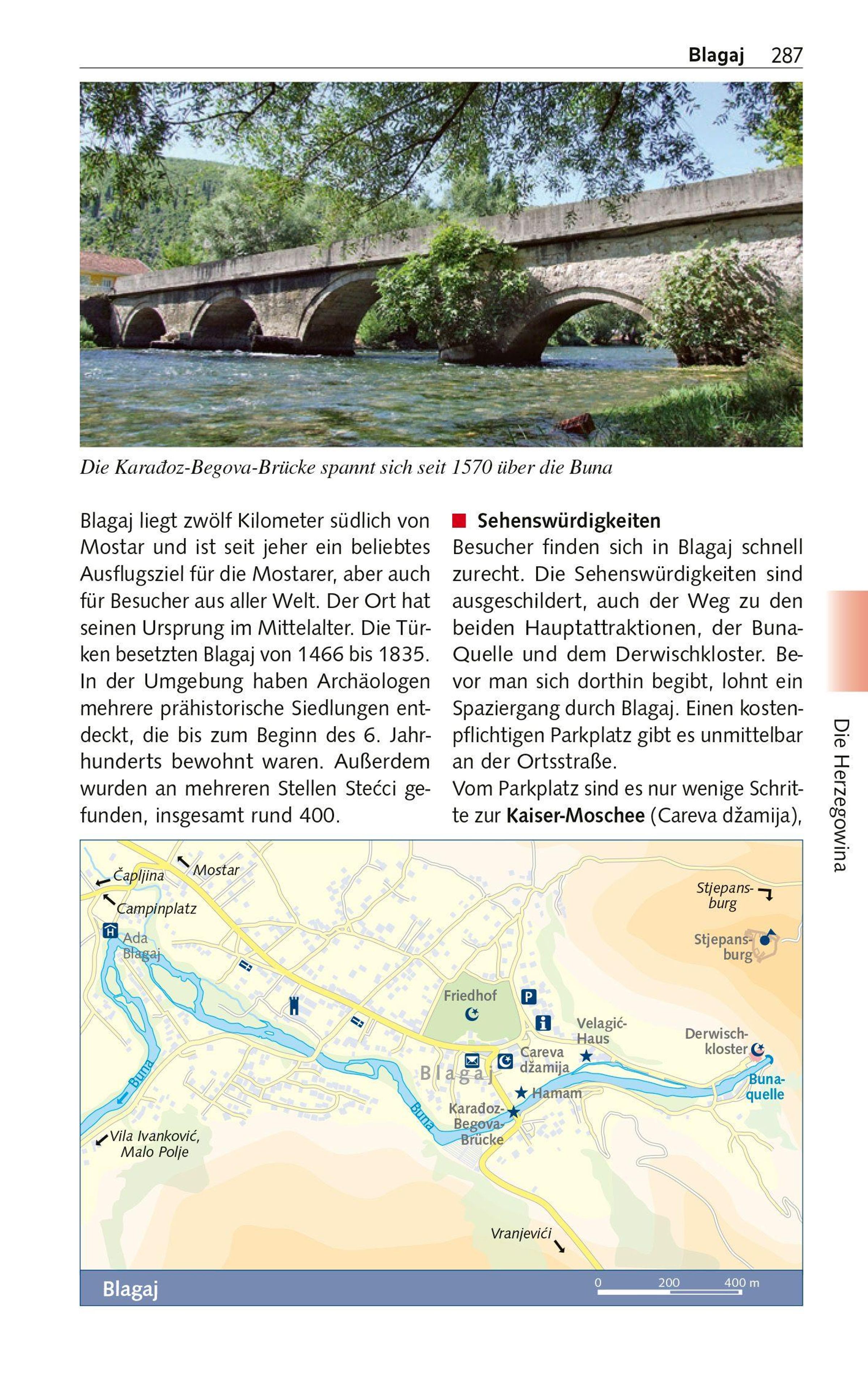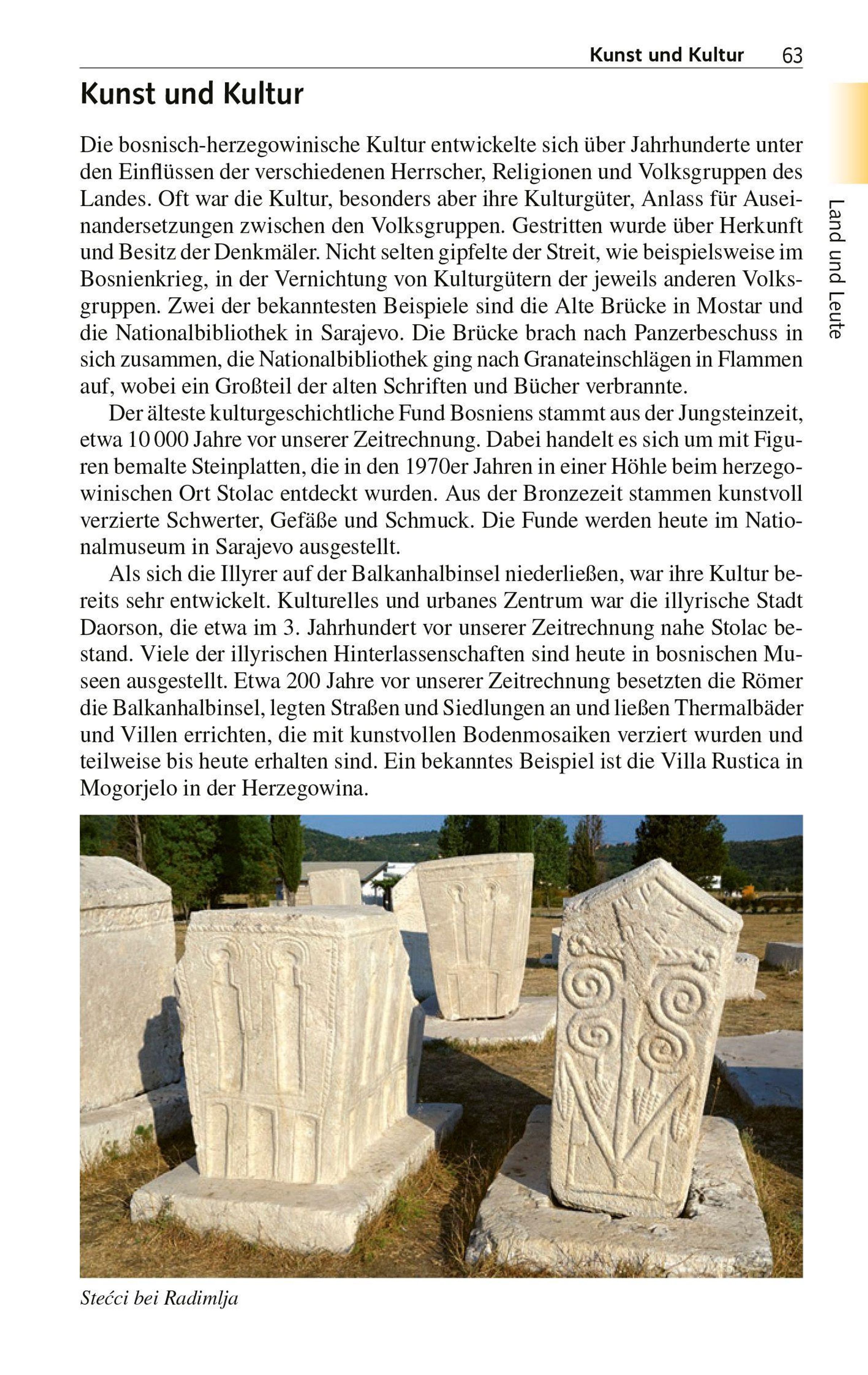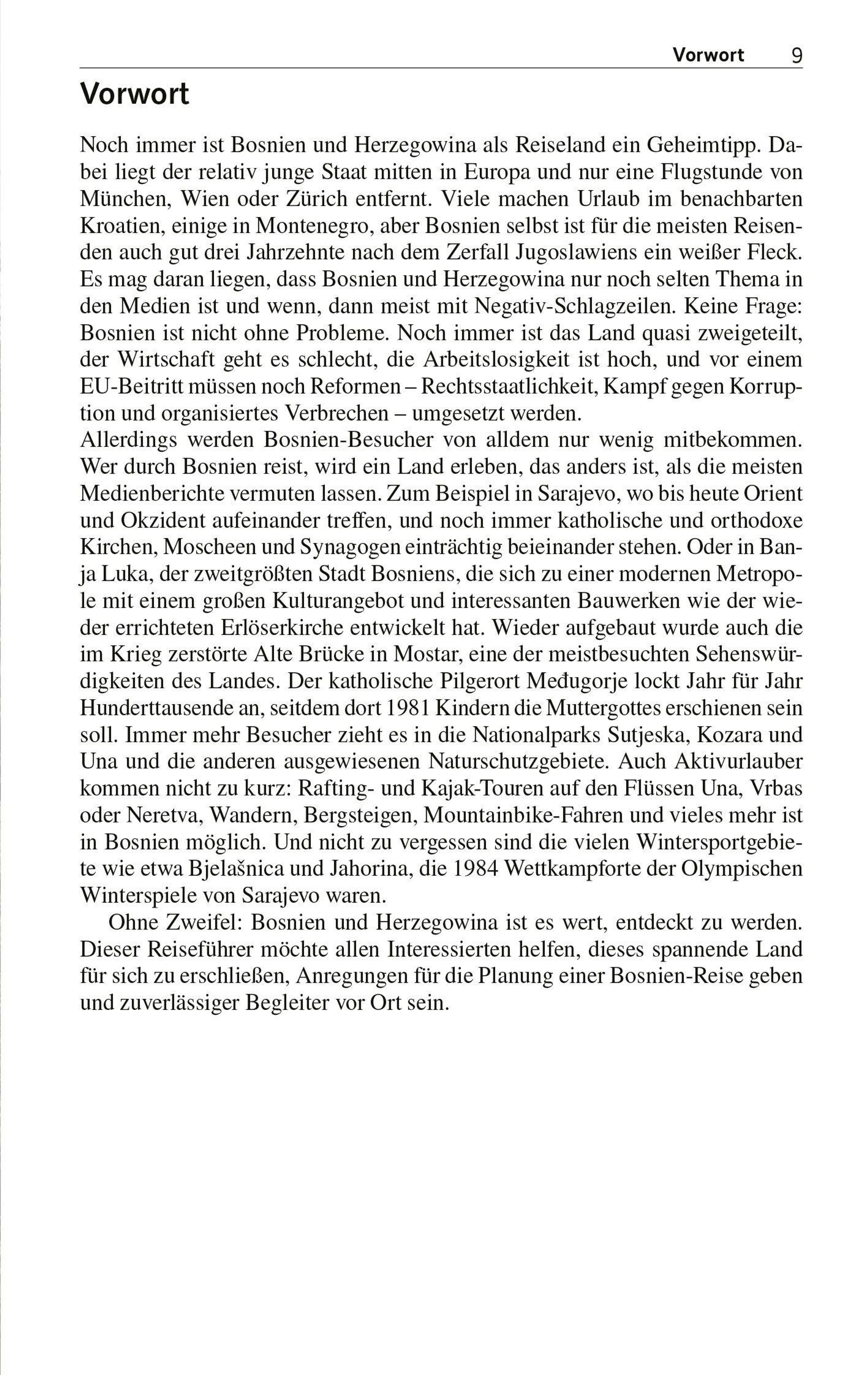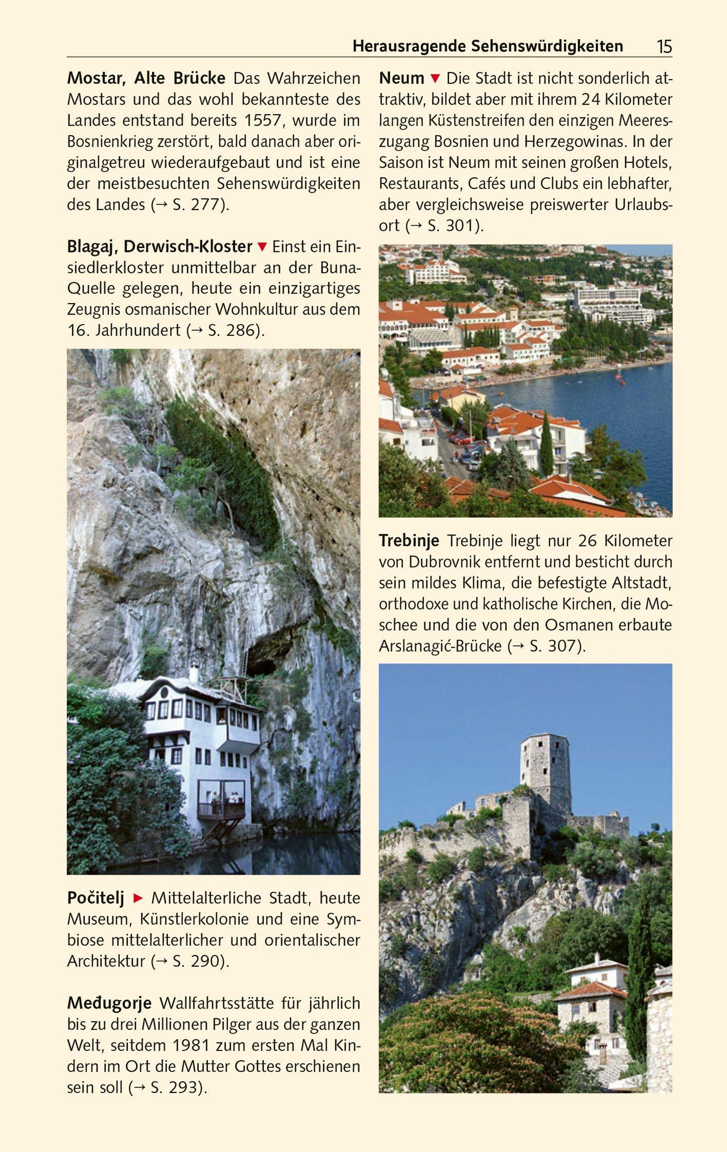 Die bunte Altstadt von Sarajevo, wo Okzident und Orient aufeinandertreffen, die Kulturmetropole Banja Luka und der Wallfahrtsort Medugorje gehören zu den herausragenden Attraktionen. Die seit dem Bosnienkrieg geteilte Stadt Mostar mit der Alten Brücke über die Neretva ist seit 2005 UNESCO-Welterbe. Autor Marko Plešnik, dessen Vaterfamilie aus dem ehemaligen Jugoslawien stammt, kennt das Land von Kindesbeinen an. Alle Regionen, Orte und Sehenswürdigkeiten werden von ihm umfassend beschrieben, von Neum an der Adria bis zu den Skigebieten in der Bjelašnica, wo 1984 die Olympischen Winterspiele stattfanden. Co-Autor Matthias Jacob hat alles Wissenswerte topaktuell auf den neuesten Stand gebracht.