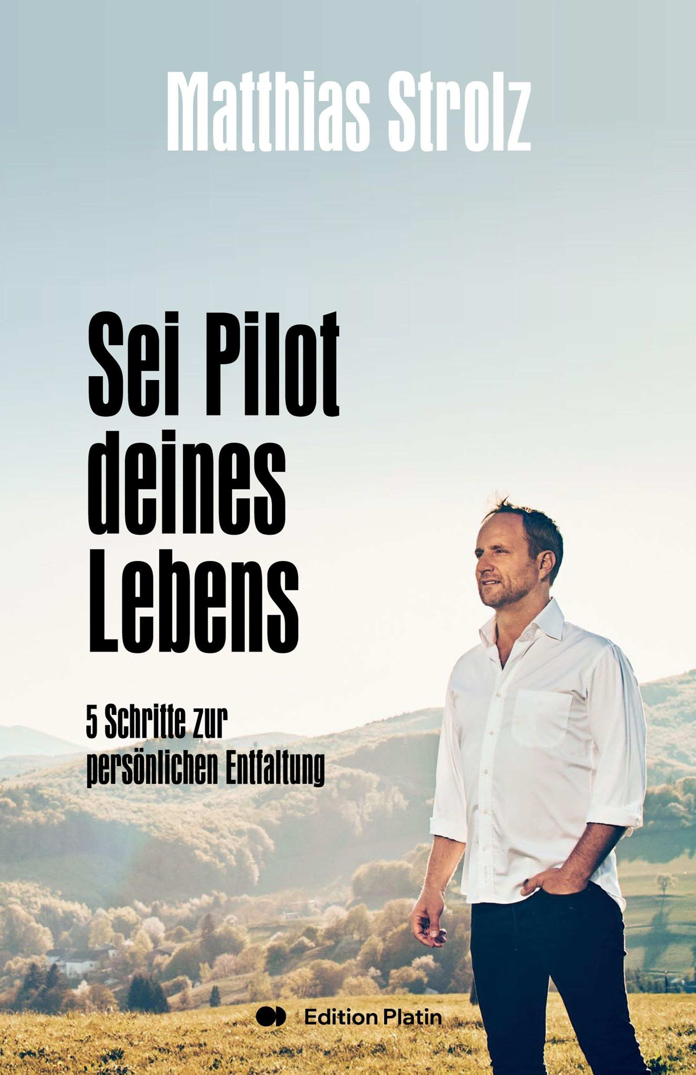Text: „Matthias Strolz“, „Sei Pilot deines Lebens“, „5 Schritte zur persönlichen Entfaltung“. Ein Mann steht auf einem Feld., Buch