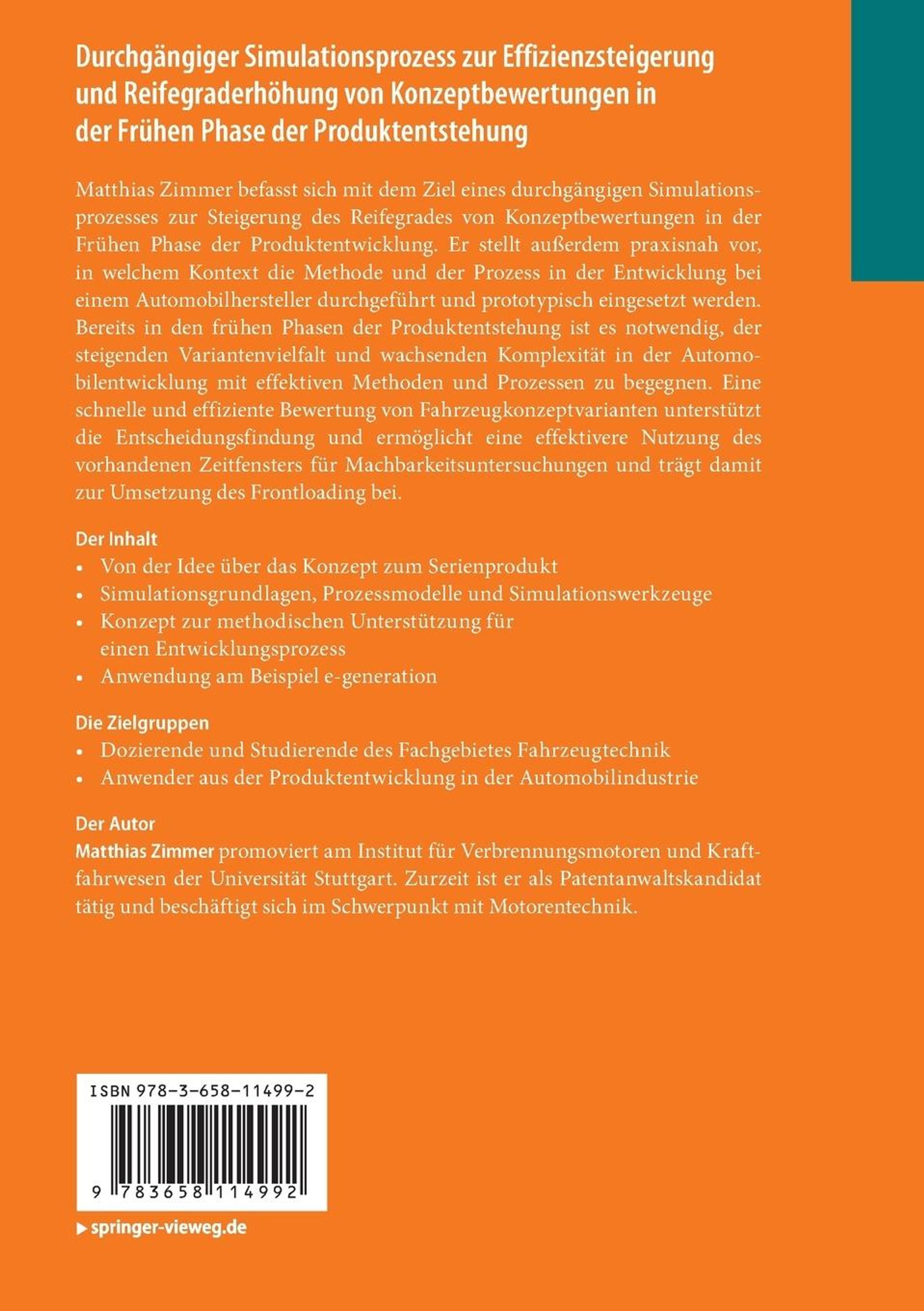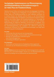 Matthias Zimmer befasst sich mit dem Ziel eines durchgängigen Simulationsprozesses zur Steigerung des Reifegrades von Konzeptbewertungen in der Frühen Phase der Produktentwicklung. Er stellt außerdem praxisnah vor, in welchem Kontext die Methode und der Prozess in der Entwicklung bei einem Automobilhersteller durchgeführt und prototypisch eingesetzt werden. Bereits in den frühen Phasen der Produktentstehung ist es notwendig, der steigenden Variantenvielfalt und wachsenden Komplexität in der Automobilentwicklung mit effektiven Methoden und Prozessen zu begegnen. Eine schnelle und effiziente Bewertung von Fahrzeugkonzeptvarianten unterstützt die Entscheidungsfindung und ermöglicht eine effektivere Nutzung des vorhandenen Zeitfensters für Machbarkeitsuntersuchungen und trägt damit zur Umsetzung des Frontloading bei.