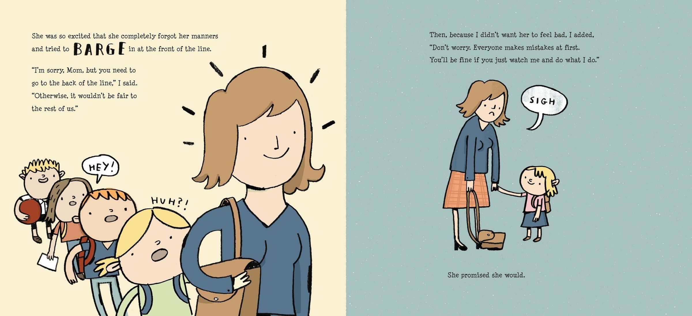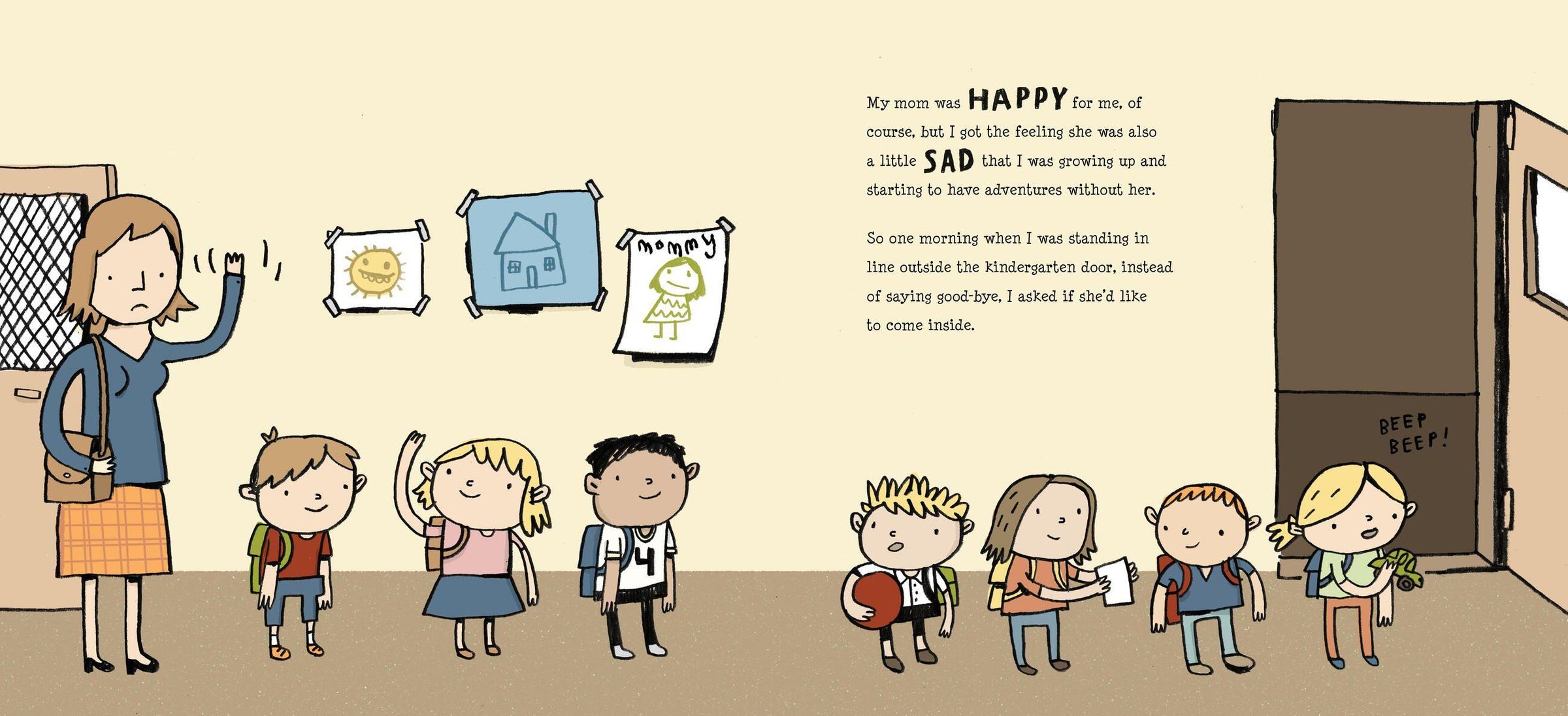 "I liked kindergarten from the very 1st day," begins the narrator of this very funny and touching picture book. However, she notices, "My mom was happy for me, of course, but I got the feeling that she was also a little sad" to leave her. So one day the little girl invites her mom to join the kindergarten class for the day, which turns out to be a real learning experience --- for both of them. Somehow her mom just can't get any of the rules right: she barges to the front of the line, she shouts out without raising her hand, she slams down her scissors during Craft Time. How embarrassing! In a wonderful role reversal that will delight young children, the girl must become the patient and sometimes frustrated expert who instructs her mom on how to behave.