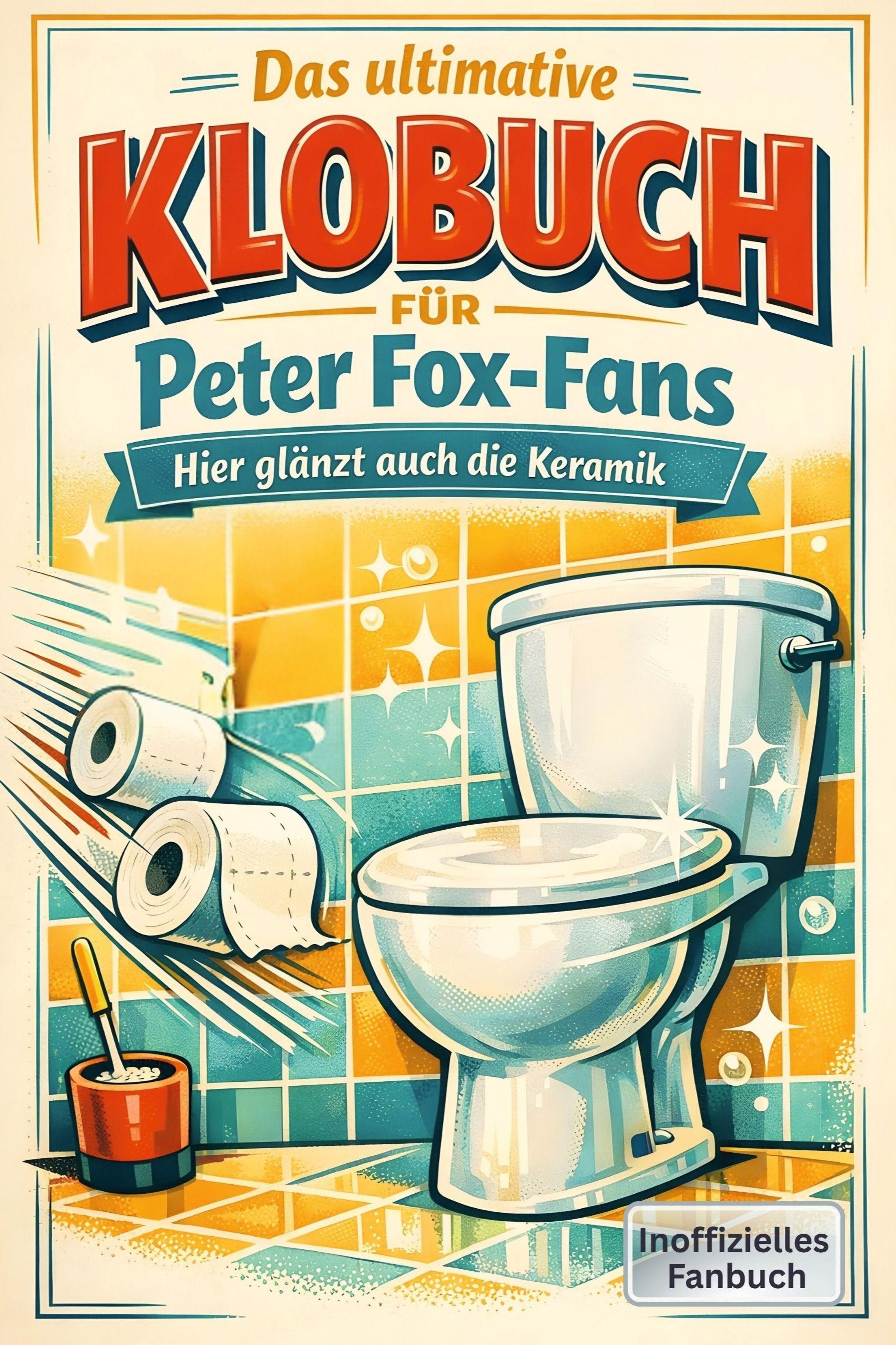 Ein illustriertes Cover für ein "Klobuch" mit einer glänzenden Toilette und fliegendem Toilettenpapier, orange-blauer Hintergrund., Buch