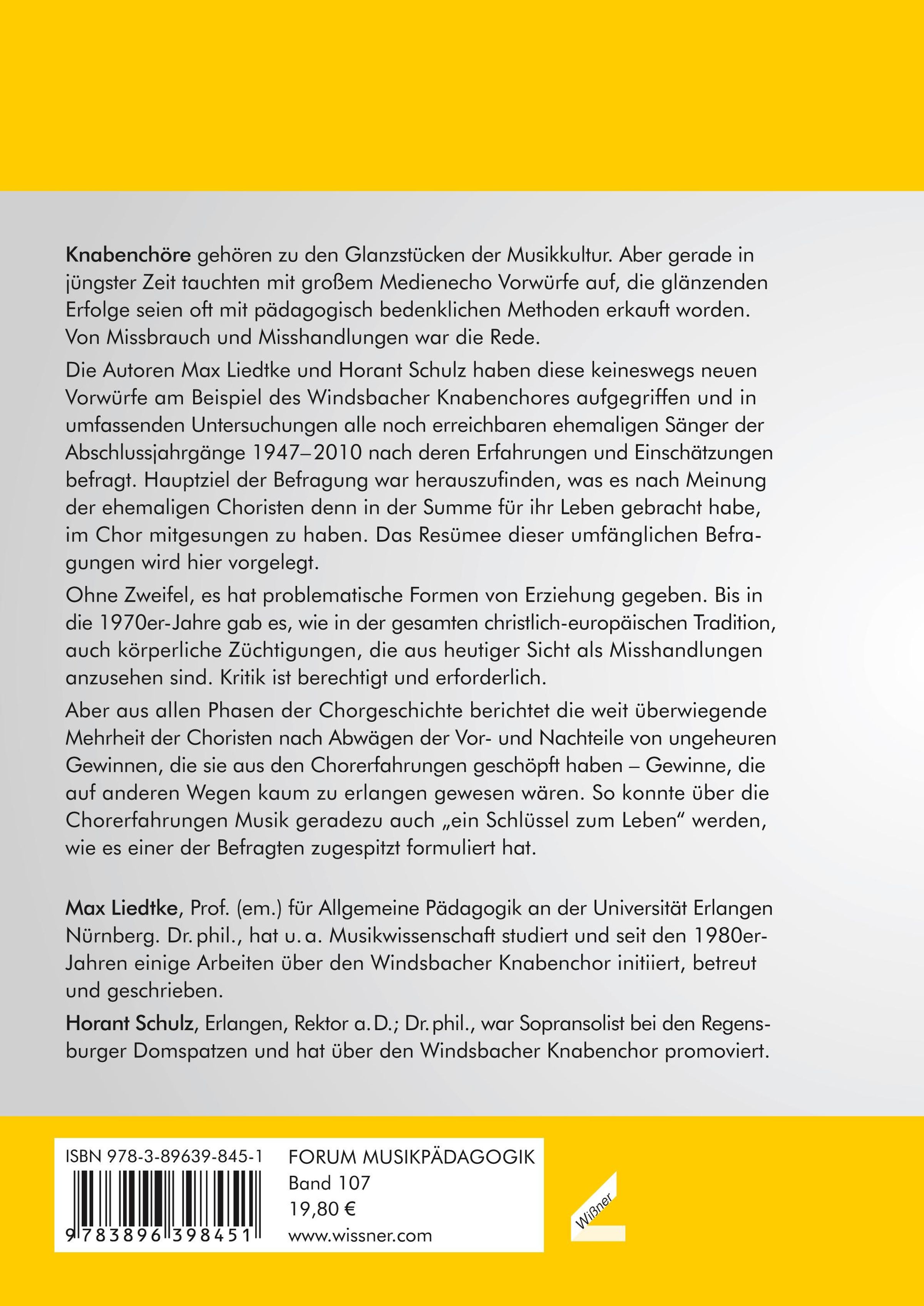 Knabenchöre gehören zu den Glanzstücken der Musikkultur. Aber gerade in jüngster Zeit tauchten mit großem Medienecho Vorwürfe auf, die glänzenden Erfolge seien oft mit pädagogisch bedenklichen Methoden erkauft worden. Von Missbrauch und Misshandlungen war die Rede. Die Autoren Max Liedtke und Horant Schulz haben diese keineswegs neuen Vorwürfe am Beispiel des Windsbacher Knabenchores aufgegriffen und in umfassenden Untersuchungen alle noch erreichbaren ehemaligen Sänger der Abschlussjahrgänge 1947- 2010 nach deren Erfahrungen und Einschätzungen befragt. Hauptziel der Befragung war herauszufinden, was es nach Meinung der ehemaligen Choristen denn in der Summe für ihr Leben gebracht habe, im Chor mitgesungen zu haben. Das Resümee dieser umfänglichen Befragungen wird hier vorgelegt. Ohne Zweifel, es hat problematische Formen von Erziehung gegeben. Bis in die 1970er-Jahre gab es, wie in der gesamten christlich-europäischen Tradition, auch körperliche Züchtigungen, die aus heutiger Sicht als Misshandlungen anzusehen sind. Kritik ist berechtigt und erforderlich. Aber aus allen Phasen der Chorgeschichte berichtet die weit überwiegende Mehrheit der Choristen nach Abwägen der Vor- und Nachteile von ungeheuren Gewinnen, die sie aus den Chorerfahrungen geschöpft haben - Gewinne, die auf anderen Wegen kaum zu erlangen gewesen wären. So konnte über die Chorerfahrungen Musik geradezu auch "ein Schlüssel zum Leben" werden, wie es einer der Befragten zugespitzt formuliert hat.