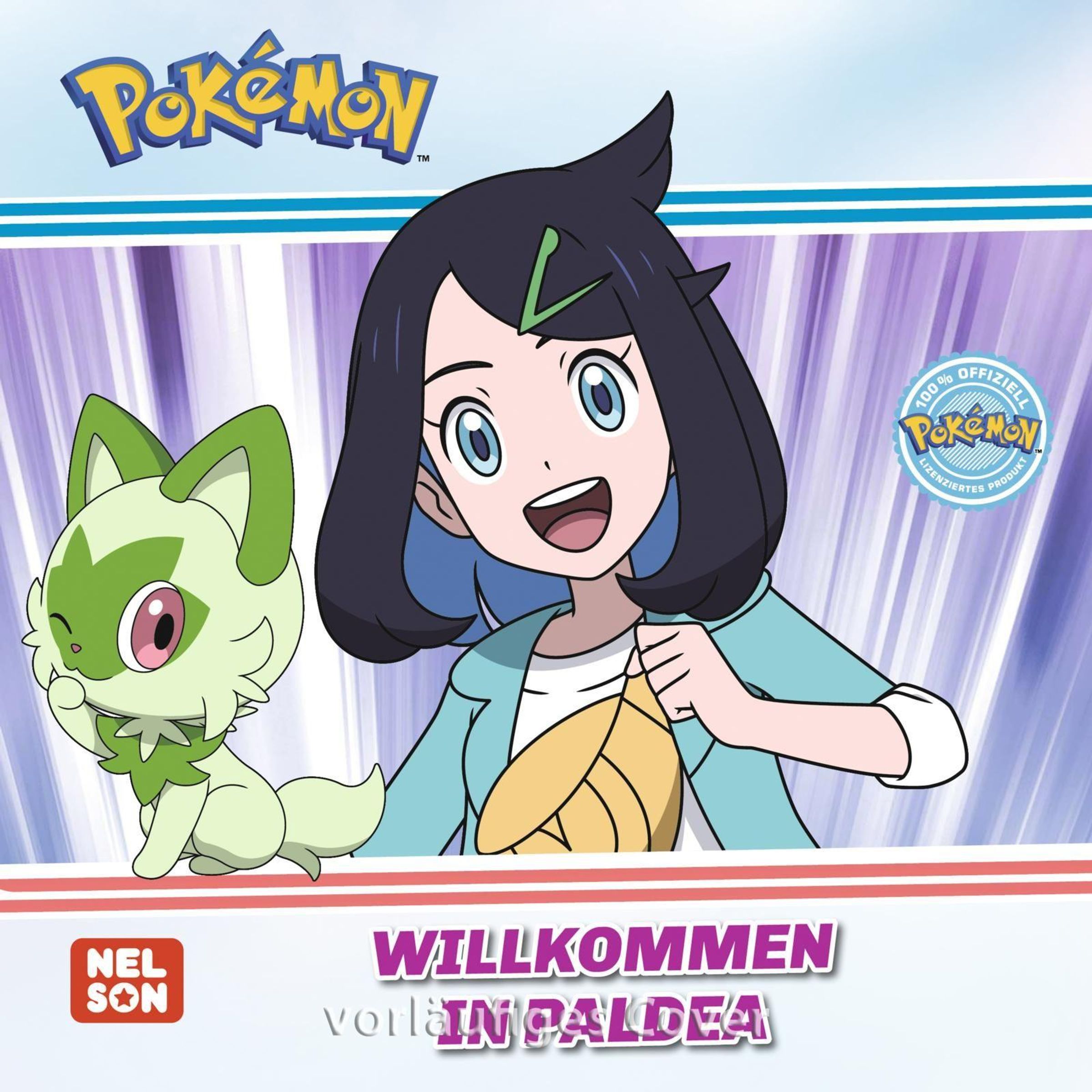 „Willkommen in Paldea“. Logo von Pokémon, Charakter mit schwarzem Haar und Katze mit grünem Fell., Diverse