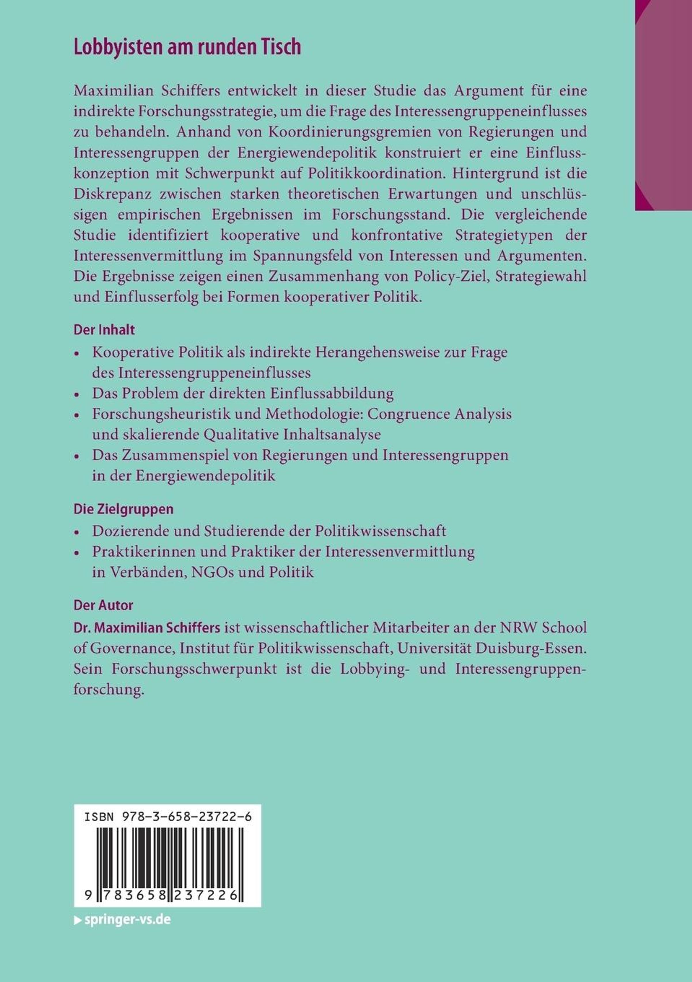 Maximilian Schiffers entwickelt in dieser Studie das Argument für eine indirekte Forschungsstrategie, um die Frage des Interessengruppeneinflusses zu behandeln. Anhand von Koordinierungsgremien von Regierungen und Interessengruppen der Energiewendepolitik konstruiert er eine Einflusskonzeption mit Schwerpunkt auf Politikkoordination. Hintergrund ist die Diskrepanz zwischen starken theoretischen Erwartungen und unschlüssigen empirischen Ergebnissen im Forschungsstand. Die vergleichende Studie identifiziert kooperative und konfrontative Strategietypen der Interessenvermittlung im Spannungsfeld von Interessen und Argumenten. Die Ergebnisse zeigen einen Zusammenhang von Policy-Ziel, Strategiewahl und Einflusserfolg bei Formen kooperativer Politik.