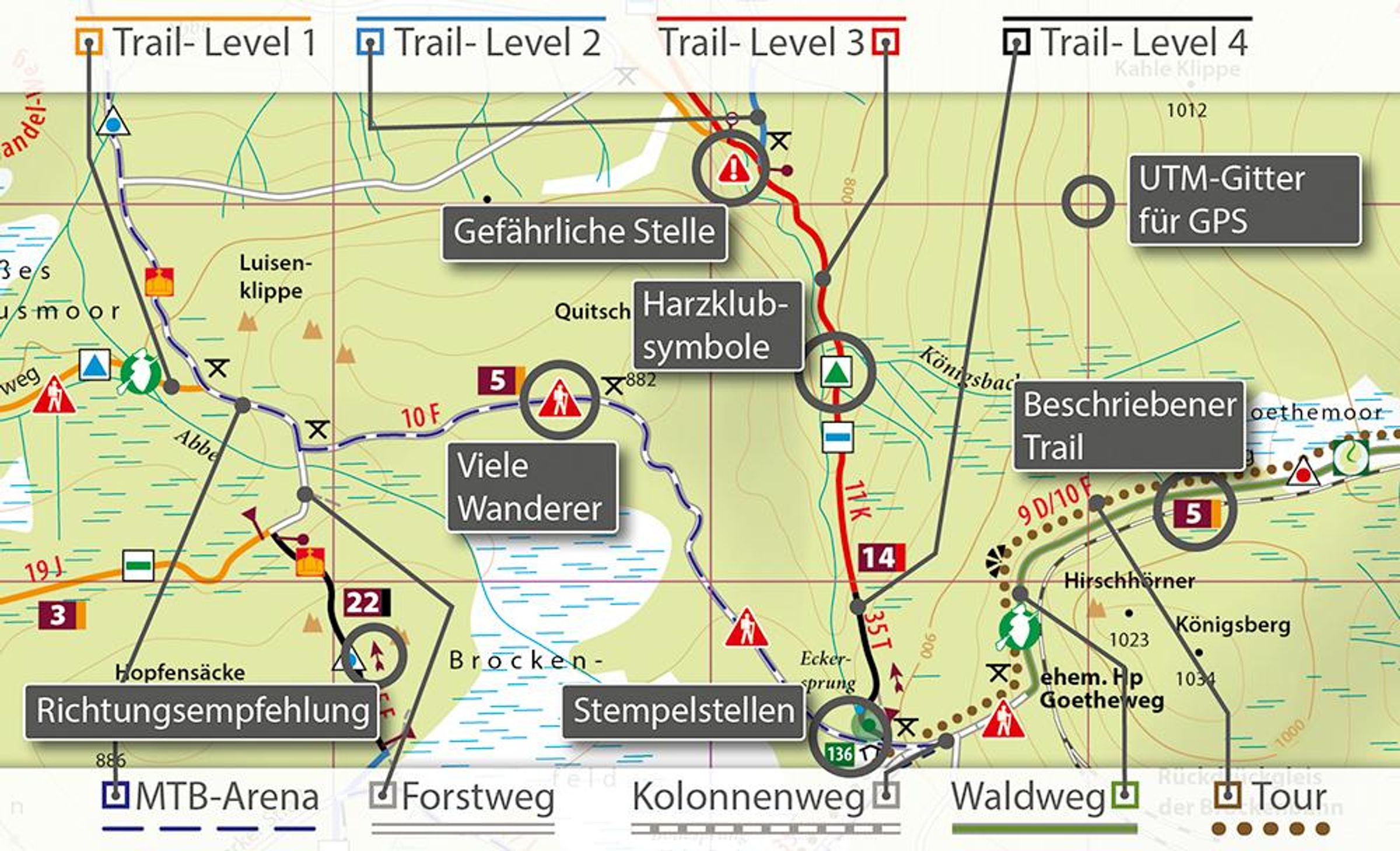 Kartografische Ausstattung Maßstab 1: 25.000 Höhenlinien in 20-Meter-Schritten und Gelände-Schummerung UTM-Gitter für GPS Harzklub-Markierung und Nummerierung Wandernadel-Stempelstellen inklusive Nummern MTB-Wege: Forstweg, Kolonnenweg, Waldweg: breiter Weg - meist auf Waldboden, 4 Trail-Level: leicht, mittel, schwer, sehr schwer, beschilderte Wege der MTB-Arena Harz, für Mountainbiker gesperrte Wege, 3 Touren-Vorschläge MTB-Symbole: Fahrtrichtungsempfehlung, gefährliche Stellen, bei Wanderern sehr beliebt Kartografie-Symbole: Schutzhütten, Rast- und Grillplätze, Aussichtspunkte, Camping- bzw. Wohnmobilstellplätze sowie Jugendherbergen und vieles mehr Signaturen zu Kultur und Freizeit: Sehenswürdigkeiten, Museen, Schwimmhallen und Freibäder, Kletter- und Bikeparks, Reitmöglichkeiten