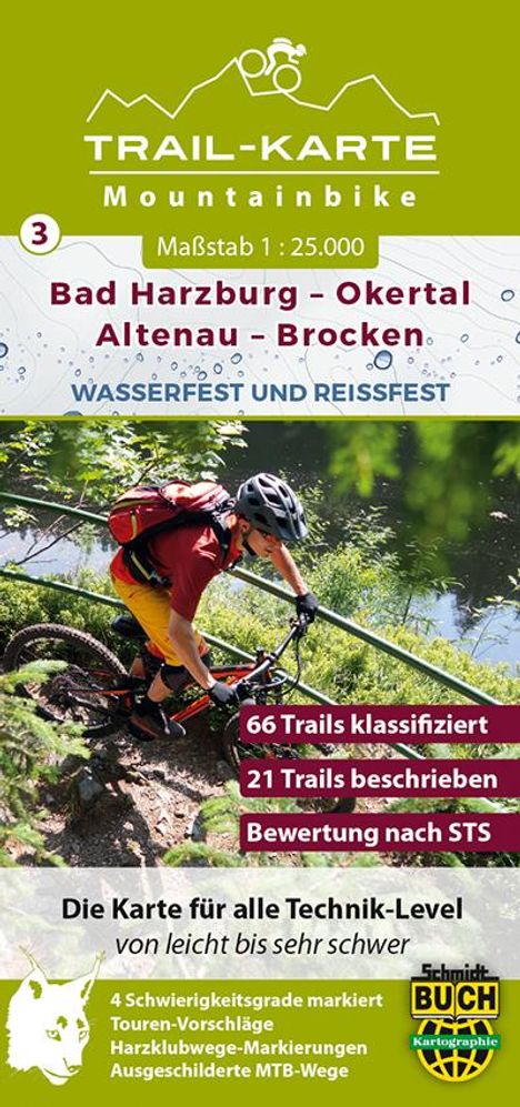 Vom schmalen, geschotterten Grabenweg bis zum steinigen, wurzeligen Stieg bietet der Harz eine Fülle von abwechslungsreichen Mountainbike-Trails, die jedoch nicht immer leicht zu finden sind. Deshalb haben wir die schönsten Trails zwischen Bad Harzburg und Oker, Altenau und Brocken vor Ort in Augenschein genommen, bewertet und in dieser wasser- und reißfesten MTB-Karte im detaillierten Maßstab 1: 25.000 verzeichnet. Sie finden über 66 klassifizierte Wege, darunter leichte wie den Salzstieg bis hin zu sehr schweren Trails wie den Jägerstieg. Darüber hinaus werden 21 Trails auf der Rückseite der Karte ausführlich beschrieben. Neben Informationen zu Länge und Höhenmetern geben die Texte Hinweise zur generellen Beschaffenheit der Trails sowie zu Hindernissen. Drei Basis-Touren führen außerdem zu ausgewählten Trails verschiedener Schwierigkeitsstufen und vereinfachen so den Einstieg in die Harzer Mountainbike-Welt, die es mit dieser Karte auf eigene Faust zu entdecken gilt.