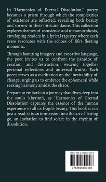 In "Harmonics of Eternal Dissolution," poetry becomes a prism through which the complexities of existence are refracted, revealing both beauty and sorrow in their intricate dance. This collection explores themes of transience and metamorphosis, enveloping readers in a lyrical tapestry where each verse resonates with the echoes of life's fleeting moments. Through haunting imagery and evocative language, the poet invites us to confront the paradox of creation and destruction, weaving together personal reflections and universal truths. Each poem serves as a meditation on the inevitability of change, urging us to embrace the ephemeral while seeking harmony amidst the chaos. Prepare to embark on a journey that dives deep into the soul's labyrinth, as "Harmonics of Eternal Dissolution" captures the essence of the human experience in all its fragile beauty. This book is not just a read; it is an immersion into the art of letting go, an invitation to find solace in the rhythm of dissolution.