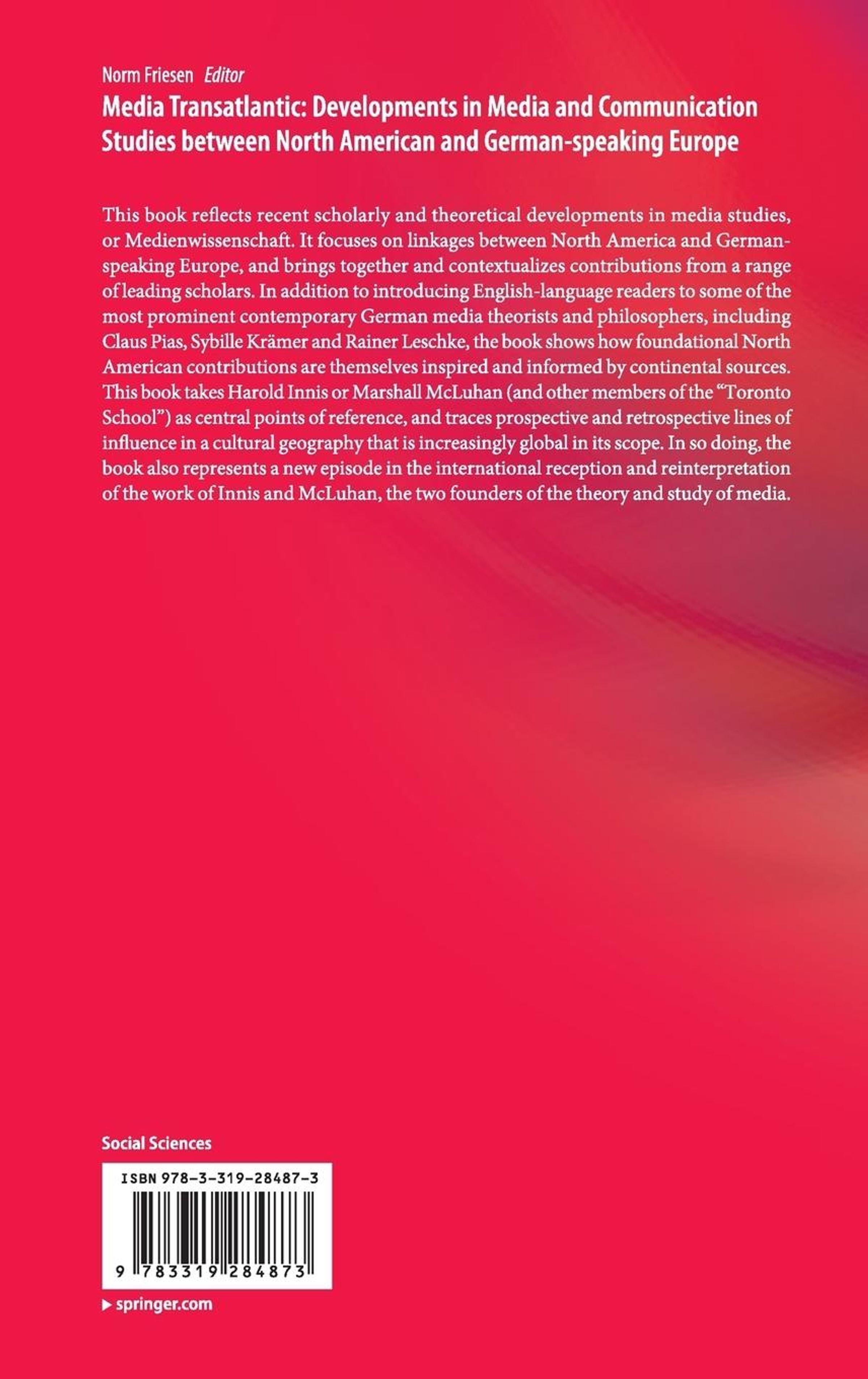 This book reflects recent scholarly and theoretical developments in media studies, or Medienwissenschaft. It focuses on linkages between North America and Germanspeaking Europe, and brings together and contextualizes contributions from a range of leading scholars. In addition to introducing Englishlanguage readers to some of the most prominent contemporary German media theorists and philosophers, including Claus Pias, Sybille Krämer and Rainer Leschke, the book shows how foundational North American contributions are themselves inspired and informed by continental sources. This book takes Harold Innis or Marshall McLuhan (and other members of the Toronto School) as central points of reference, and traces prospective and retrospective lines of influence in a cultural geography that is increasingly global in its scope. In so doing, the book also represents a new episode in the international reception and reinterpretation of the work of Innis and McLuhan, the two founders of the theoryand study of media.