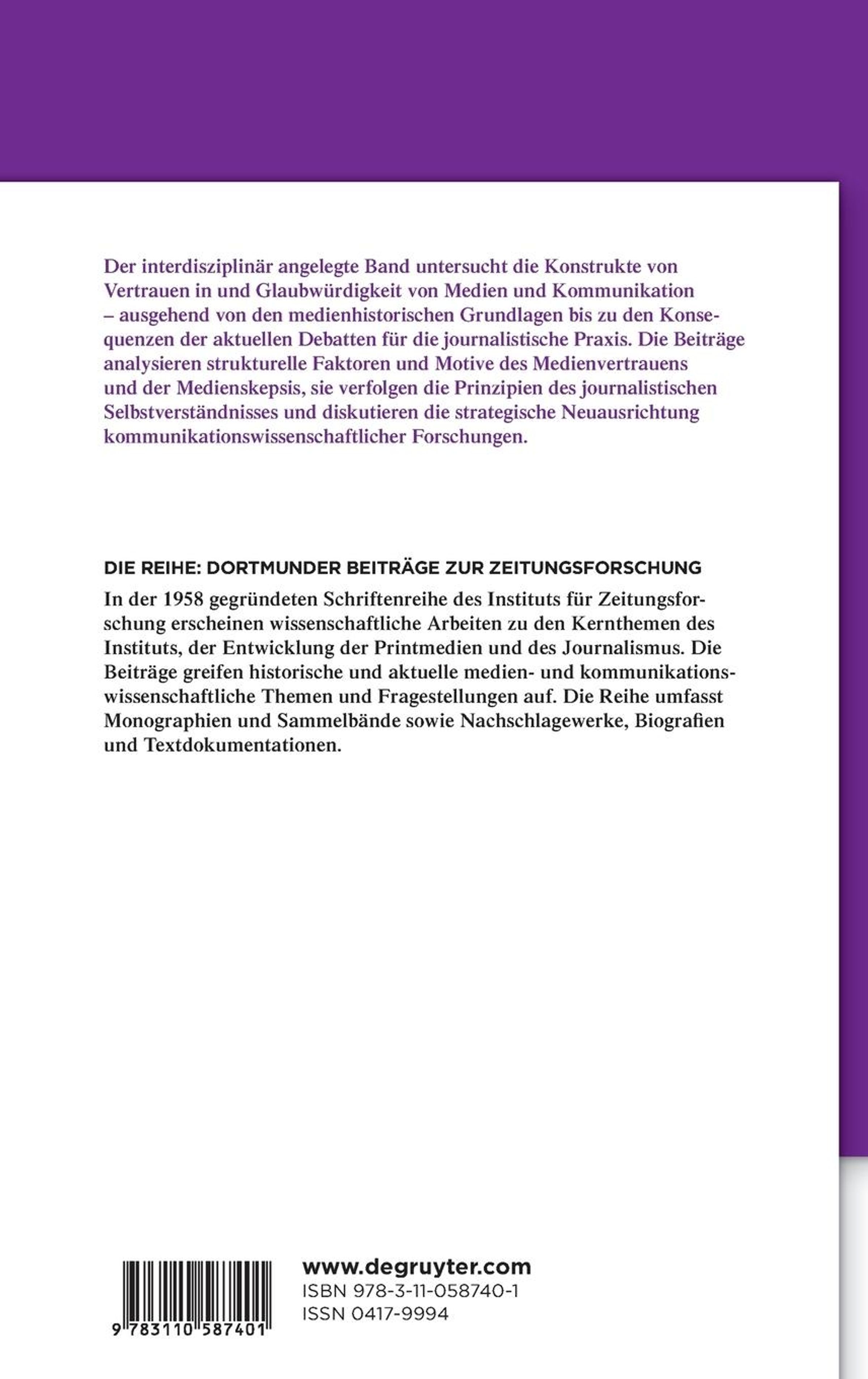 Der interdisziplinär angelegte Band untersucht das Konstrukt der Glaubwürdigkeit von Medien und Kommunikation ausgehend von den medienhistorischen Grundlagen bis zu den Konsequenzen der aktuellen Debatten für die journalistische Praxis. Die Beiträge analysieren strukturelle Faktoren und Motive des Medienvertrauens und der Medienskepsis und diskutieren die strategische Neuausrichtung kommunikationswissenschaftlicher Forschungen.