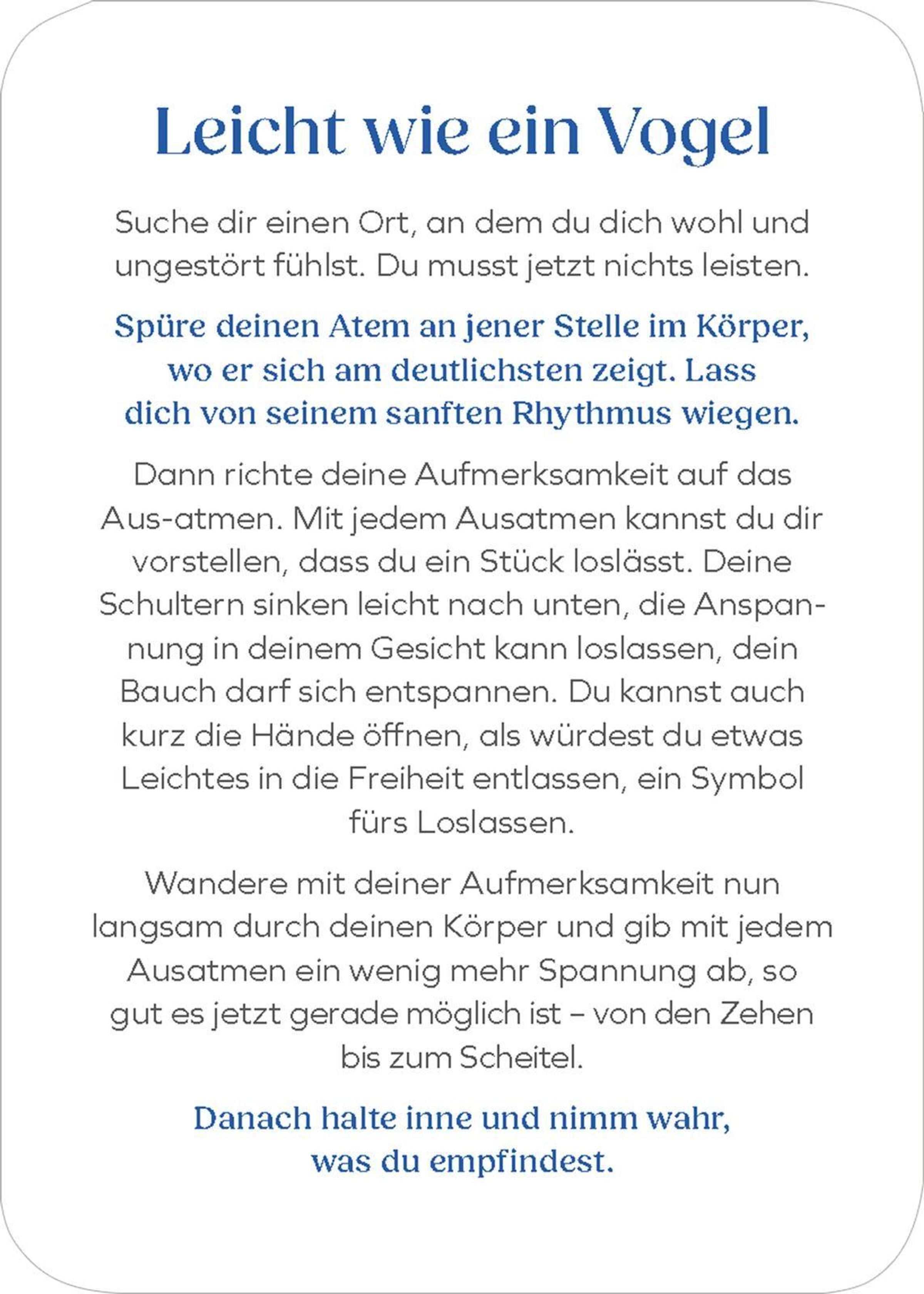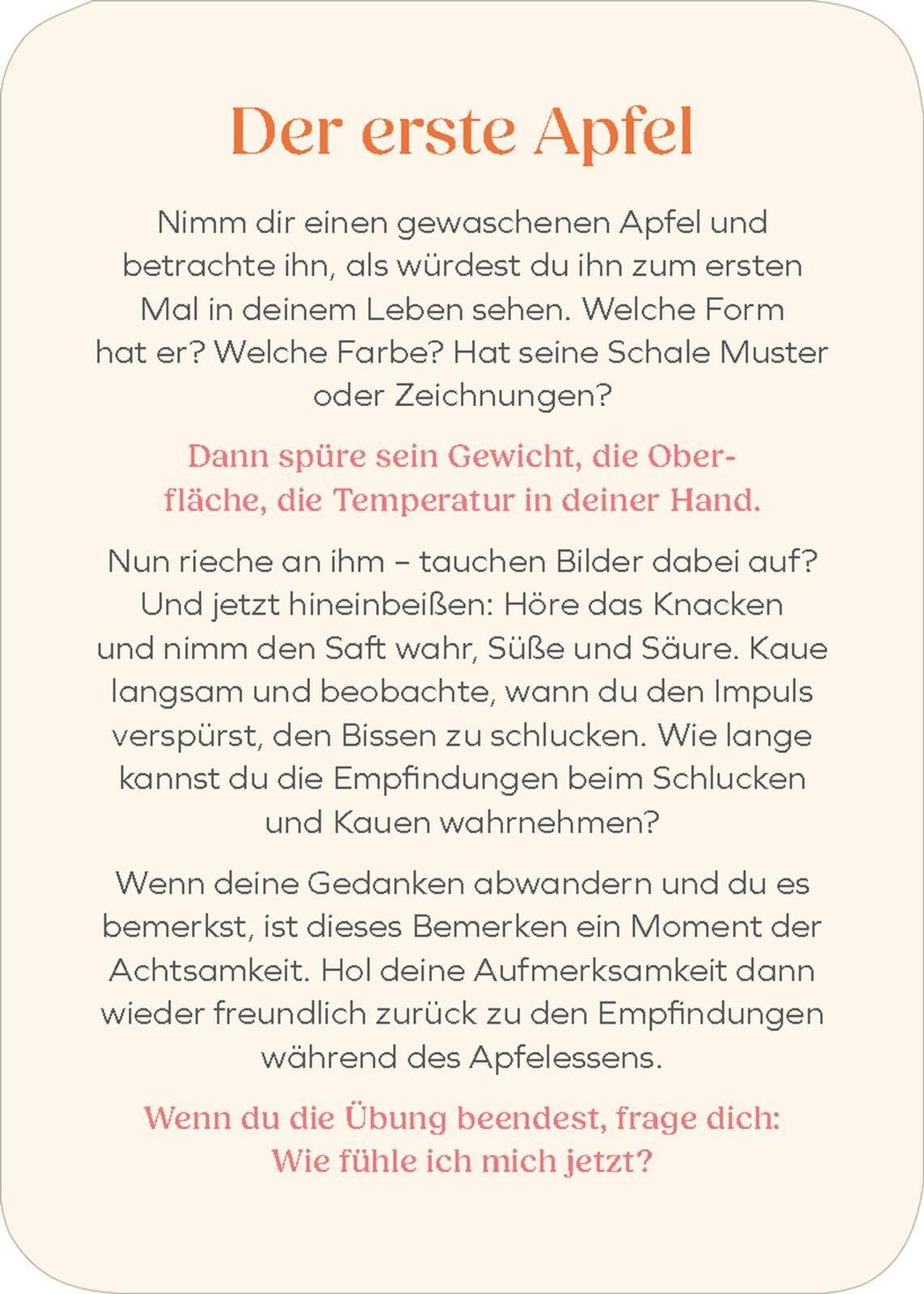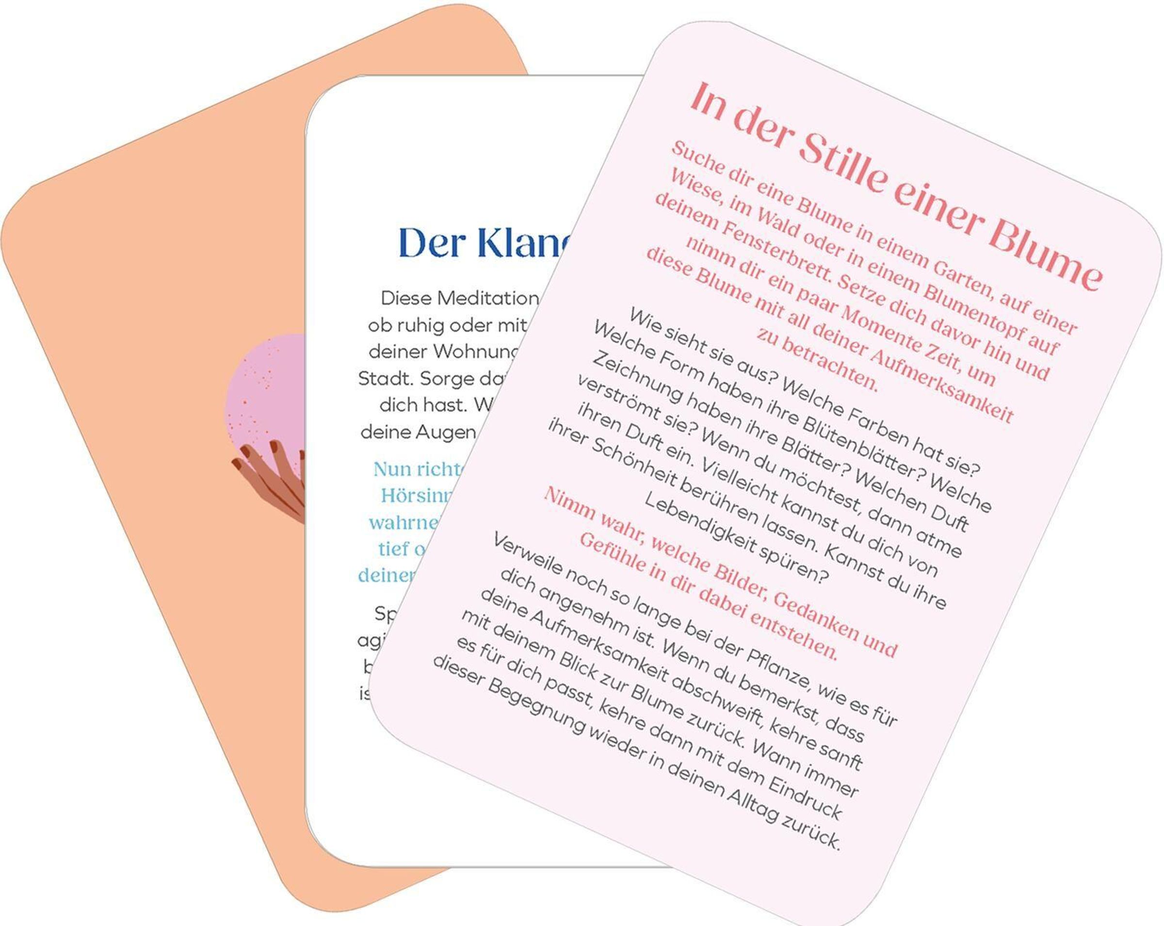 - **25 alltagstaugliche Meditationen:**Von Dankbarkeit über Loslassen bis hin zu kleinen Achtsamkeitsritualen - jede Karte schenkt neue Impulse
