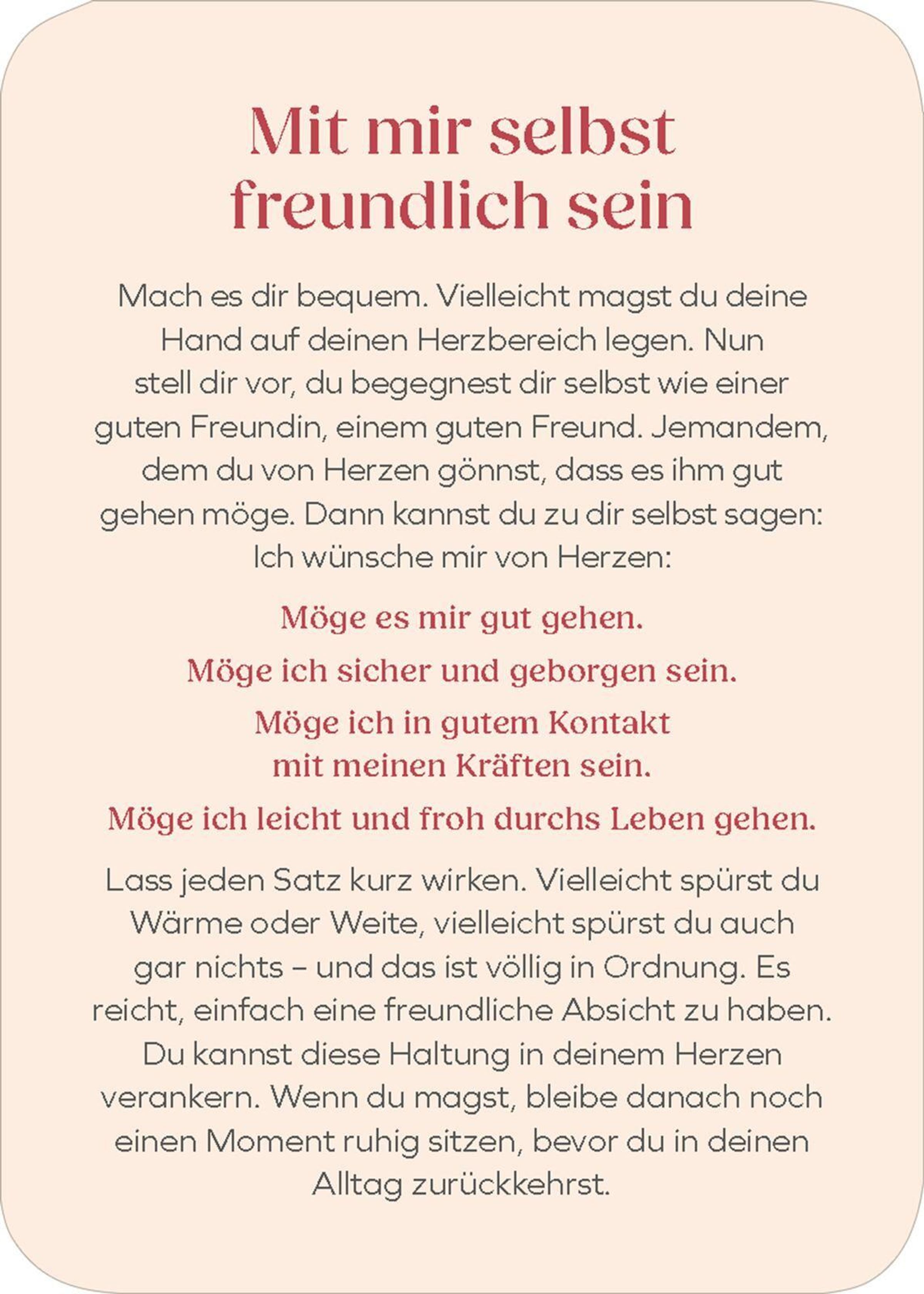 Jede Karte schenkt dir einen neuen Impuls für mehr Gelassenheit, Dankbarkeit und Selbstmitgefühl. Die Meditationen sind so formuliert, dass sie dich stärken, ohne zu überfordern - ein wertvoller Begleiter für alle, die sich mehr Balance und Achtsamkeit wünschen.