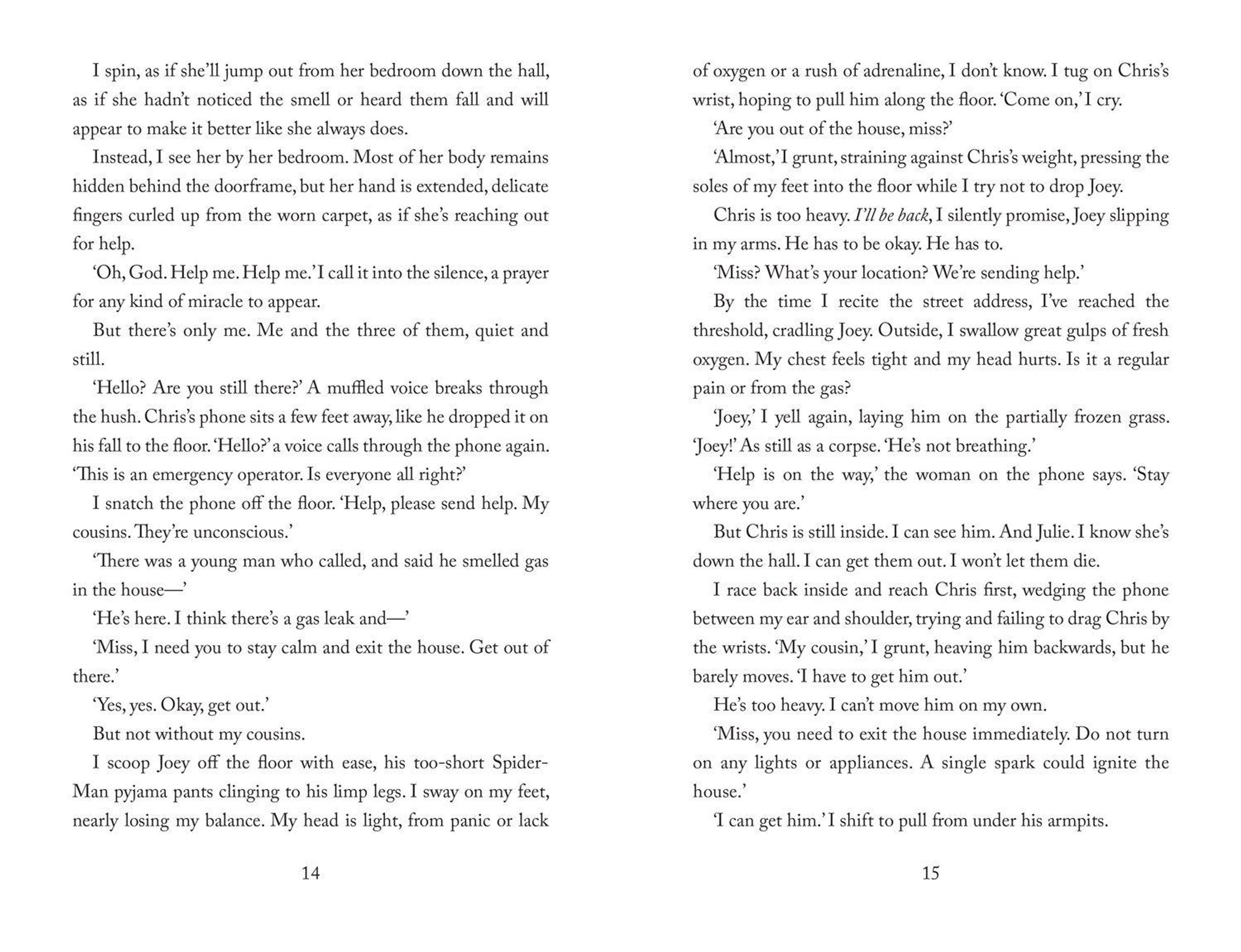 But when nobody answers the door, she knows something isn't right. Breaking in, she finds her cousins unconscious on the floor. And Aunt Julie is dead. Ella is barely able to rescue them from the house before she collapses into the snow.