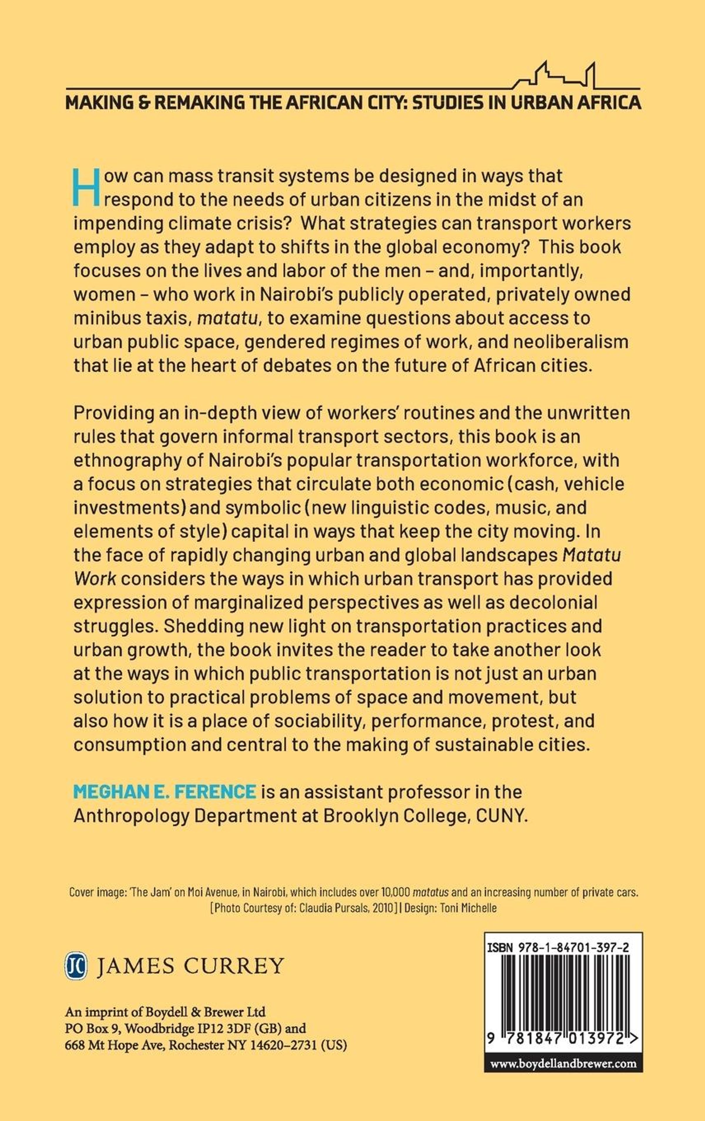 How can mass transit systems be designed in ways that respond to the needs of urban citizens in the midst of an impending climate crisis? What strategies can transport workers employ as they adapt to shifts in the global economy? This book focuses on the lives and labour of the men - and, importantly, women - who work in Nairobi's publicly operated, privately owned minibus taxis, matatu , to examine questions about access to urban public space, gendered regimes of work, and neoliberalism that lie at the heart of debates on the future of African cities.