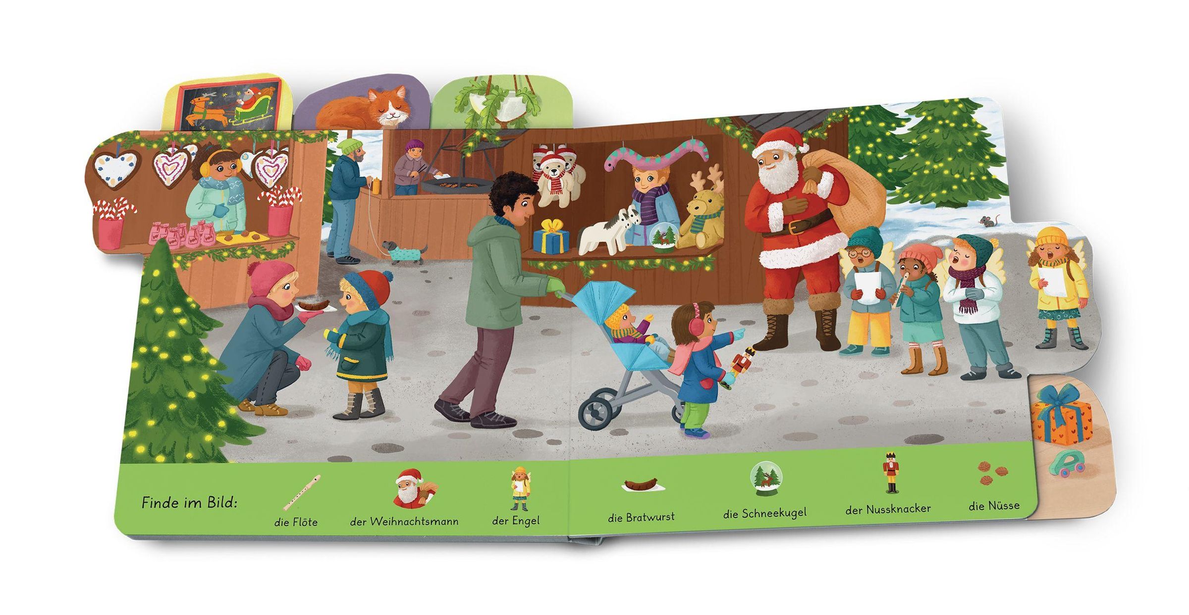 Wo steht der Adventskranz ? Wo duften die Plätzchen ? Ob beim Basteln , Backen oder Feiern am Heiligen Abend in der Familie: Es gibt so viel zu suchen und zu entdecken in den stimmungsvollen Bildern . Nebenbei lernen schon die Kleinsten ihre ersten Weihnachtswörter und erweitern so ihren Wortschatz . Auch kleine Hände können mit Hilfe des formgestanzten Registers die Seiten leicht umblättern.