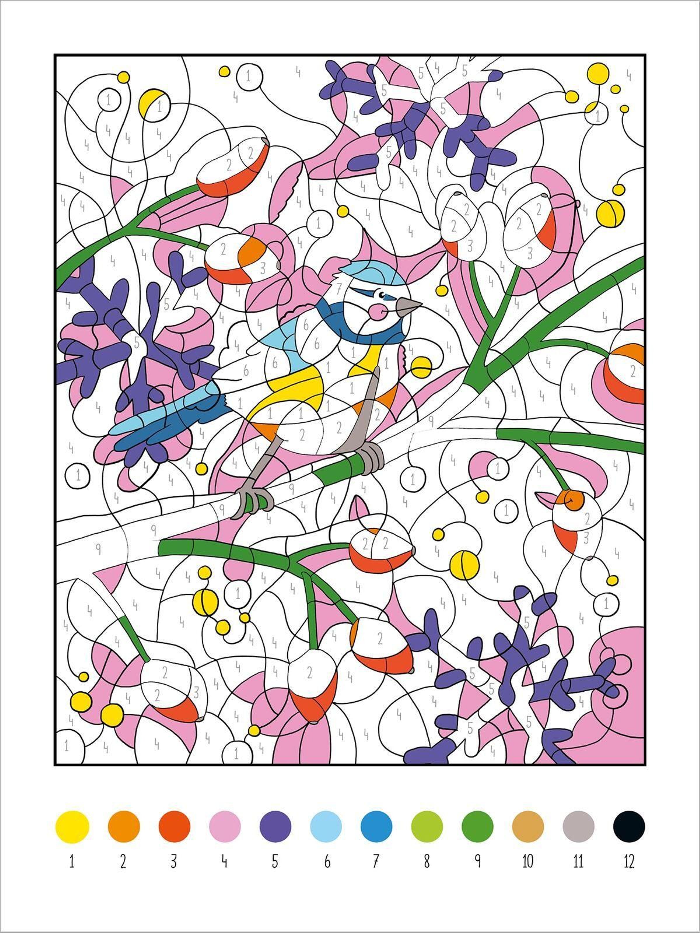 - Mit Farbpalette auf jeder Seite: Die Farbcodierung bleibt auf jeder Seite gleich und die Zahlen im Motiv verschwinden beim Übermalen