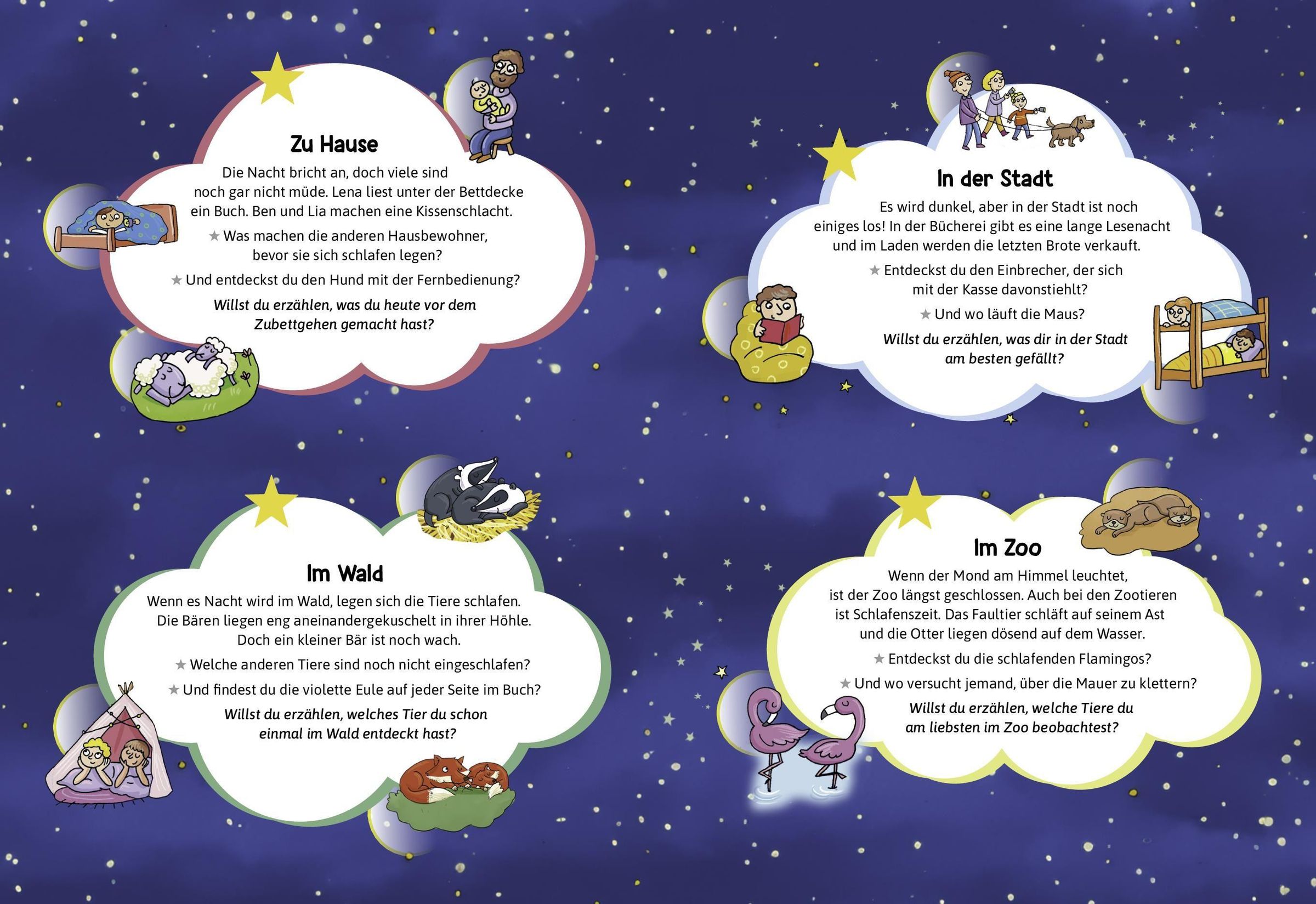 Dieses Gute-Nacht-Wimmelbuch begleitet dich durch gemütliche Abendrituale: Kuscheln, Zähneputzen, Schlafengehen, Träume. Der wattierte Einband fühlt sich weich an und liegt sicher in kleinen Händen. Im Großformat 24 x 33 cm entdeckst du 5 abwechslungsreiche Szenerien voller Details. Lustige Such- und Zählaufgaben regen zum Mitmachen an -- und dank Lösungen kannst du alles selbst kontrollieren. Ein klassischer Bilderbuch-Schatz, der Wahrnehmung und Sprache fördert.