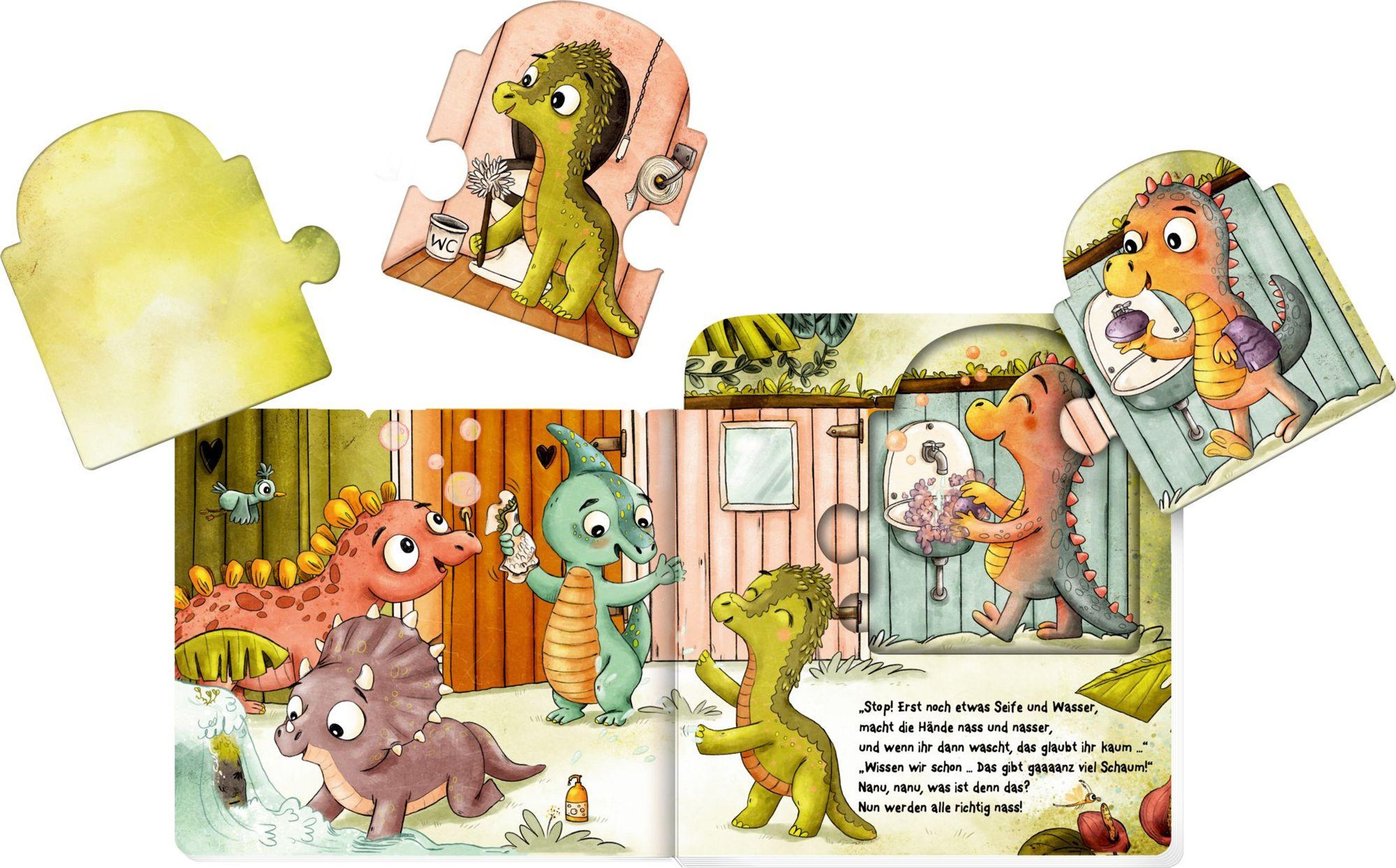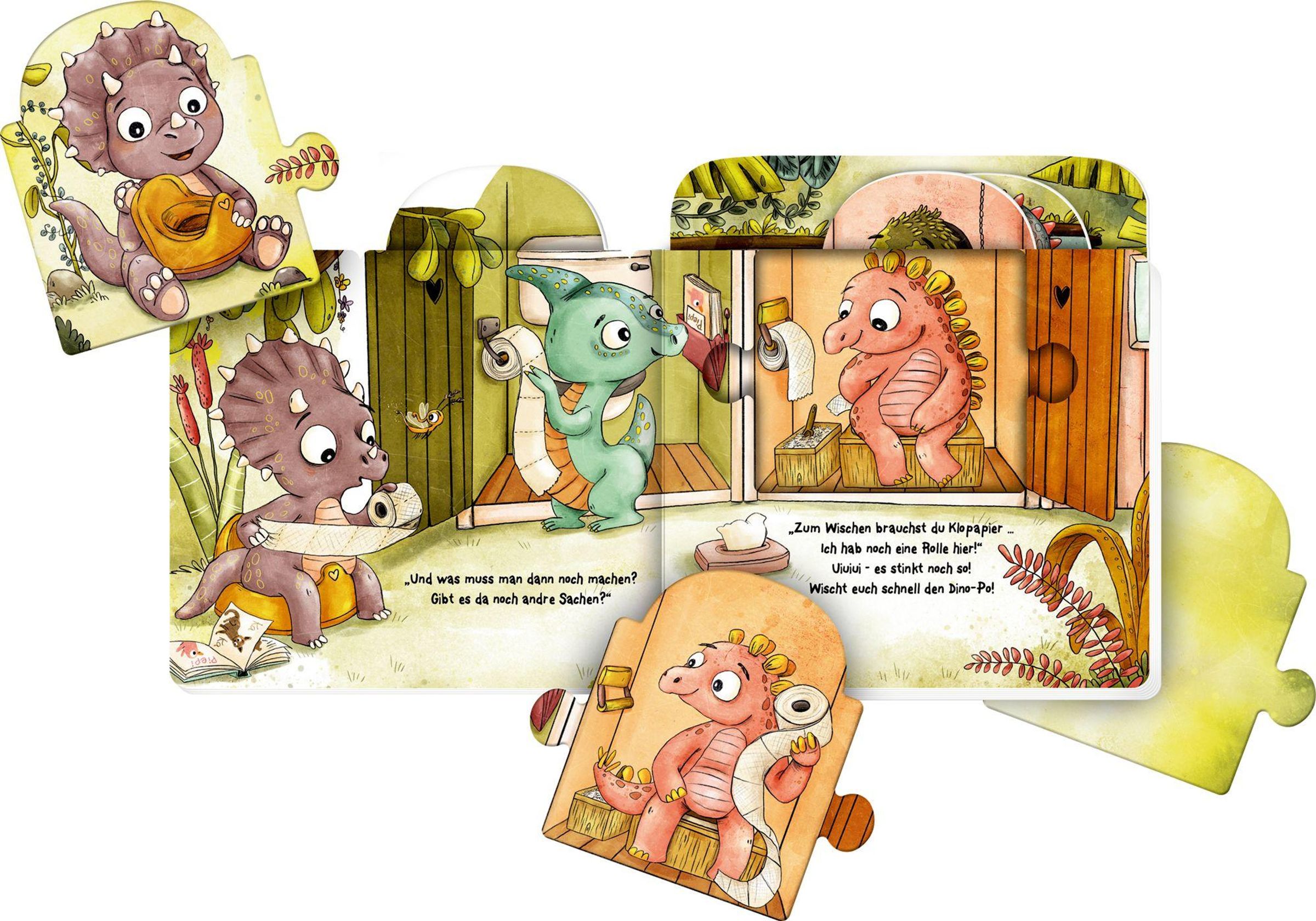 Dieses interaktive Mitmach-Puzzlebuch begleitet Kinder liebevoll beim Töpfchentraining und beim Übergang vom Töpfchen zur Toilette. Fünf fröhliche Dinos zeigen Schritt für Schritt, was dabei wichtig ist - kindgerecht, humorvoll und ganz ohne Druck. Die stabilen Puzzleteile ragen leicht über die Seiten hinaus, fördern die Feinmotorik und machen das Buch zu einem besonderen Spielerlebnis. So verbindet dieses Pappbilderbuch Vorlesen, Spielen und Lernen und stärkt Kinder auf ihrem Weg zur Selbstständigkeit.