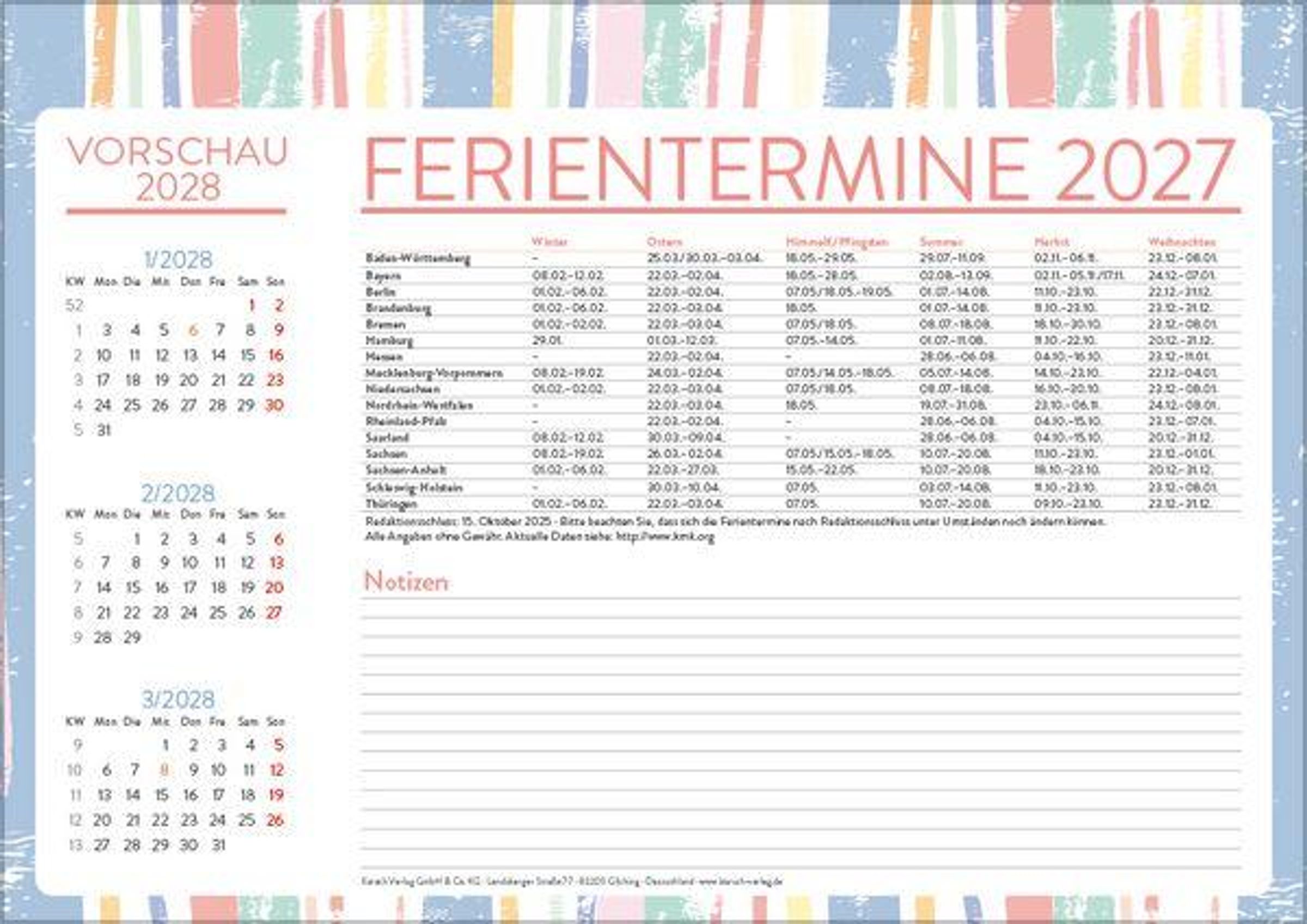 Praktischer Wandplaner in modernem Design mit viel Platz zum Eintragen. Inklusive Ferienterminen und Vorschau bis März des Folgejahres. Kalendarium in Deutsch.
