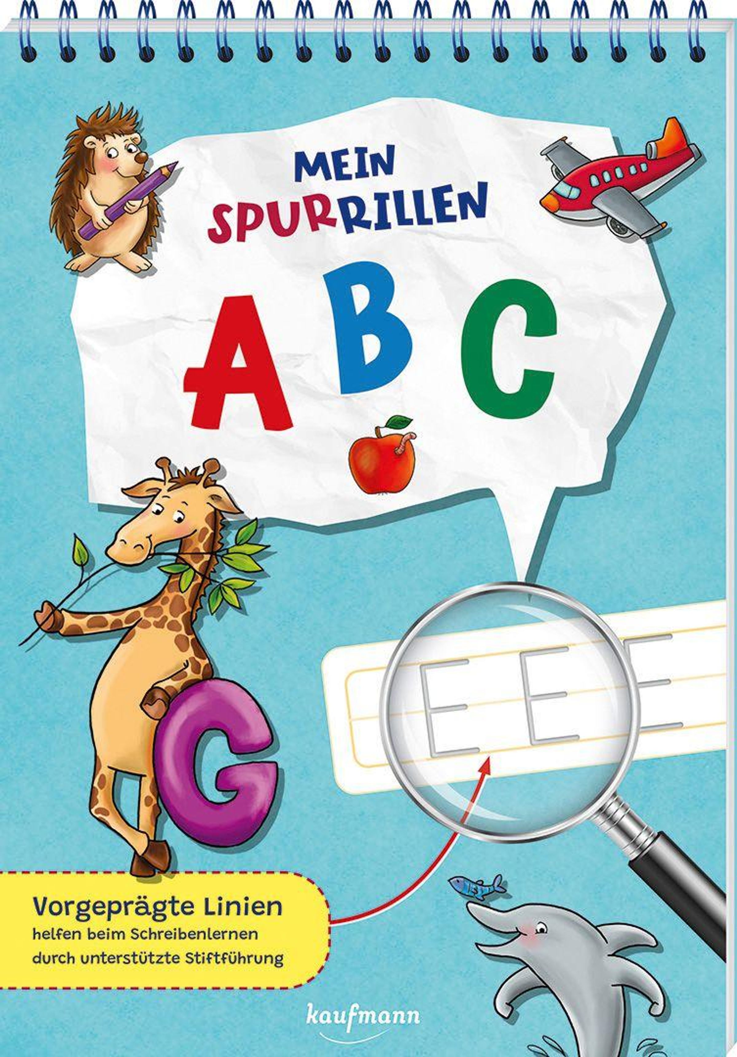 "Mein SpurRillen ABC", bunte Buchstaben, Tierillustrationen (Igel, Giraffe, Delfin), Lupe zeigt Linienmuster., Buch
