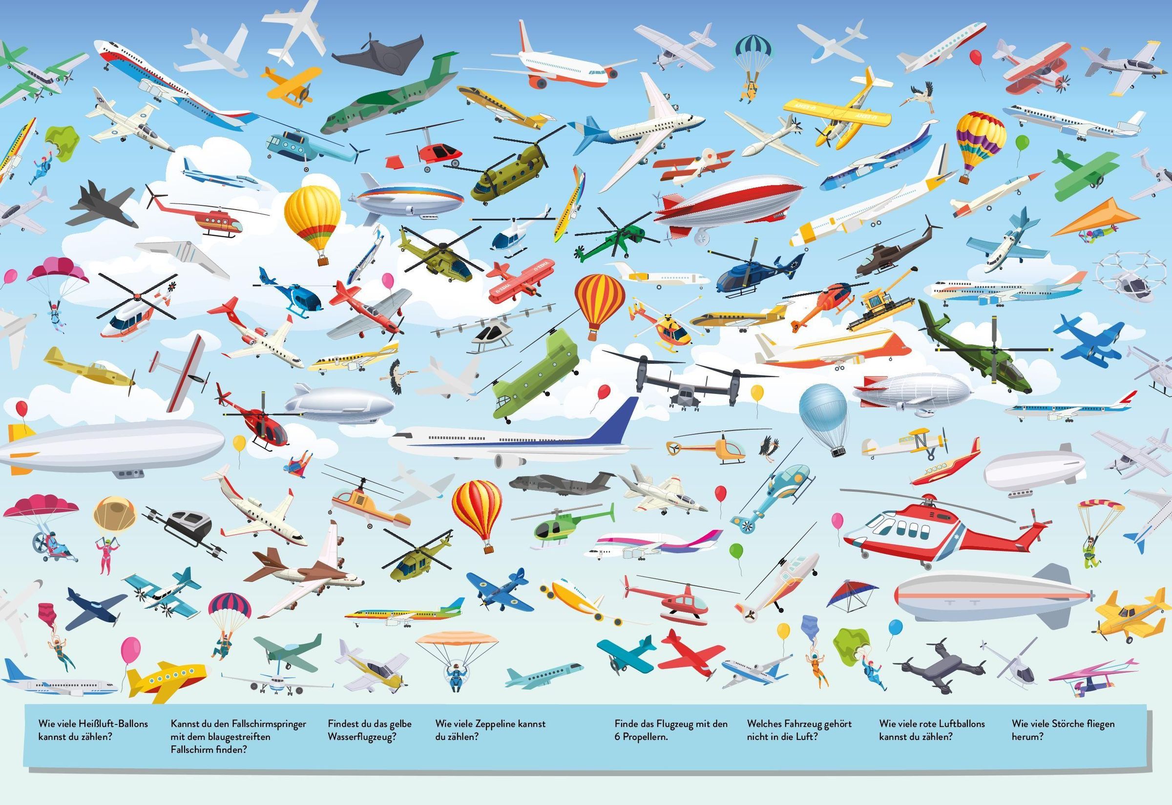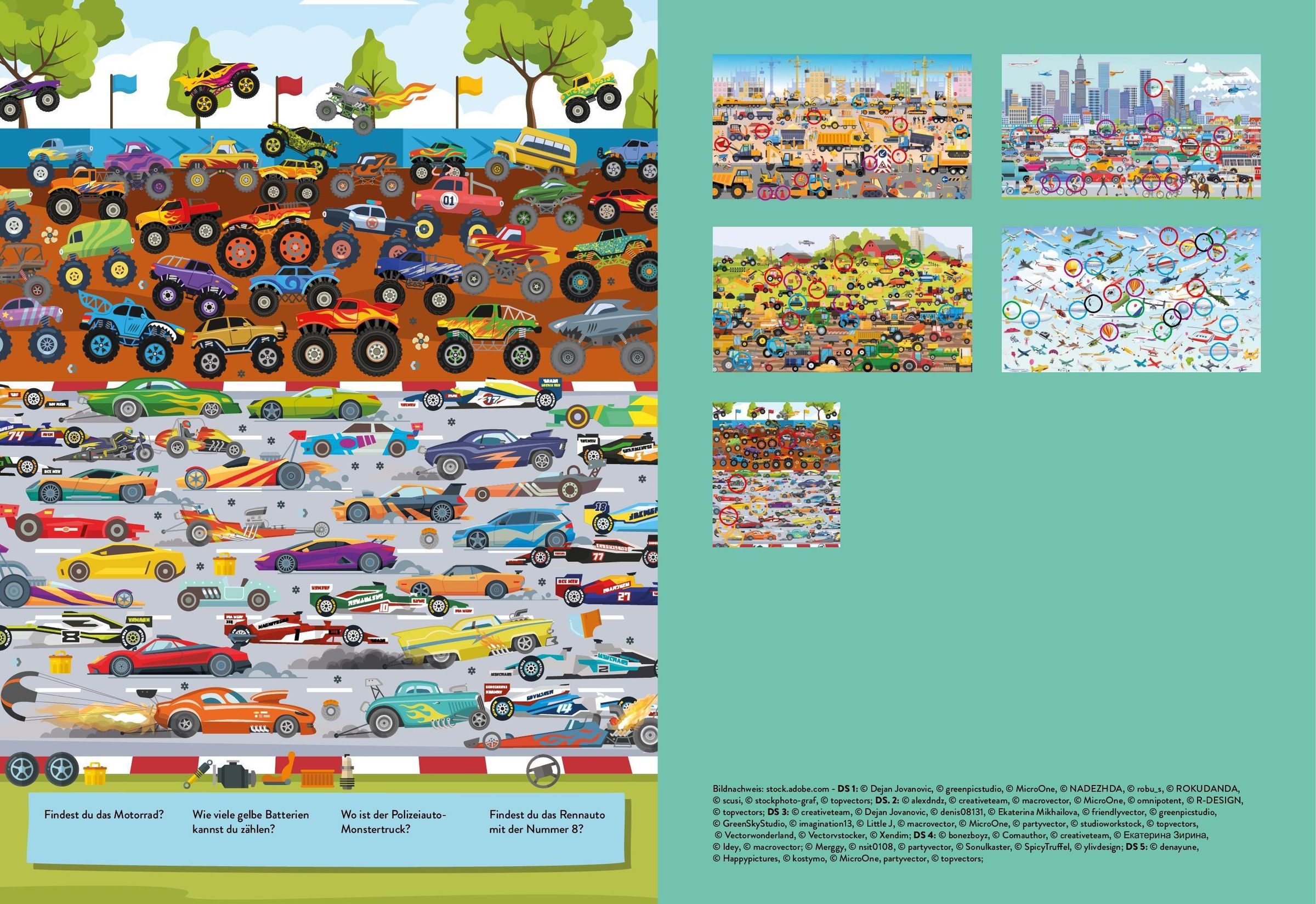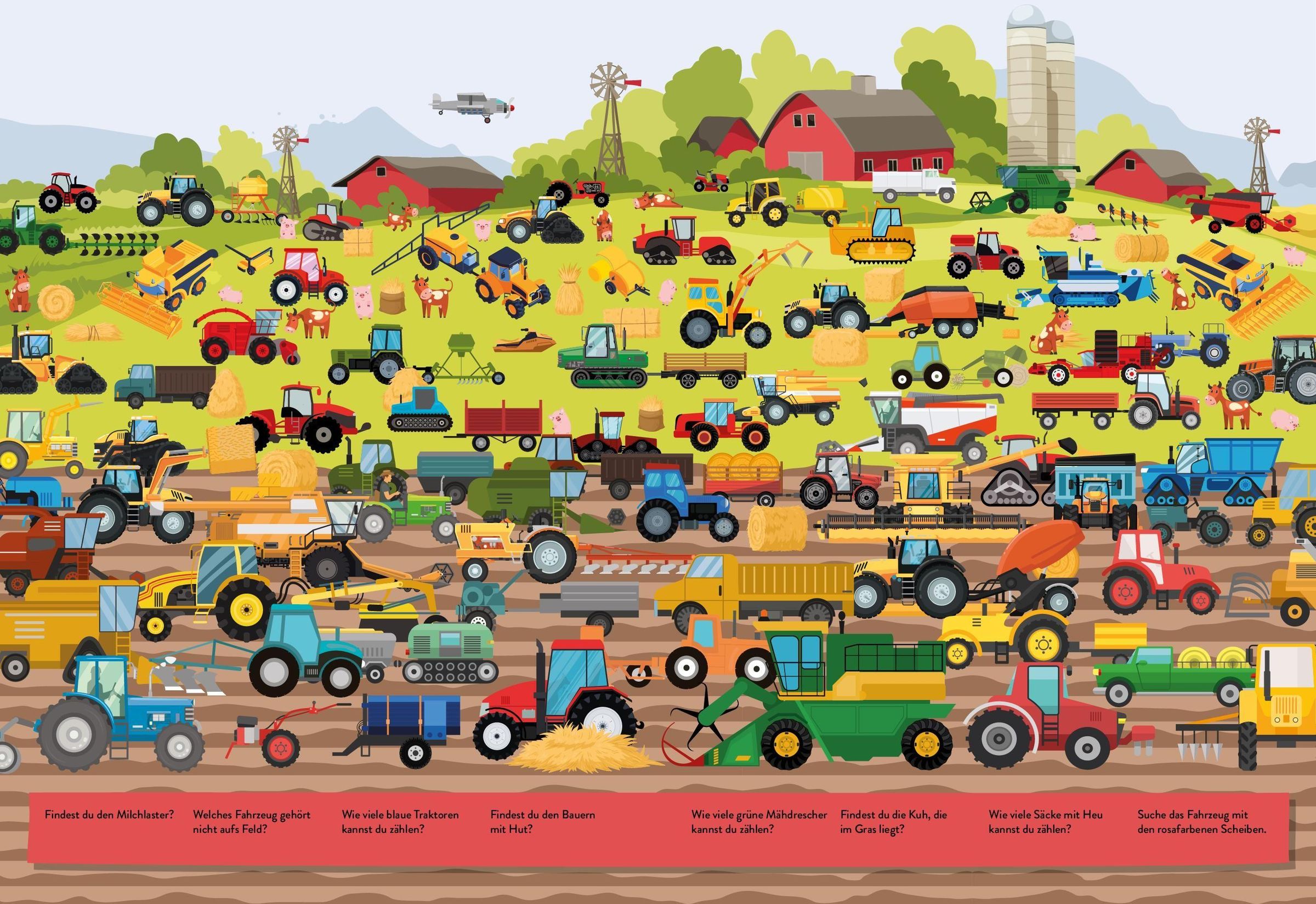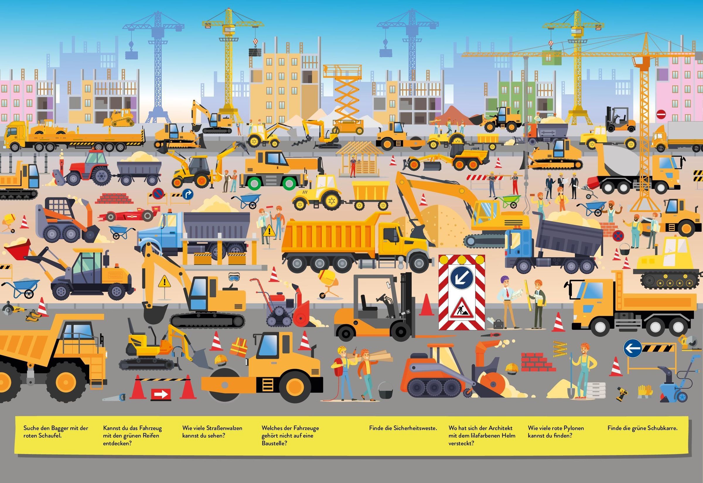 Ob auf der Baustelle, der Rennstrecke, in der Luft oder auf dem Feld - auf den extragroßen Wimmelseiten gibt es jede Menge zu entdecken. Findest du den Bagger mit der roten Schaufel? Wieviele Straßenwalzen kannst du zählen? Welches Fahrzeug gehört nicht auf eine Baustelle? Stundenlanger Beschäftigungsspaß garantiert.