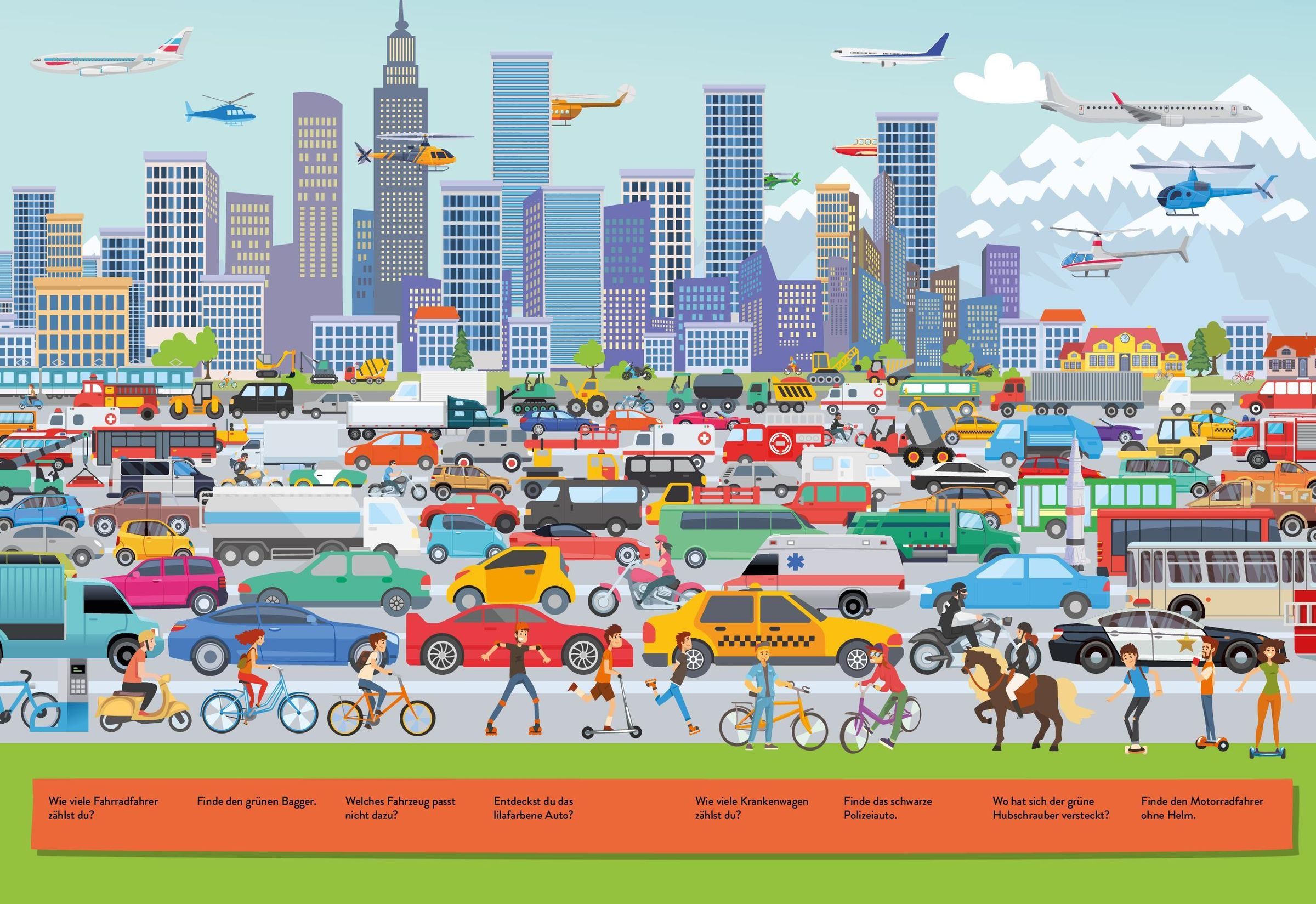Ob Stadt, Land oder Baustelle: Das Wimmelbuch „Fahrzeuge" zeigt in 5 vielfältigen Szenerien Transportwelten. Kinder entdecken unzählige Details, zählen und finden Feuerwehr, Bus, Bahn, Bagger und mehr. Der weiche, wattierte Einband ist robust und angenehm. Mit Aufgaben und Lösungen macht Lernen richtig Spaß.