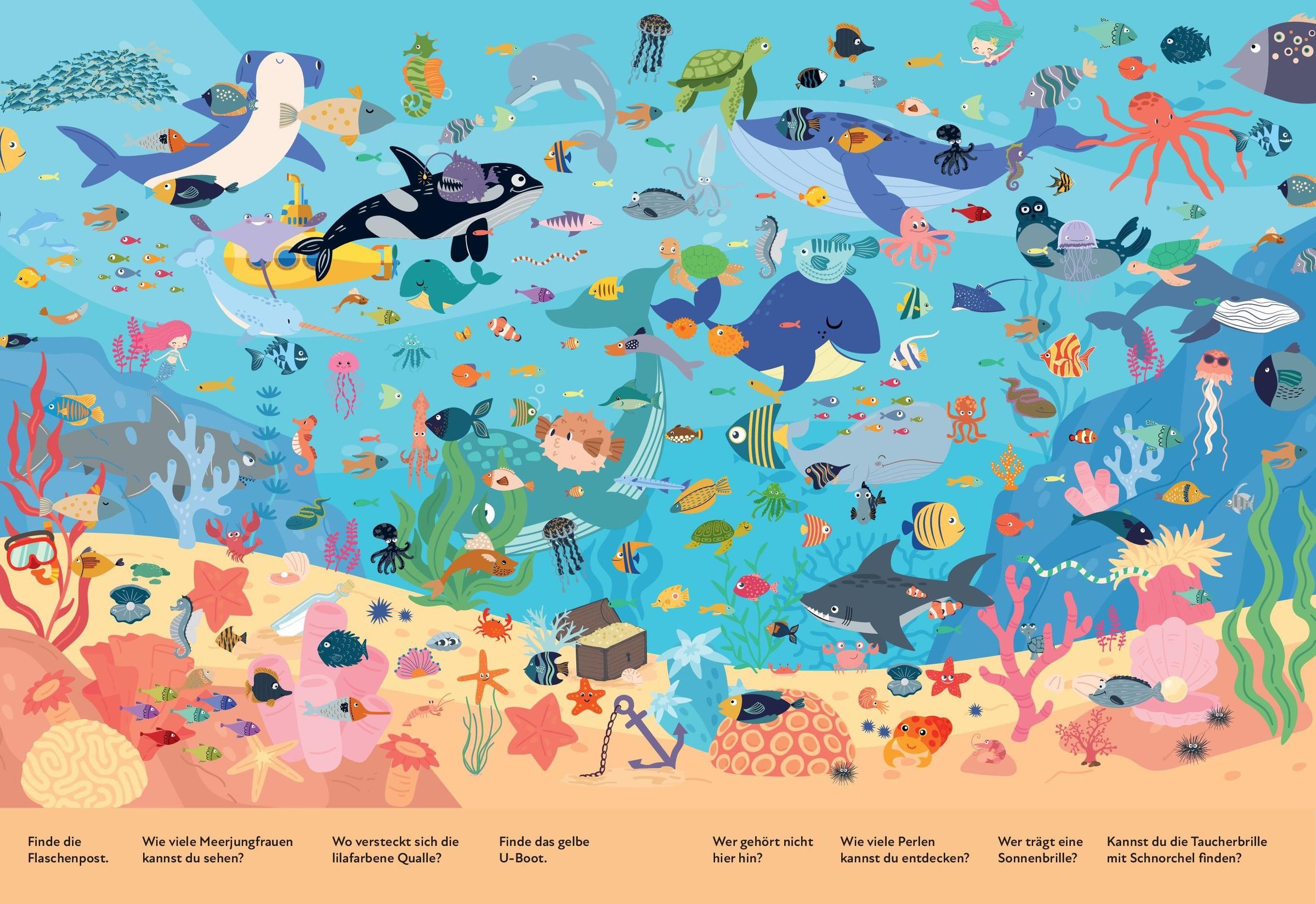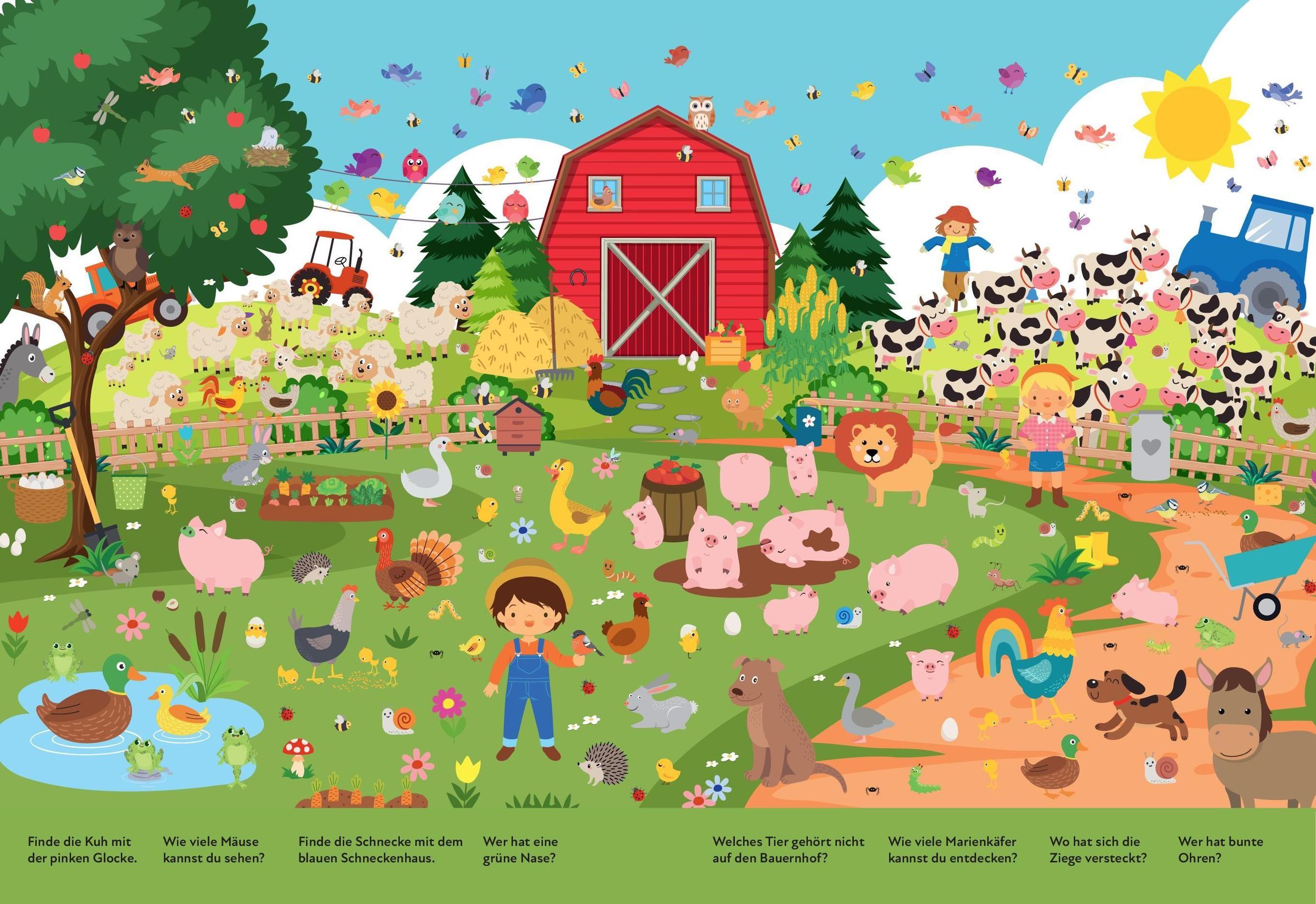 Ob im Dschungel, auf dem Bauernhof, im Wald oder unter Wasser -- auf den extragroßen Wimmelseiten gibt es jede Menge zu entdecken! Findest du den Affen mit dem Hut? Wie viele Krokodile kannst du zählen? Wo sitzt der Tukan mit dem blauen Schnabel? Löse die lustigen Such- und Zählaufgaben und denke dir anschließend weitere Suchrätsel aus.