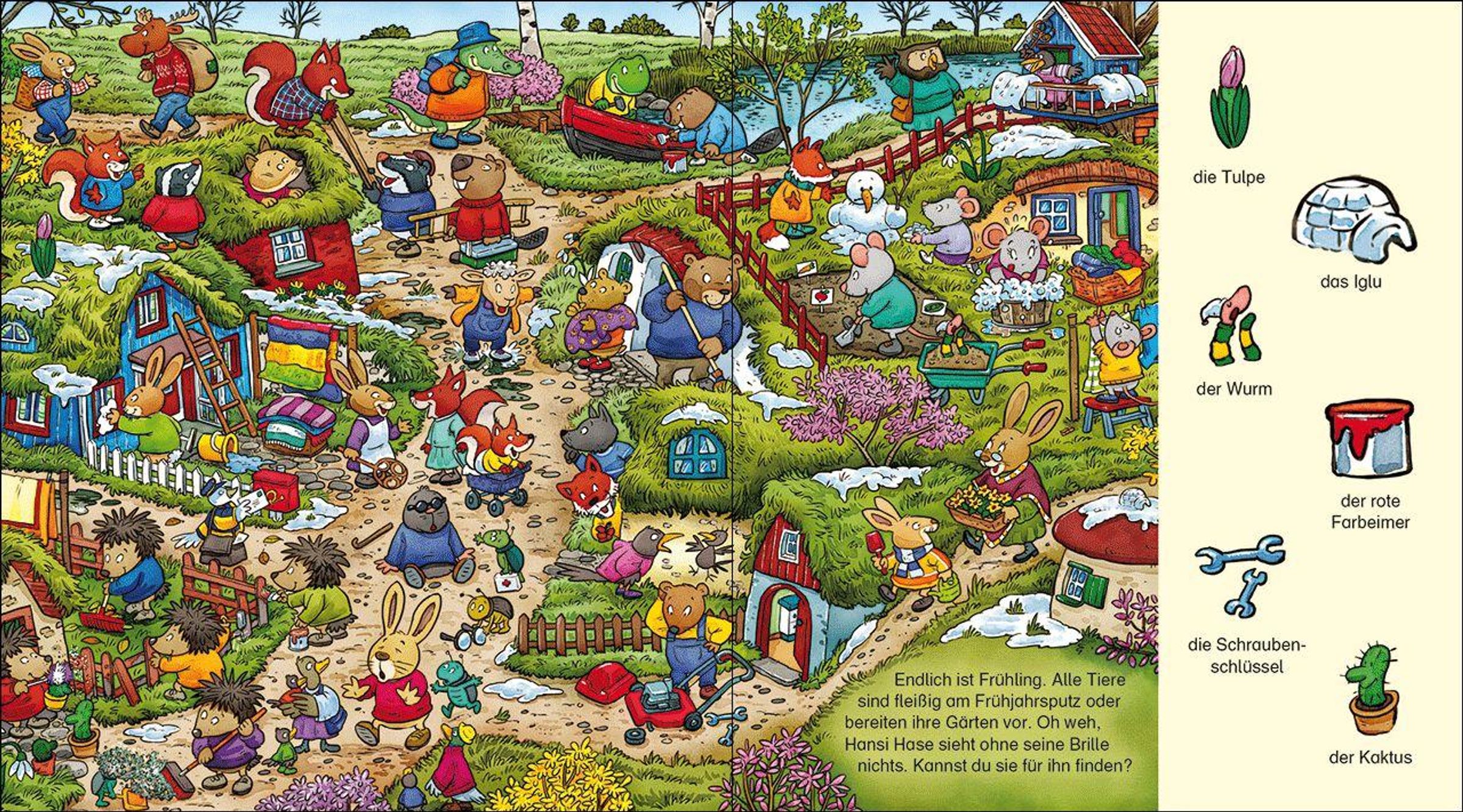 Titel: "Meine allererste OsterWimmelWelt". Illustration mit Tieren, die Ostereier in einem bunten Frühlingsgarten suchen., Buch