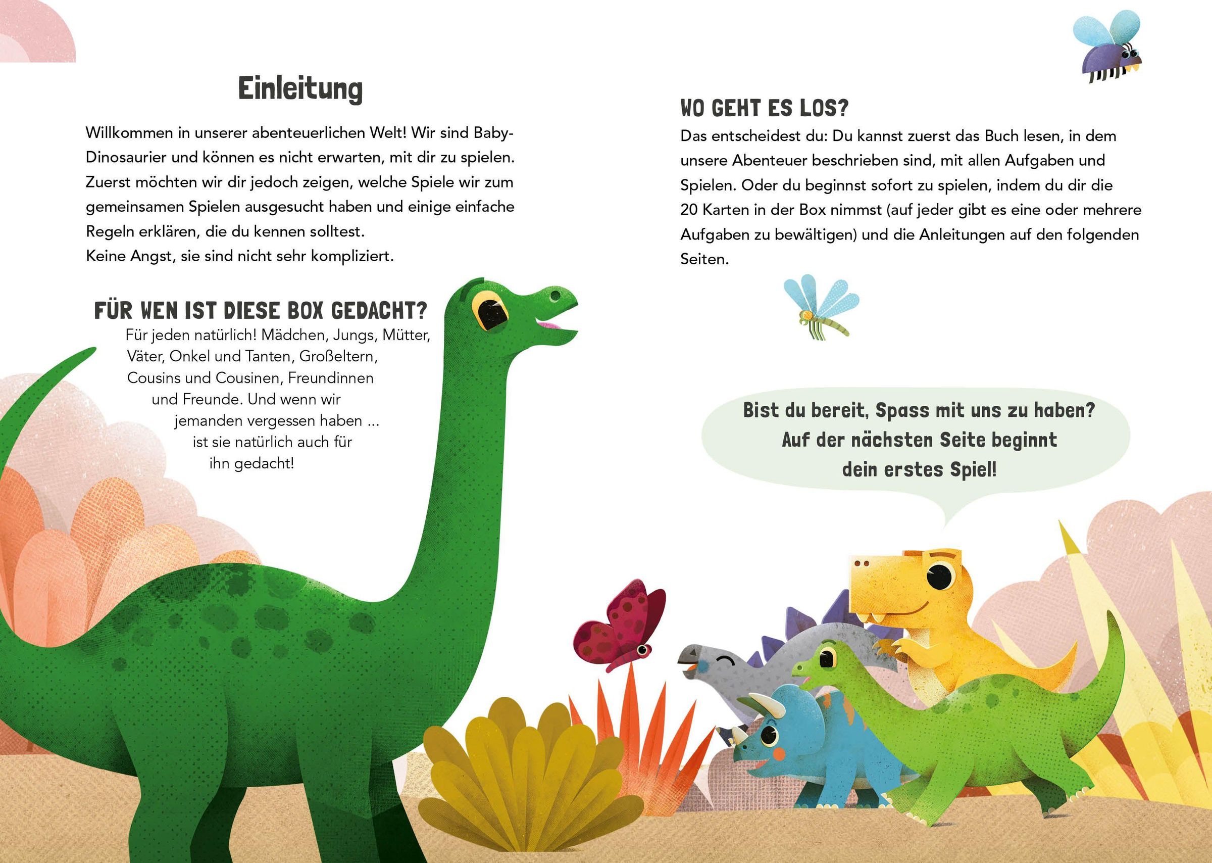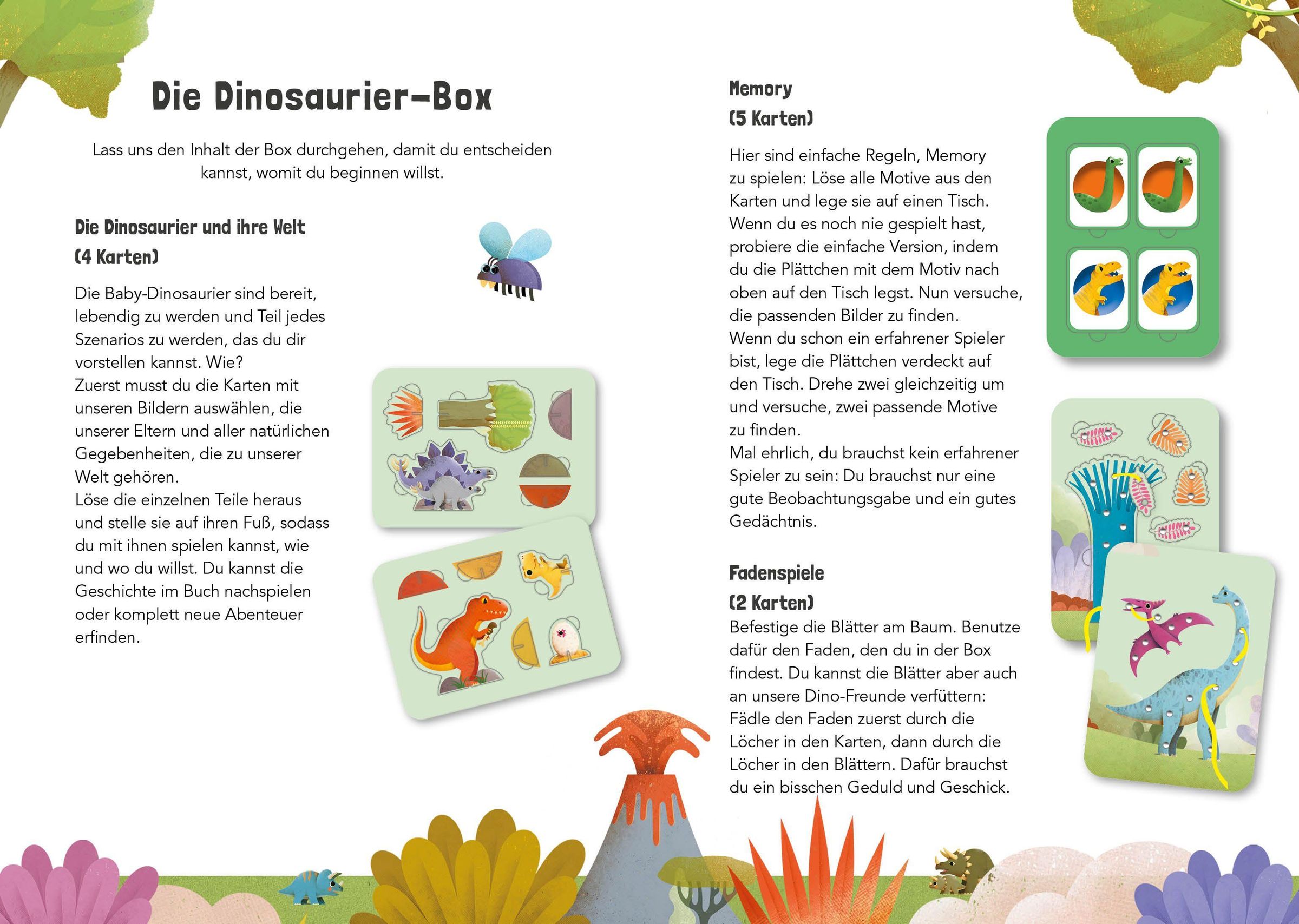 Dieses kunterbunte Reiseset verwandelt jeden Moment in ein prähistorisches Abenteuer! Meine ersten Dino-Abenteuer ist der perfekte Begleiter für neugierige Kinder ab 4 Jahren: ein Pappbilderbuch mit illustrierter Dino-Geschichte, 20 Spieltafeln mit Such-, Memo- und Dominospielen sowie vorgestanzte Dinosaurier, die sich herauslösen und zu 3D-Freunden auf Standfüße stecken lassen. Das Set enthält außerdem ein Anleitungsheft für Eltern oder ältere Geschwister. Lebendige Illustrationen und langlebige Materialien machen dieses Set ideal für viele lehrreiche und kreative Spielstunden.