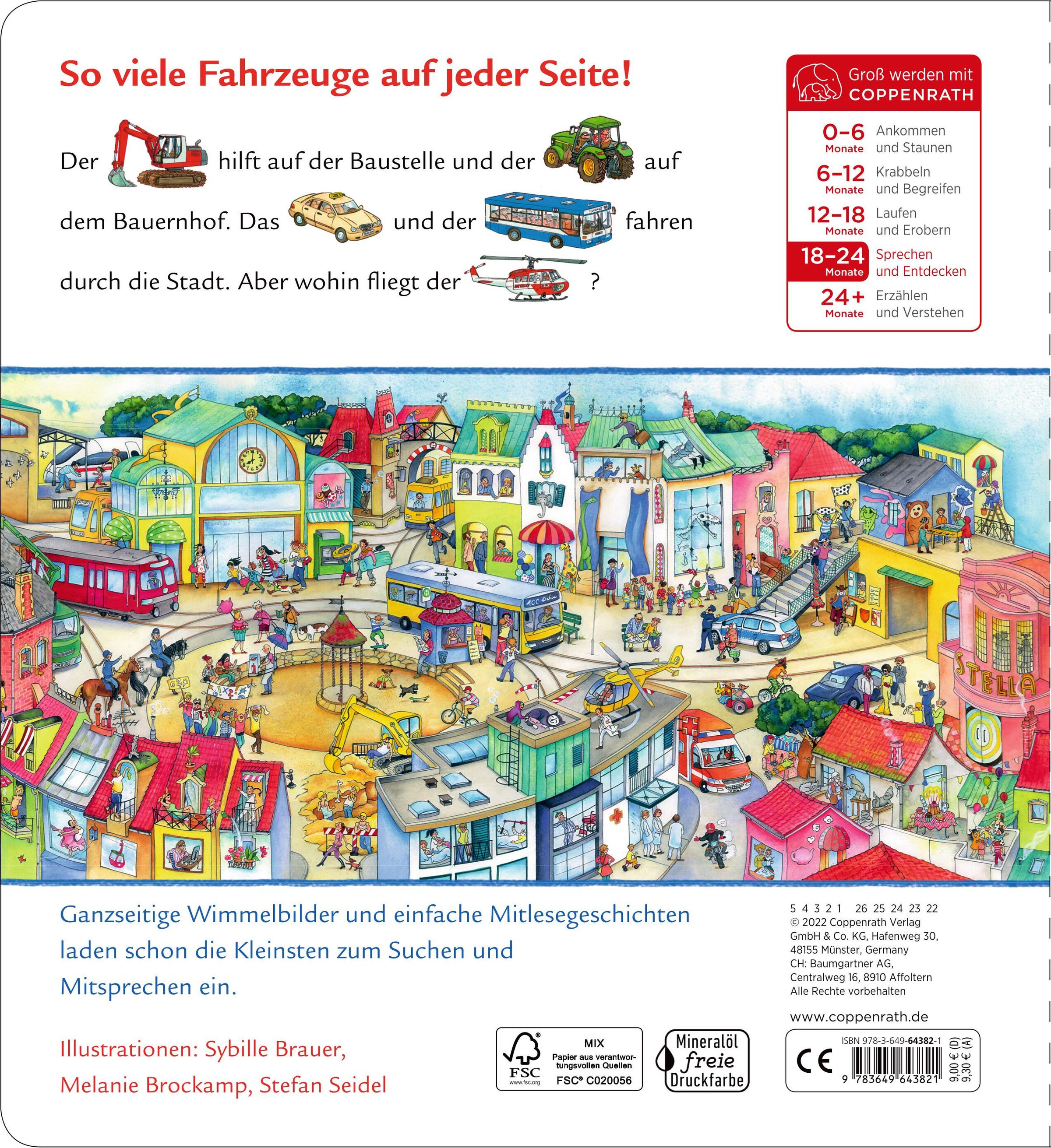 Der Tieflöffelbagger hilft auf der Baustelle und der Trecker auf dem Bauernhof. Das Taxi und der Linienbus fahren durch die Stadt. Aber wohin fliegt der Rettungshubschrauber?