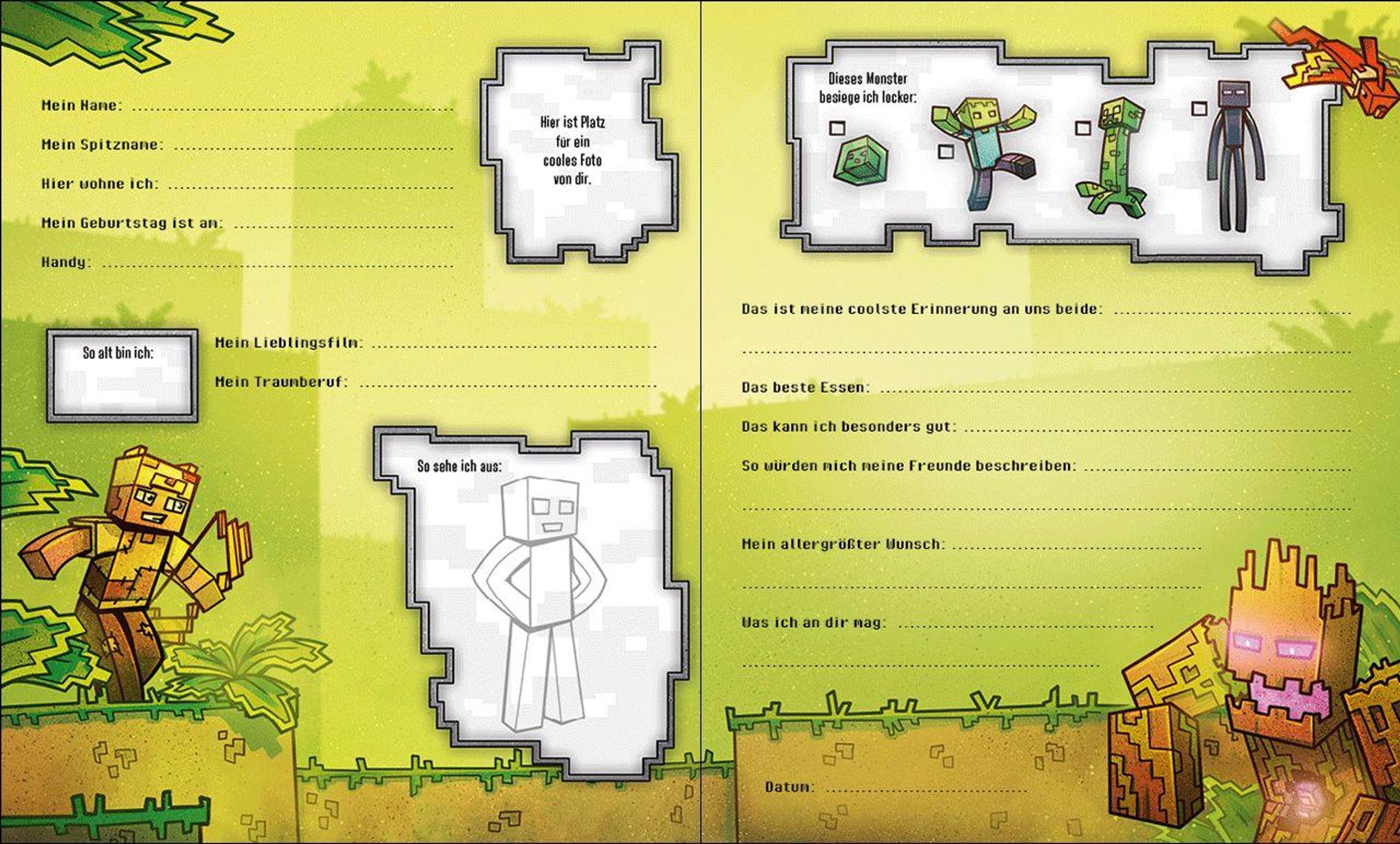 Minecrafter aufgepasst! Dieses Freundebuch mit Eintragseiten zu deinem Lieblings-Game bietet viel Platz für alle deine Schulfreund*innen. Hier können sie ein Foto von sich einkleben, ankreuzen, welches Minecraft-Monster sie auf jeden Fall besiegen, und ihren Traumberuf oder ihren allergrößten Wunsch eintragen. So bleiben Freundinnen und Freunde aus der Schulzeit in ganz besonderer Erinnerung.