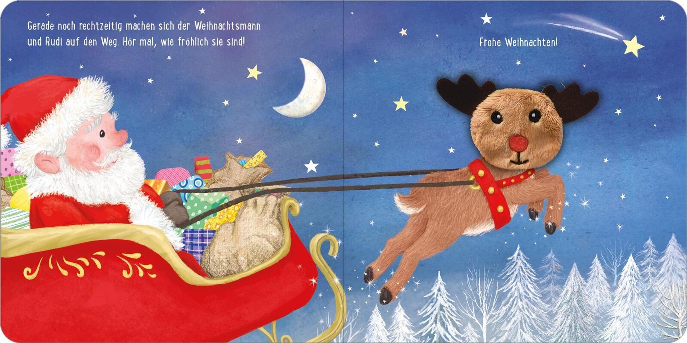 Rudi, das kleine Rentier, läuft freudig durch den Wald. Das Weihnachtsfest steht nämlich vor der Tür - Zeit, zusammen mit dem Weihnachtsmann die Geschenke auf den Schlitten zu packen und auf die Reise zu den Kindern zu gehen. Aber wo steckt der Weihnachtsmann nur?